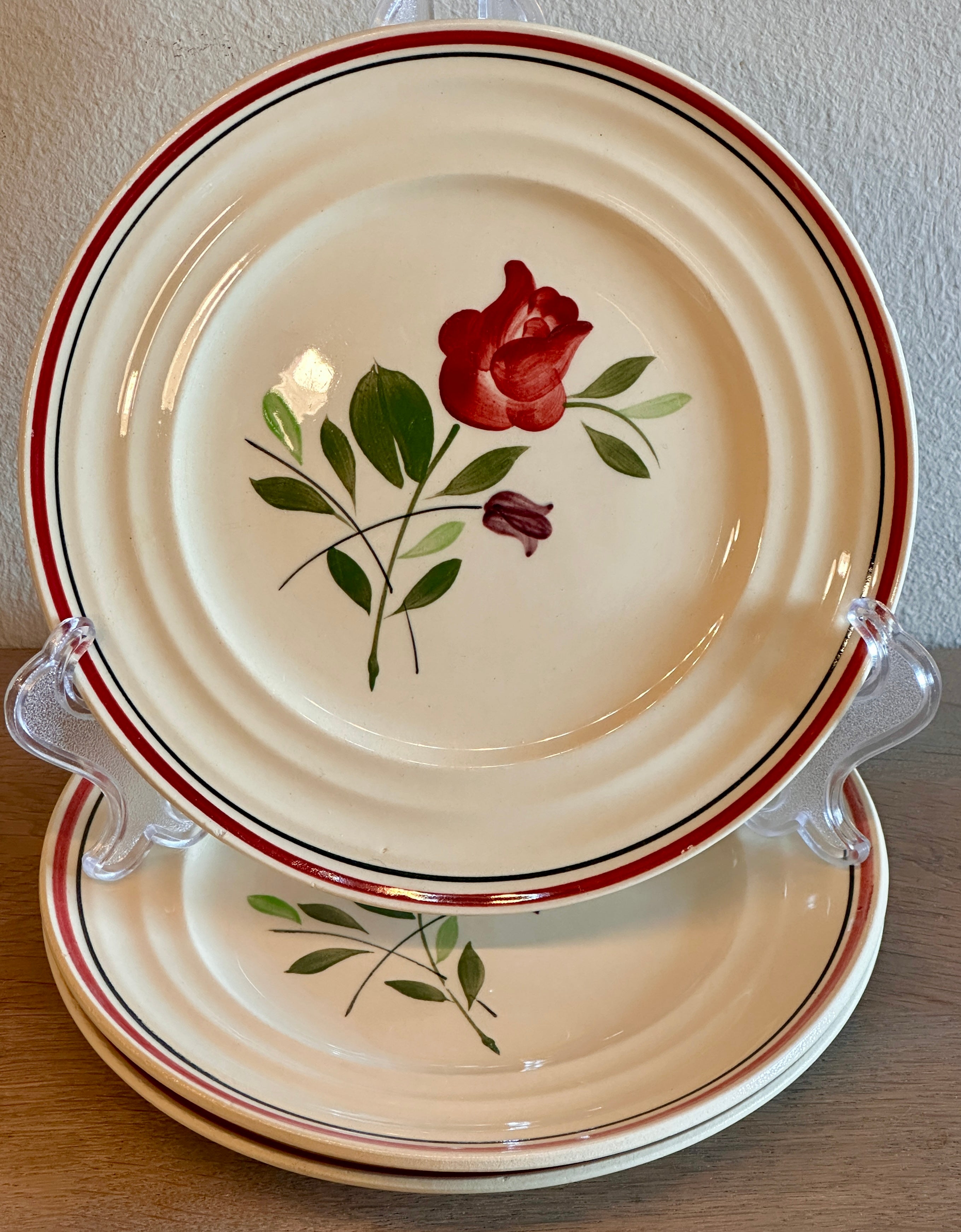Dessertbord / Gebaksbord - Boch - decor van een handgeschilderde roos in donkerrood en kleinere rozenknop in lila/paars - met rode en zwarte bies