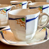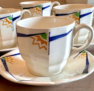 Kop en schotel - Boch B.F.K - vorm BRUXELLES-A-PANS - uitgevoerd met geometrische figuren in blauw, groen, geel-oranje - Art Deco