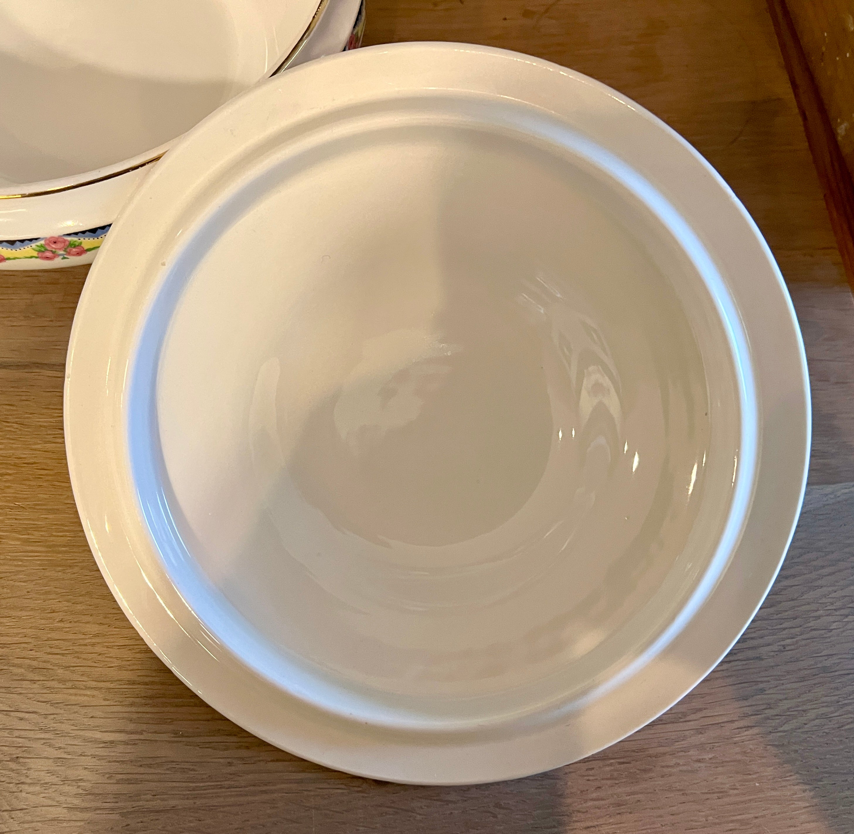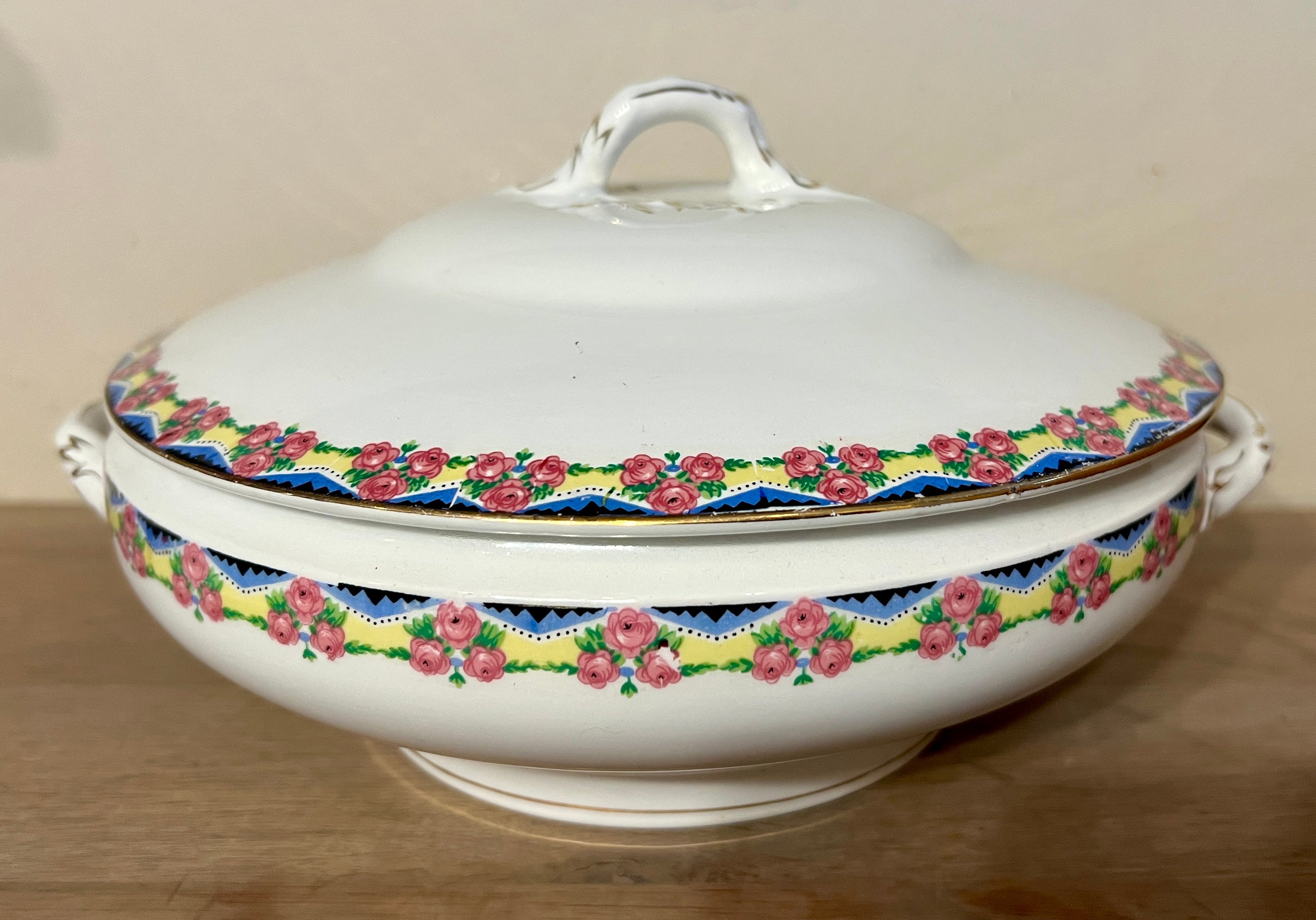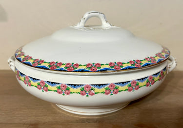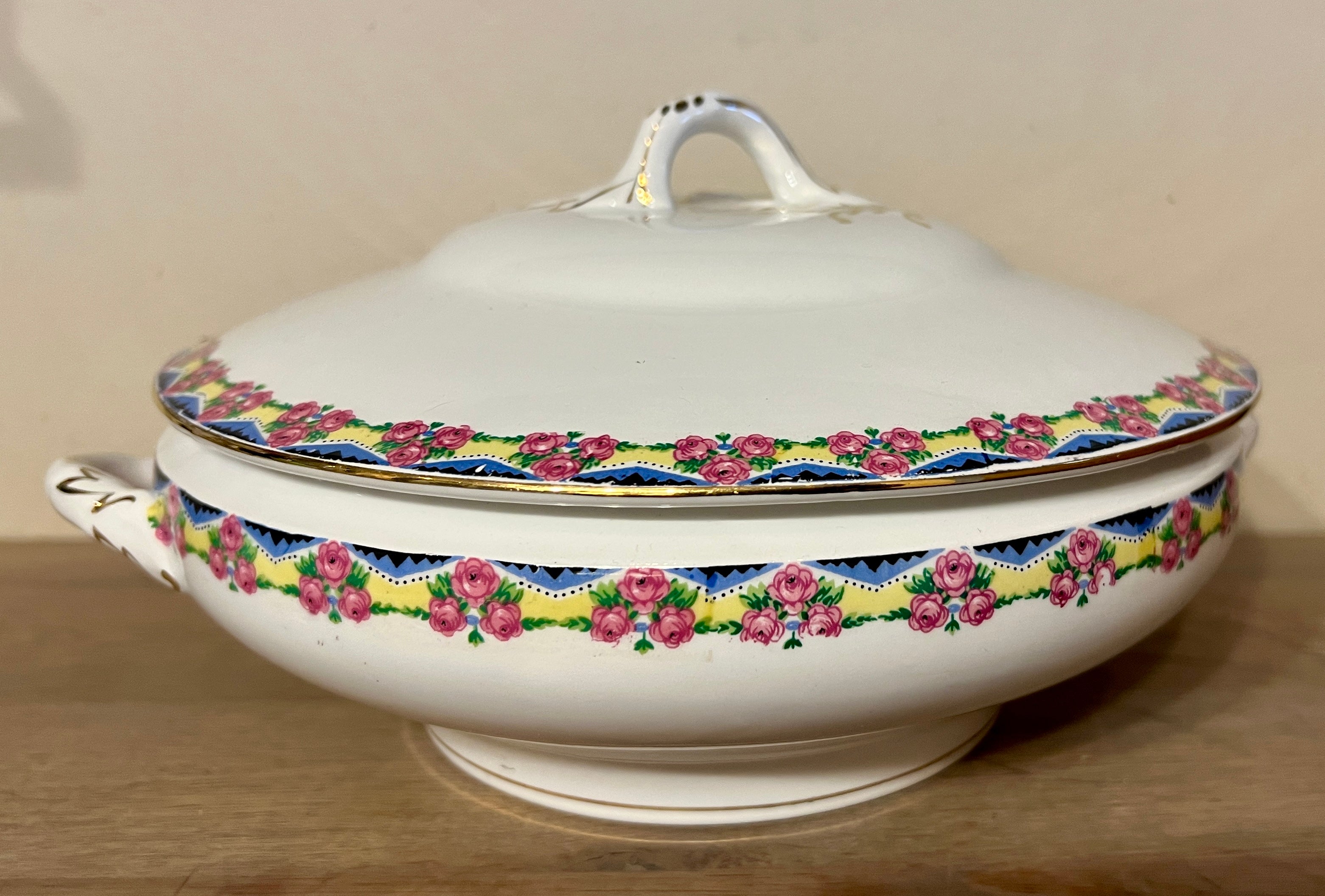Terrine / Dekschaal - laag model - Boch La Louviére - vorm PARIS - décor met roze roosjes en een geel-blauw-groen gekleurde guirlande aan de rand - jaren 1920-1930