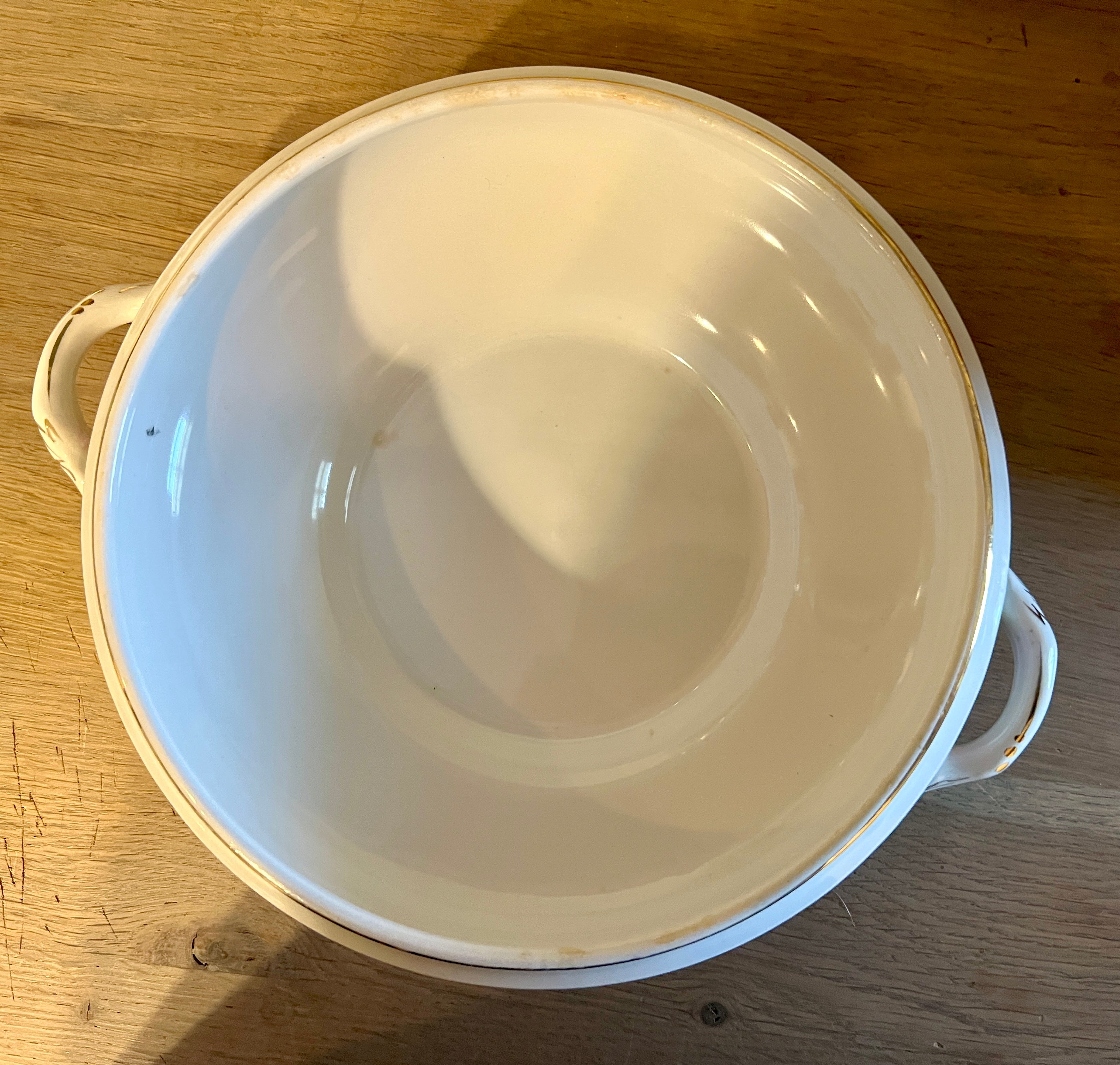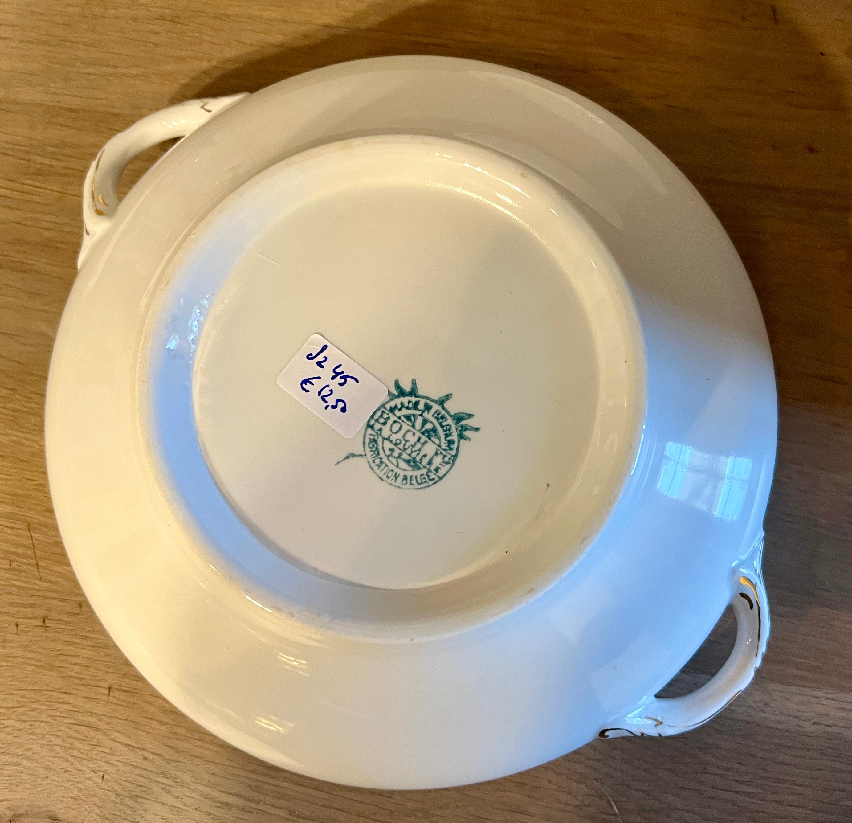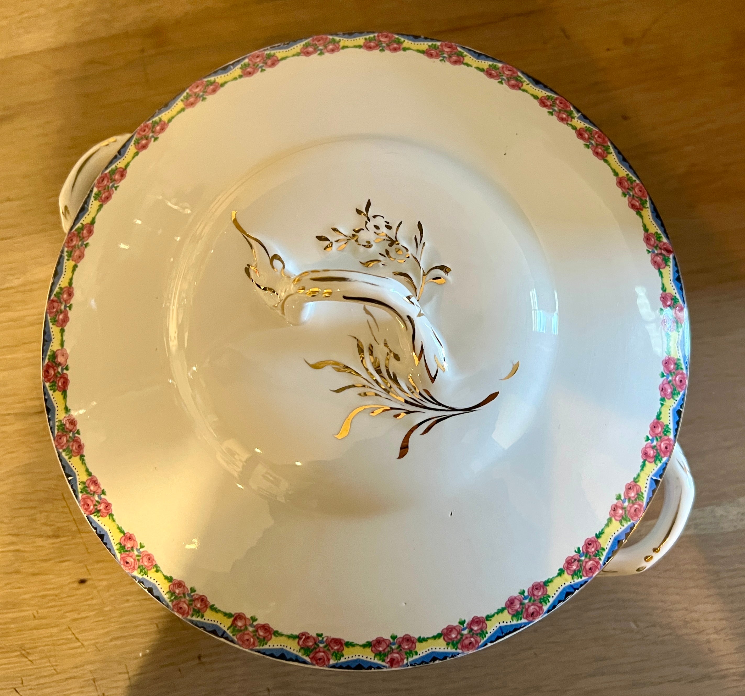 Terrine / Dekschaal - laag model - Boch La Louviére - vorm PARIS - décor met roze roosjes en een geel-blauw-groen gekleurde guirlande aan de rand - jaren 1920-1930