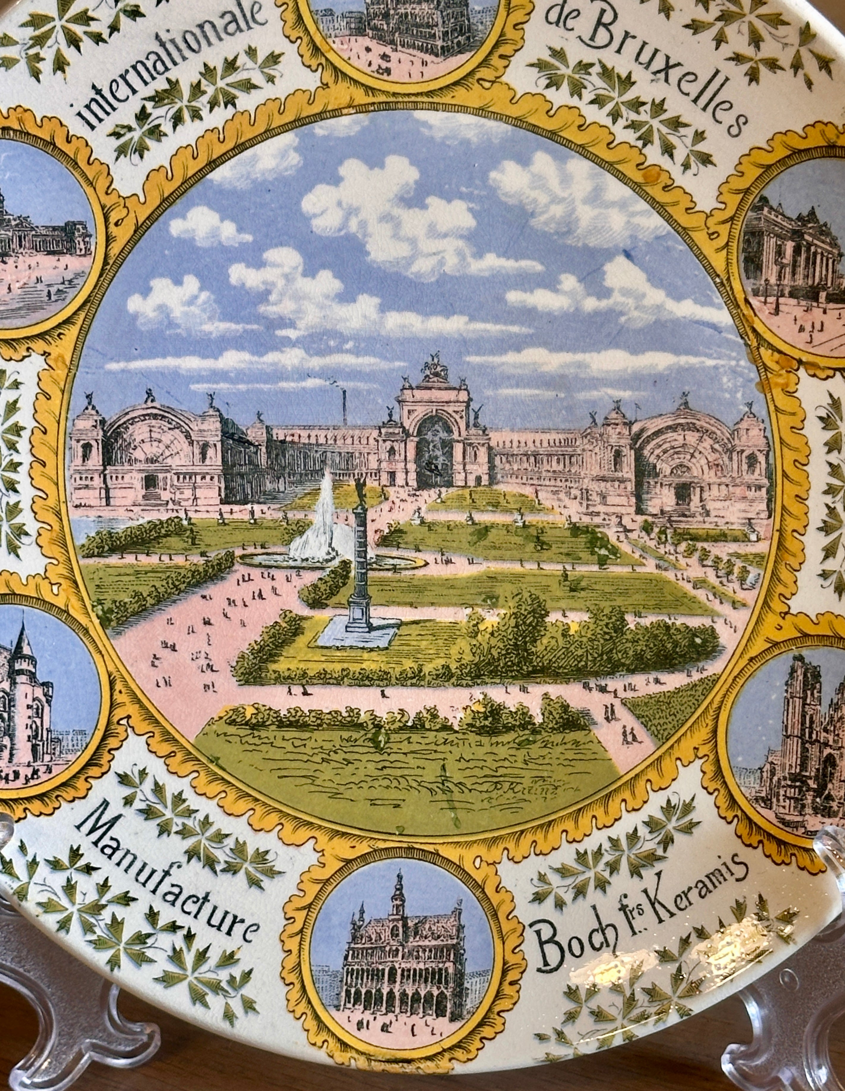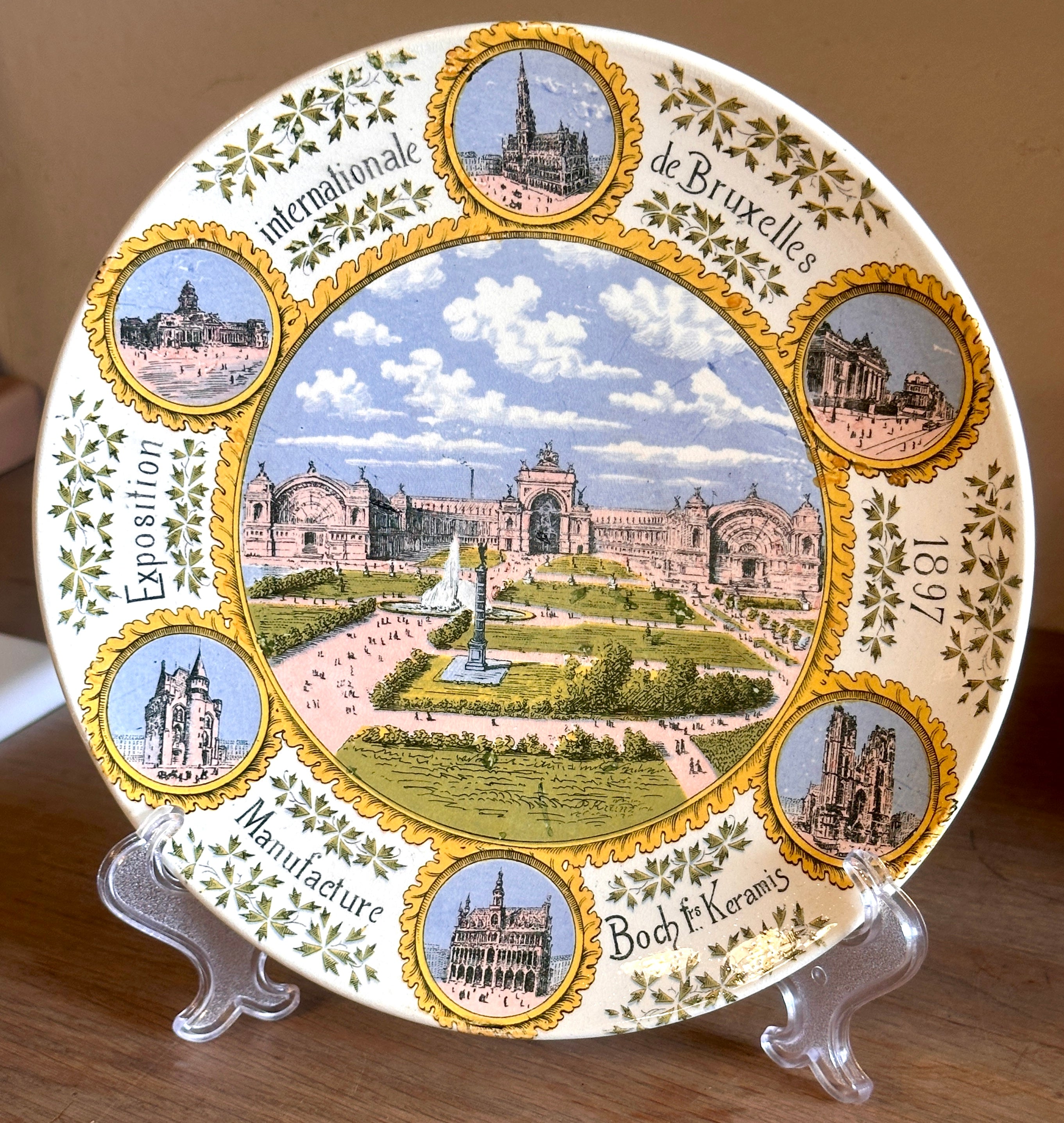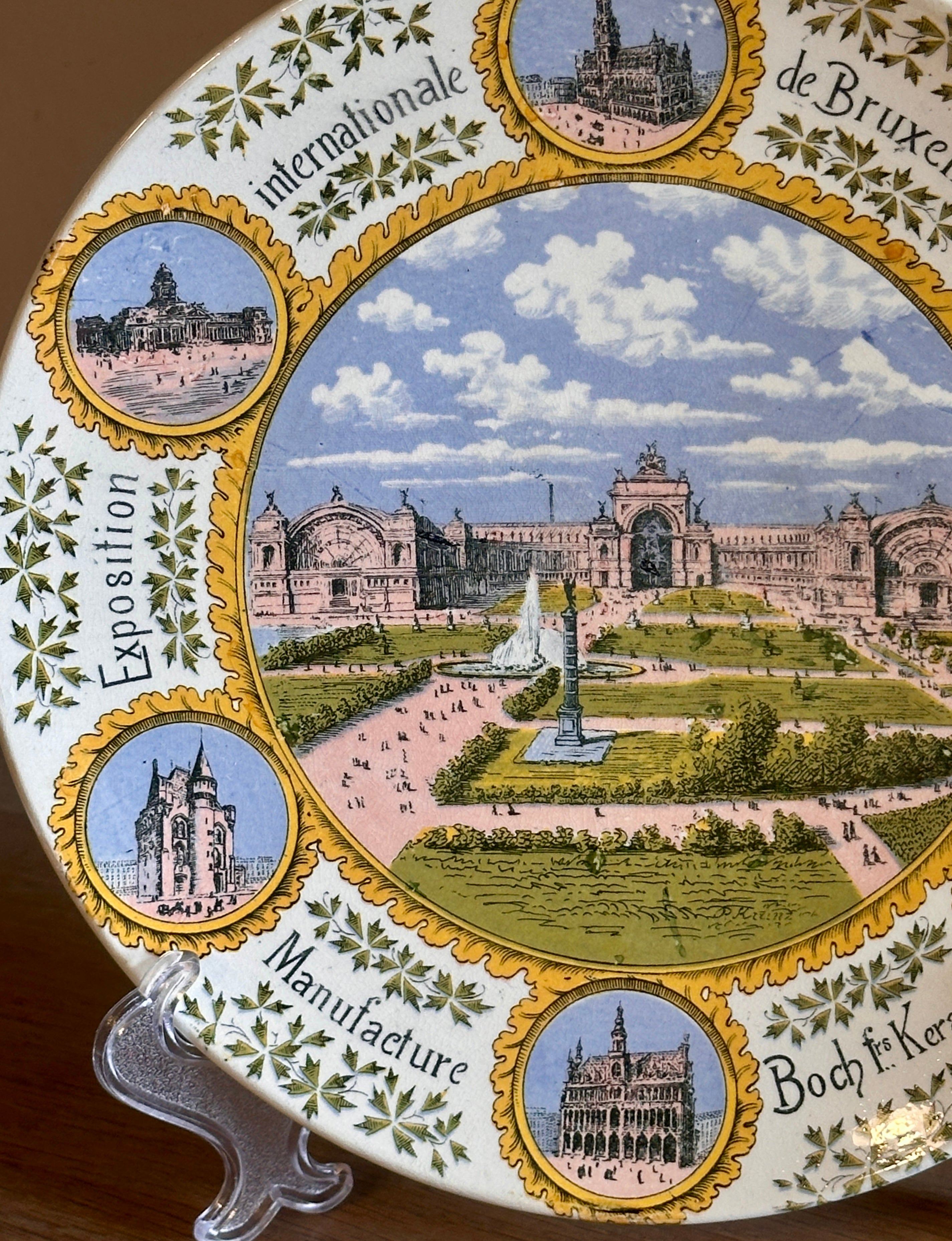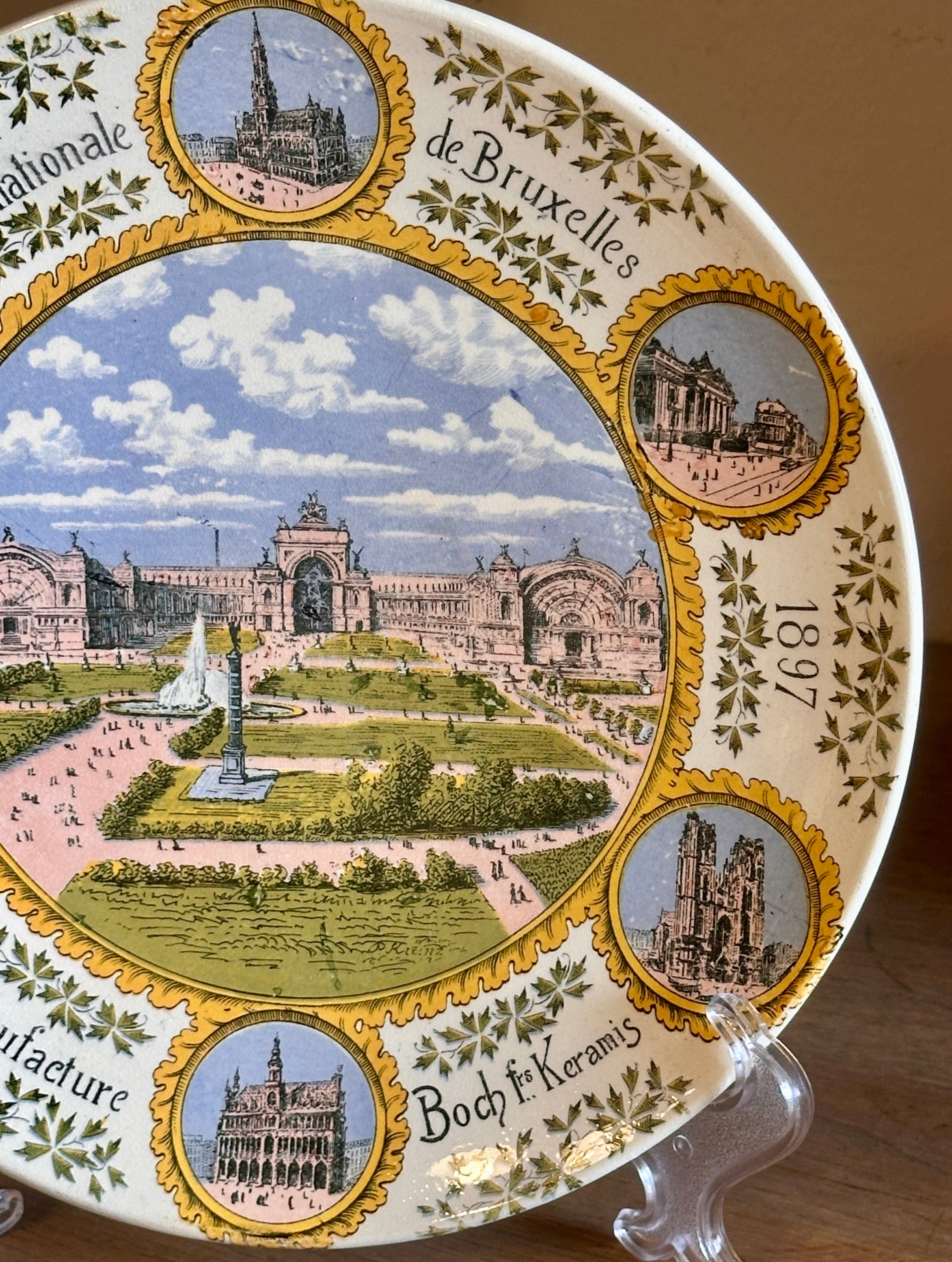 Wandbord / Sierbord - ongemerkt (waarschijnlijk Boch) - met afbeelding van Jubelpark en in de rand verwerkt 6 historische Brusselse bouwwerken - opschrift "Exposition Internationale de Bruxelles" 1897