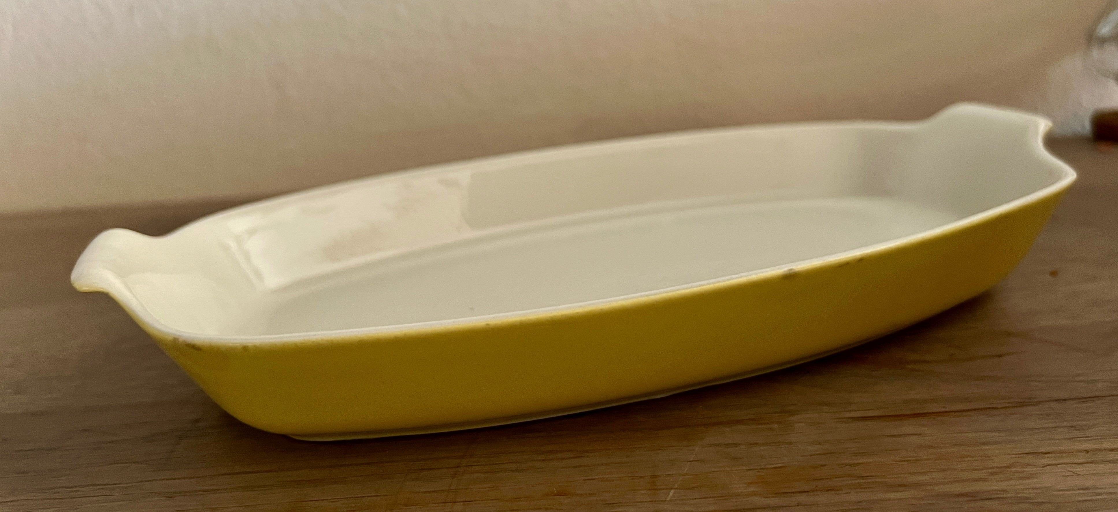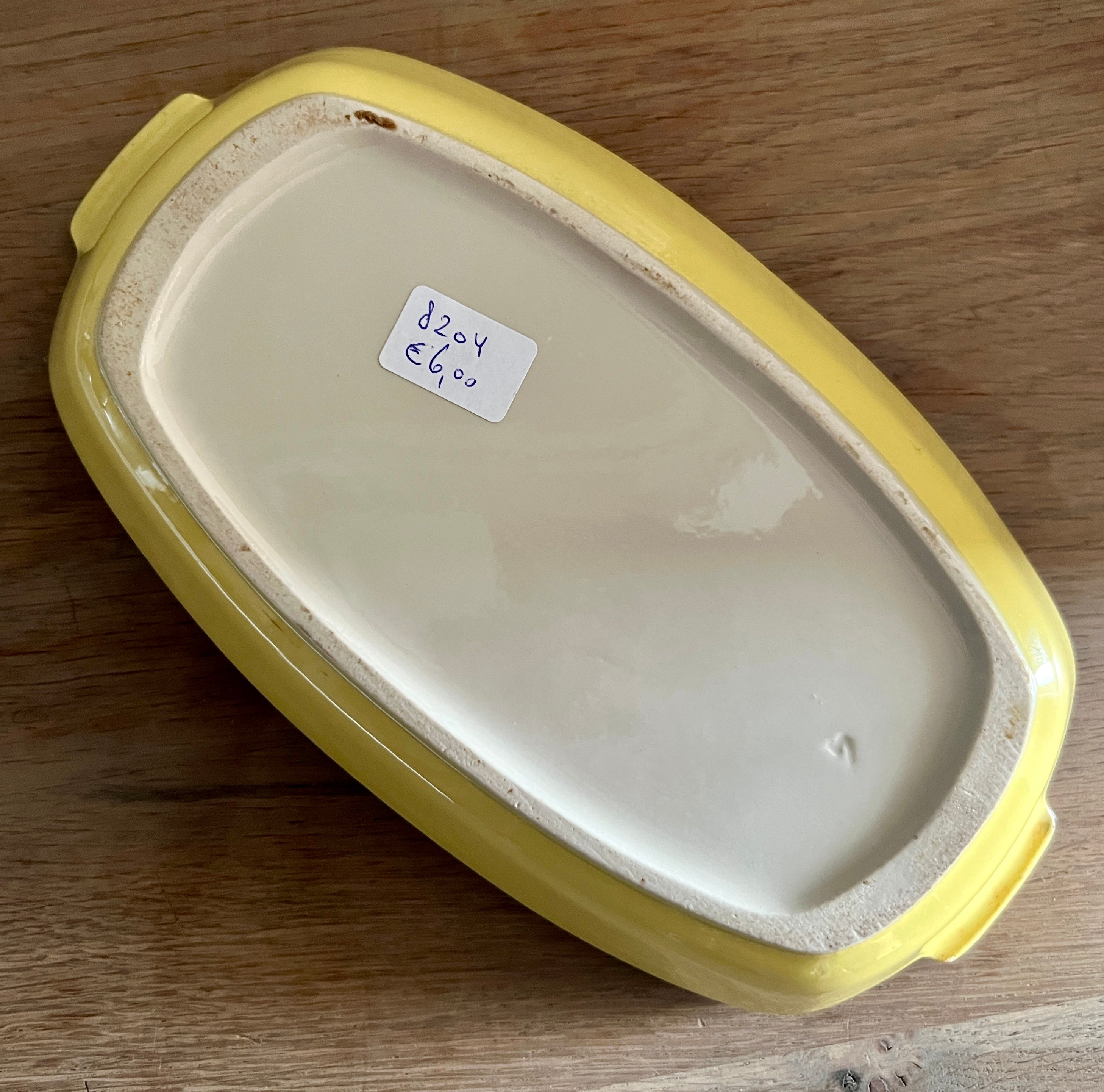 Ovenschaal - klein rechthoekig model - ongemerkt (waarschijnlijk Villeroy & Boch?) - uitgevoerd in geel met crème gekleurde binnenzijde