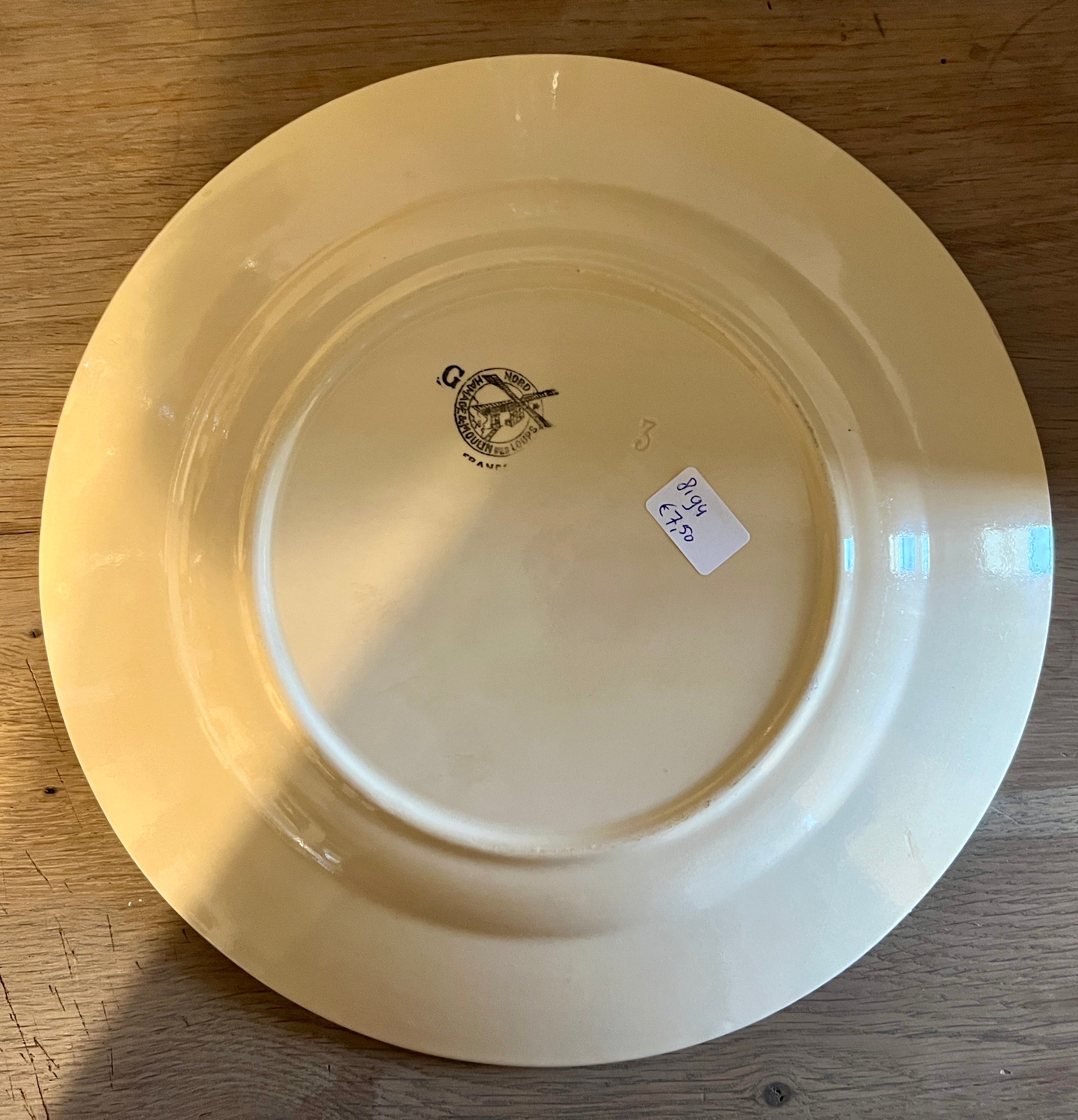 Schaal / Serveerschaal - groter rond model - ongemerkt maar Moulin des Loups - décor met roze roos in blauw/grijze tak op lichtbruin crème gekleurd aardewerk