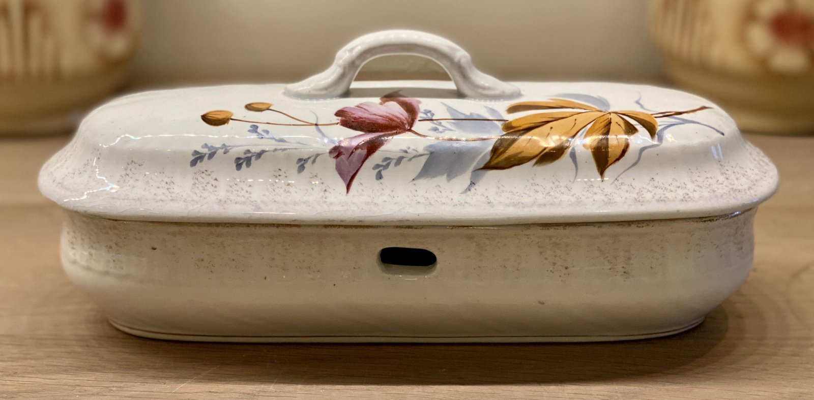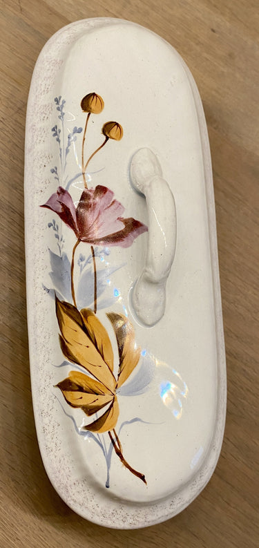 Kammenbakje / borstelbakje - met twee luchtgaten - ongemerkt - met handgeschilderde bloemen in herfstkleuren en goudkleurige gespetterde rand.