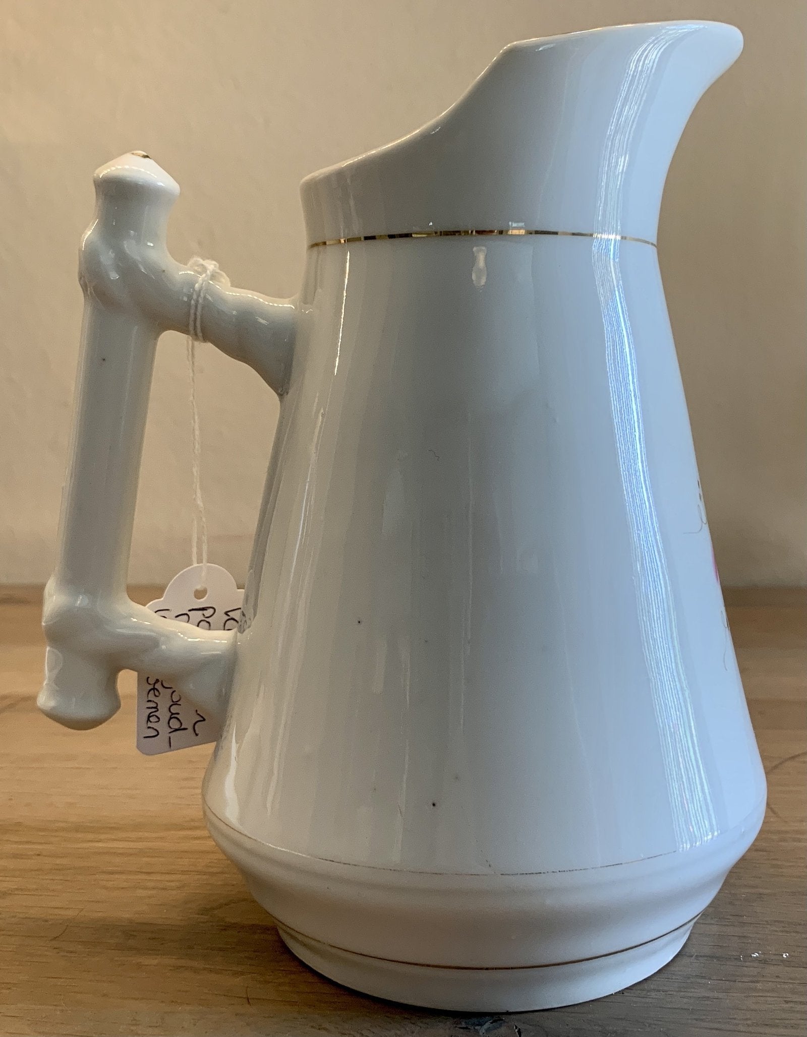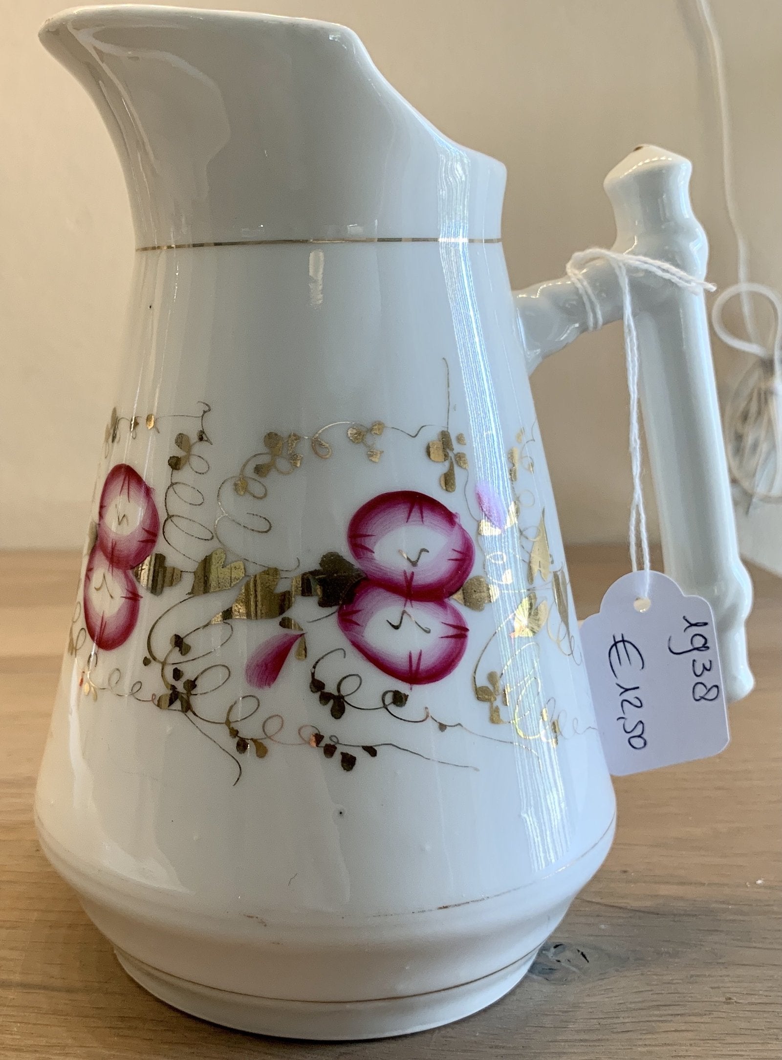 Kannetje - porselein - wit met roze en goudkleurige bloemen en prachtig handvat in touwvorm