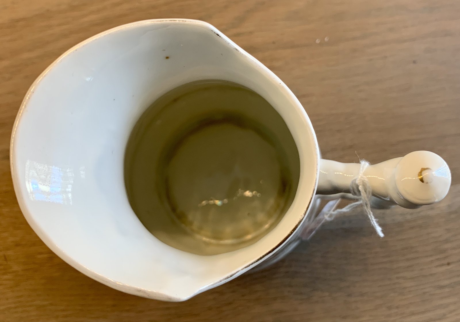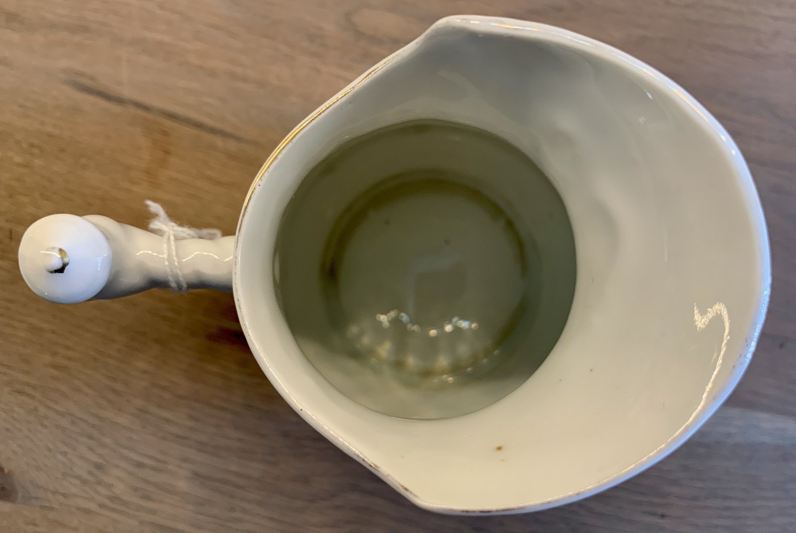 Kannetje - porselein - wit met roze en goudkleurige bloemen en prachtig handvat in touwvorm.