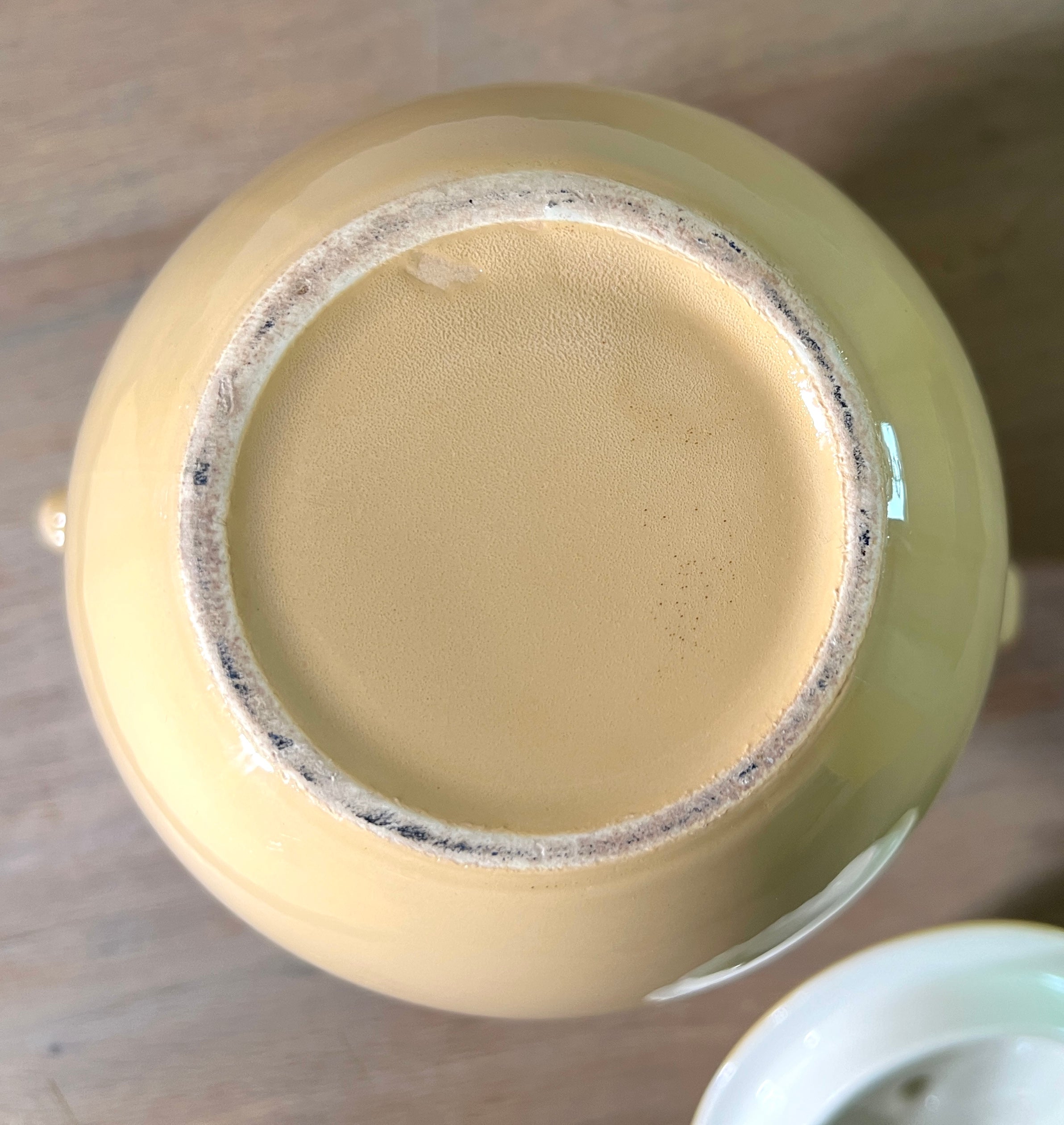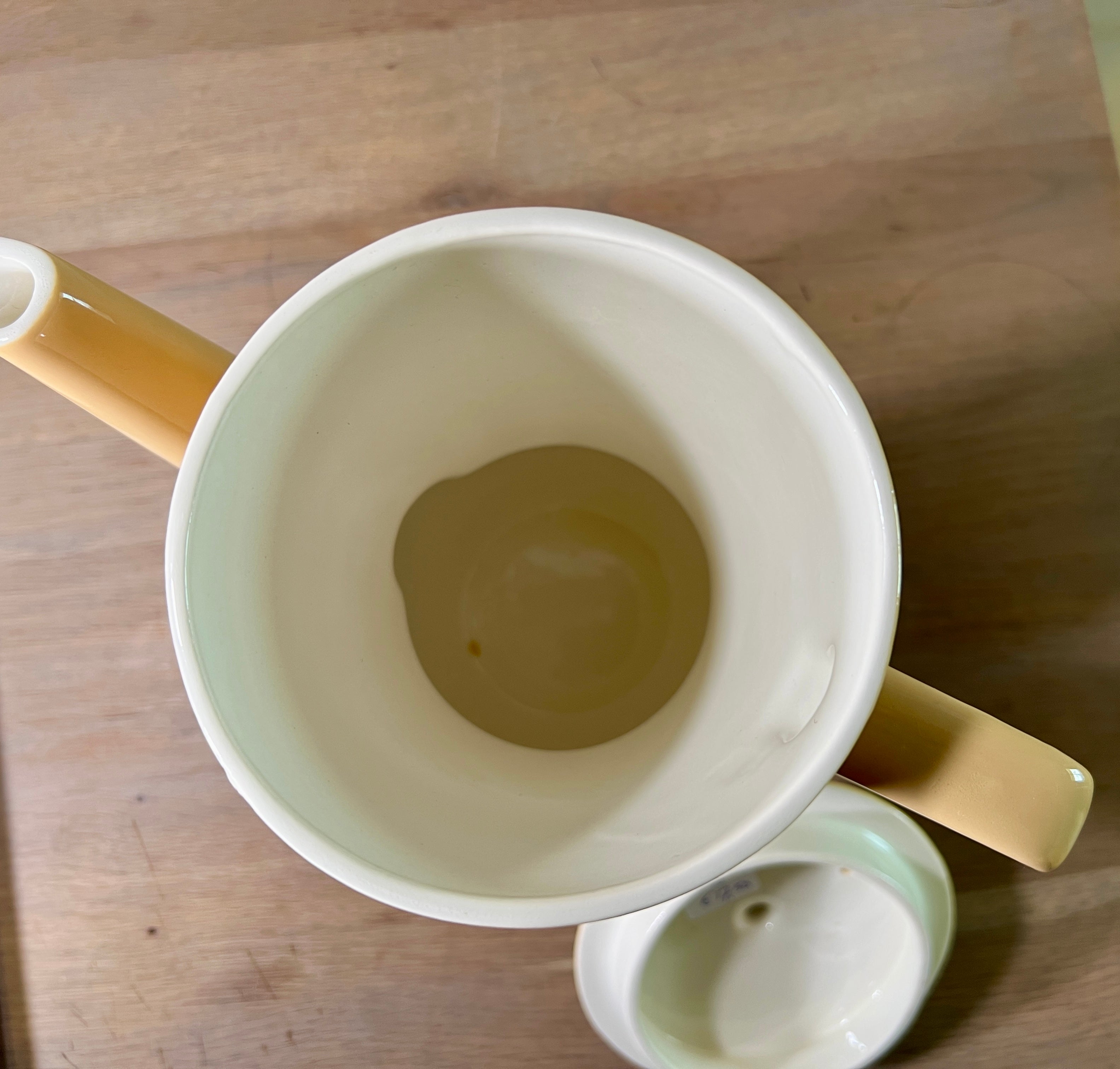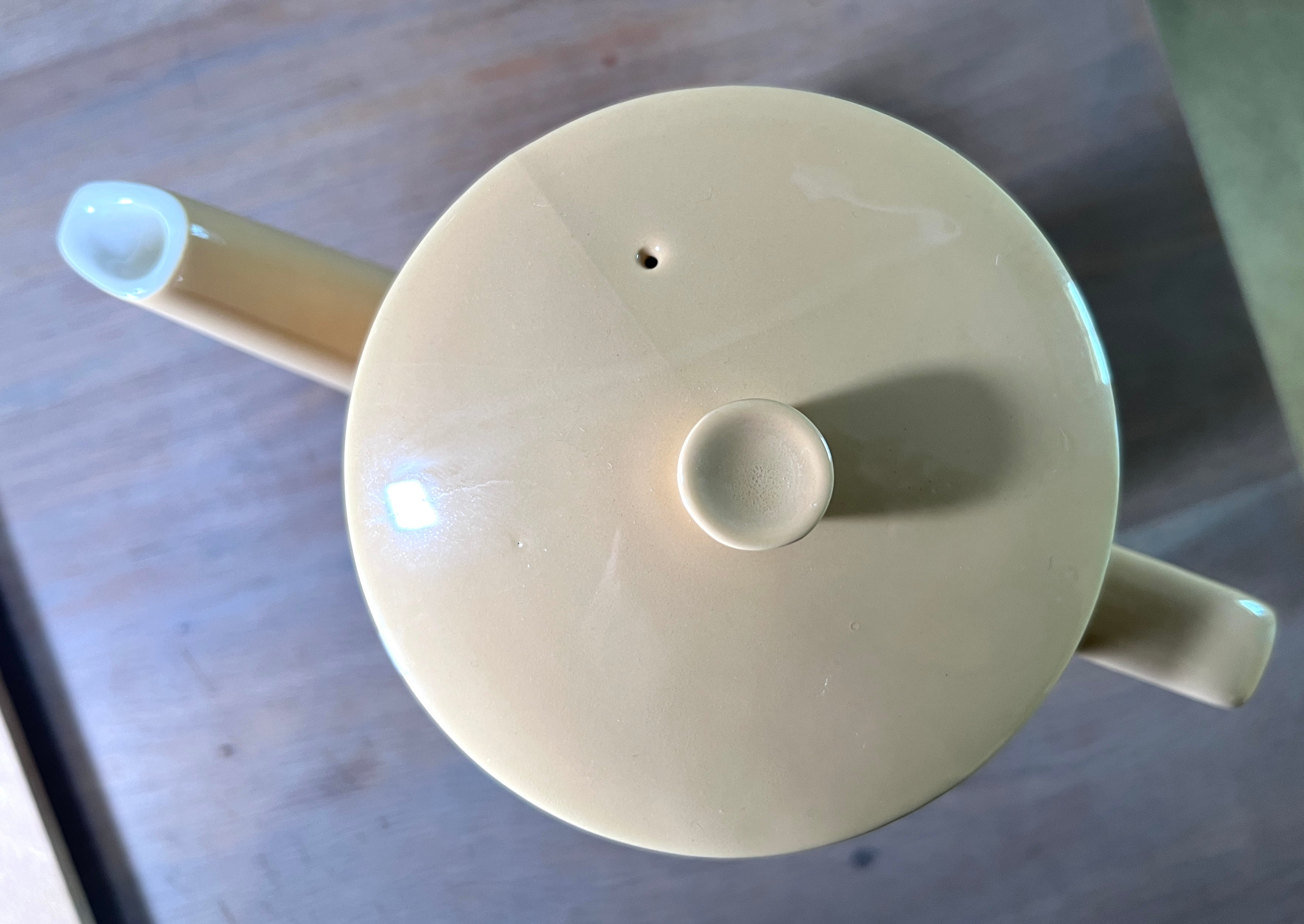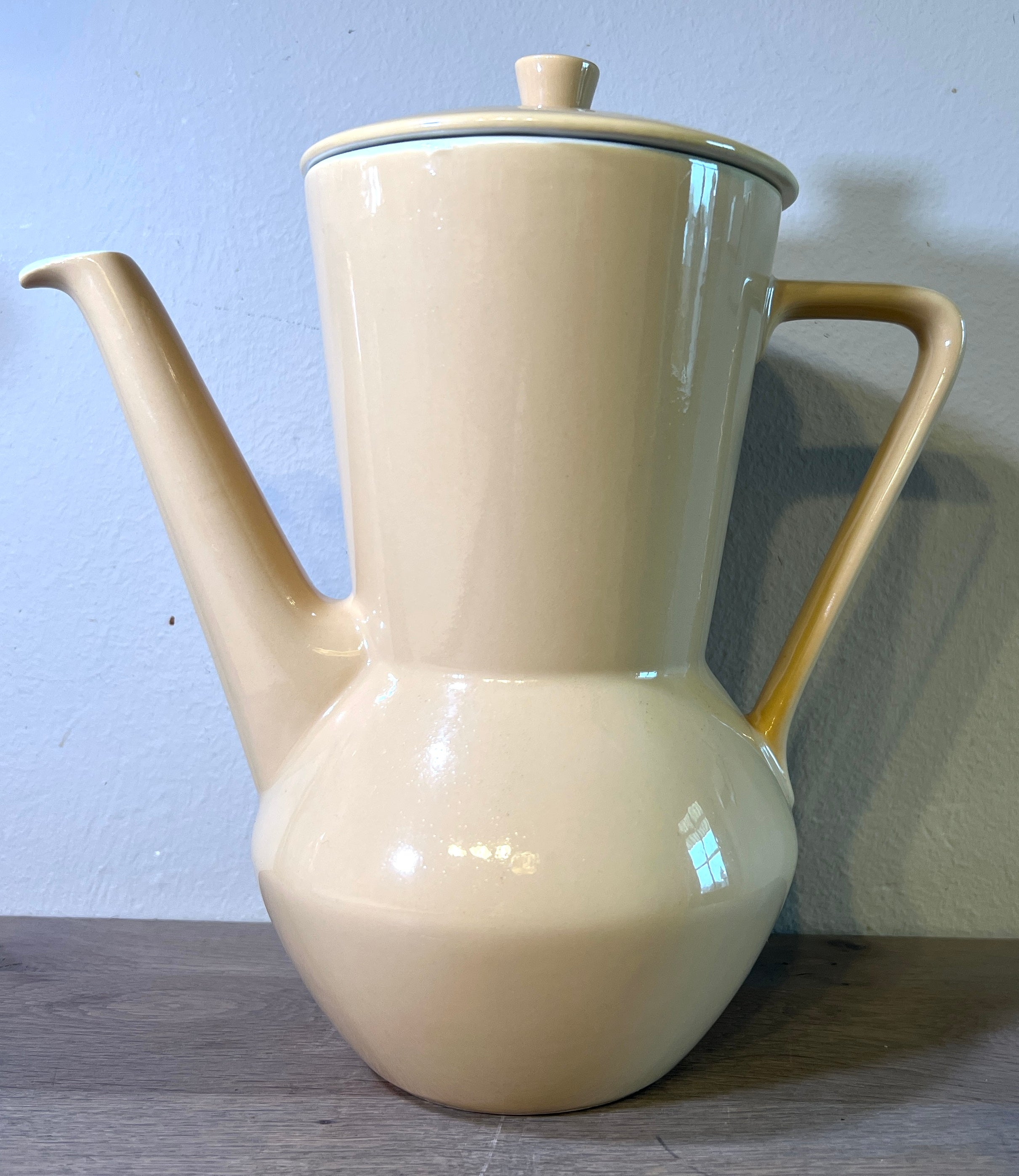 Koffiepot / Theepot - ongemerkt - uitgevoerd in lichtbruine kleur aardewerk - bollere onderzijde met hoger, wijd uitlopend, bovendeel
