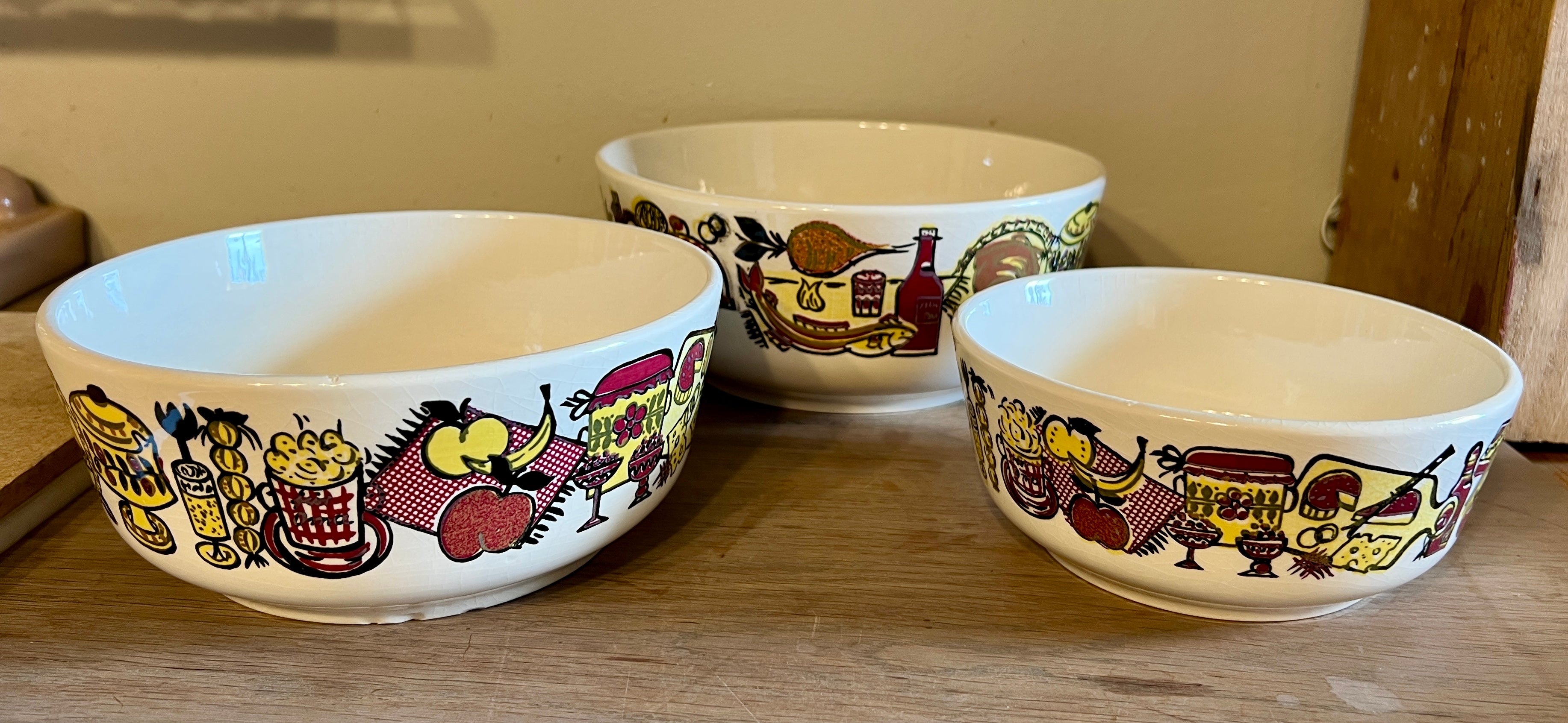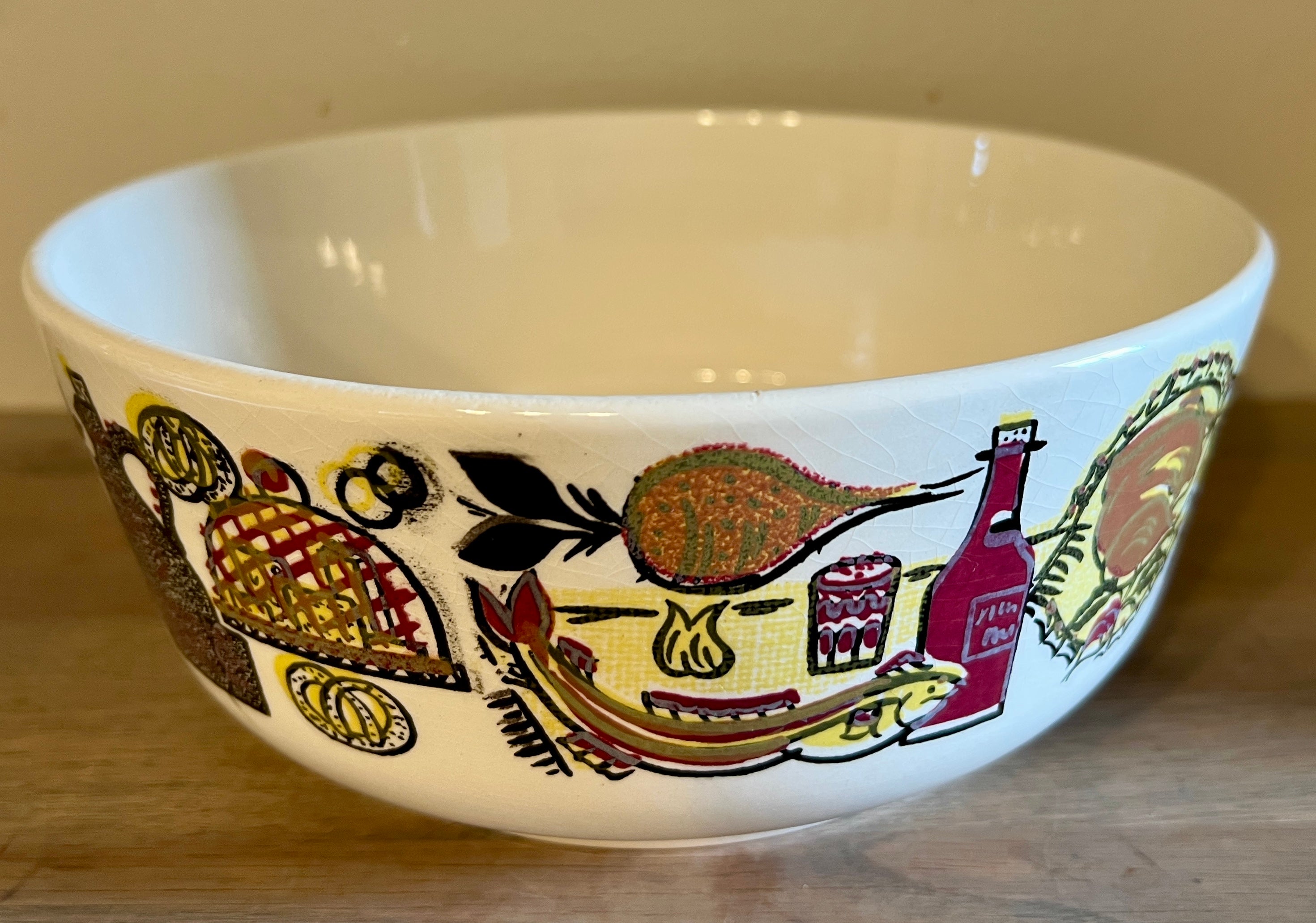 Nestschaal - ongemerkt - 1960-1970s - groter model - decoratie van fruit en etenswaren in bruin en geel