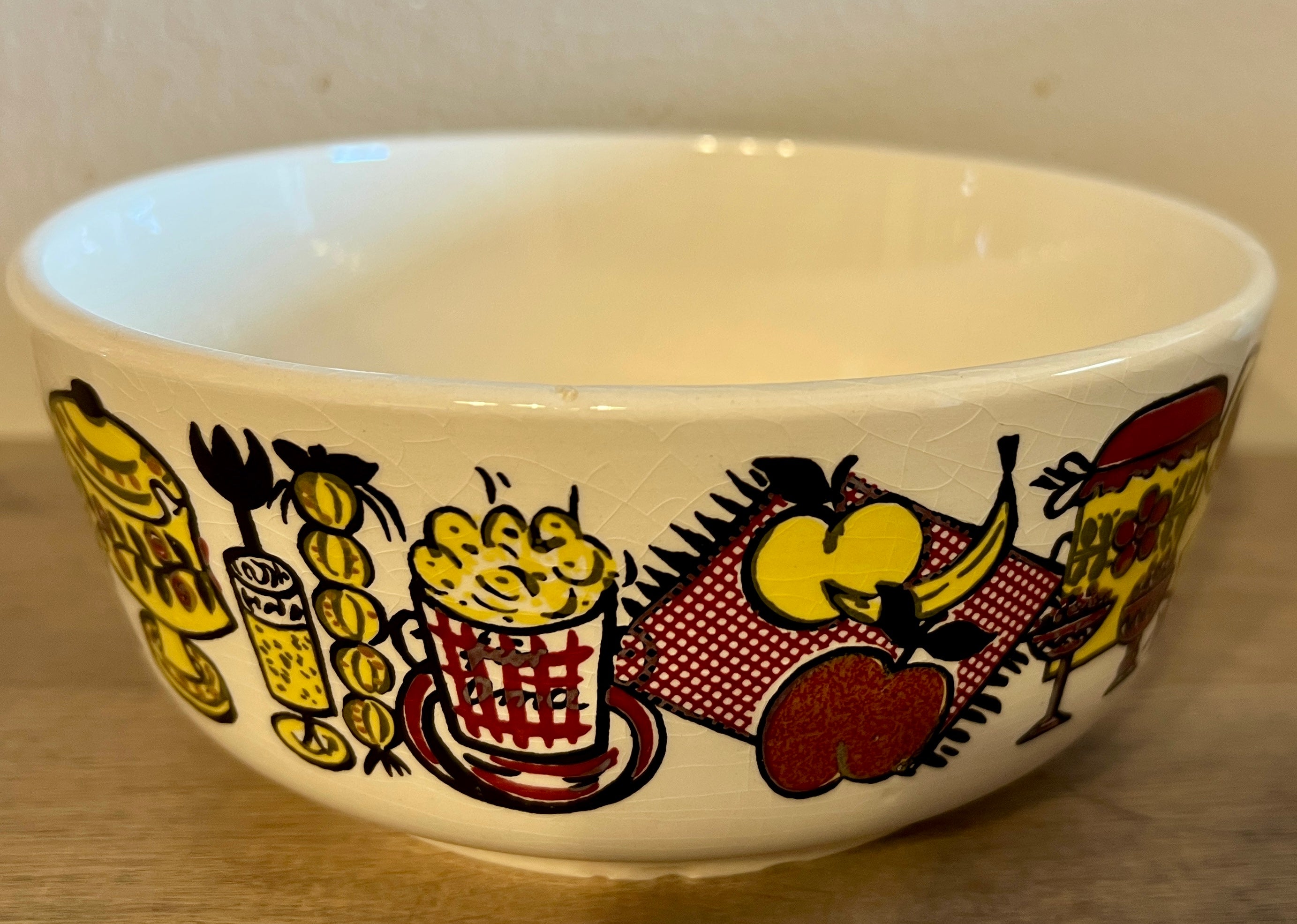 Nestschaal - ongemerkt - 1960-1970s - middelgroot model - decoratie van fruit en etenswaren in bruin en geel