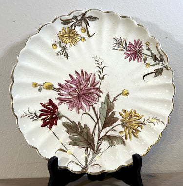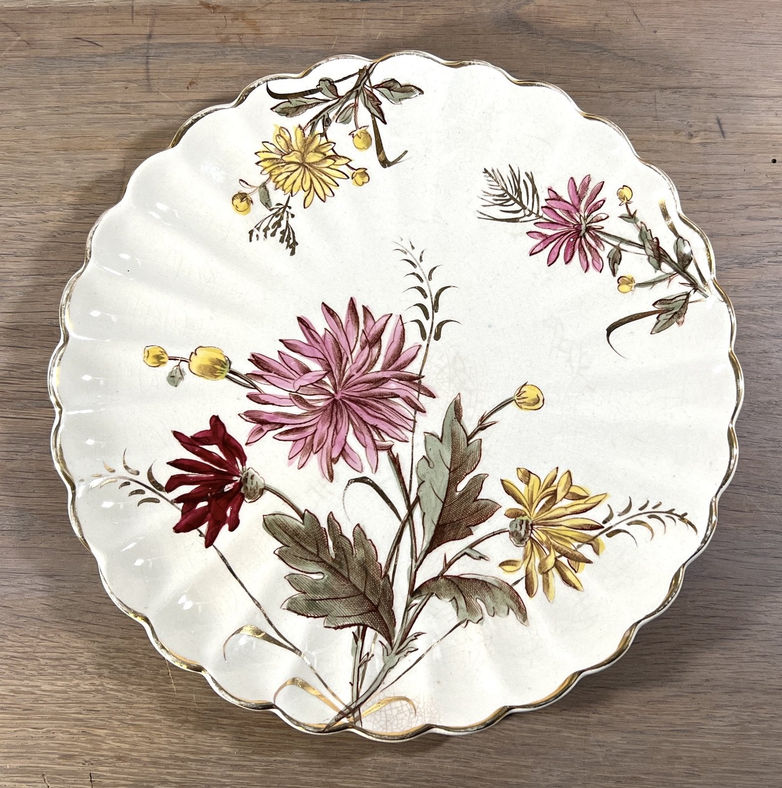 Ontbijtbord / Dessertbord - ongemerkt maar waarschijnlijk Engels: Allman & Broughton & Co Meg Merriles - décor met afbeelding van chrysanten in geel en roze - met gegolfde en goudkleurige rand.