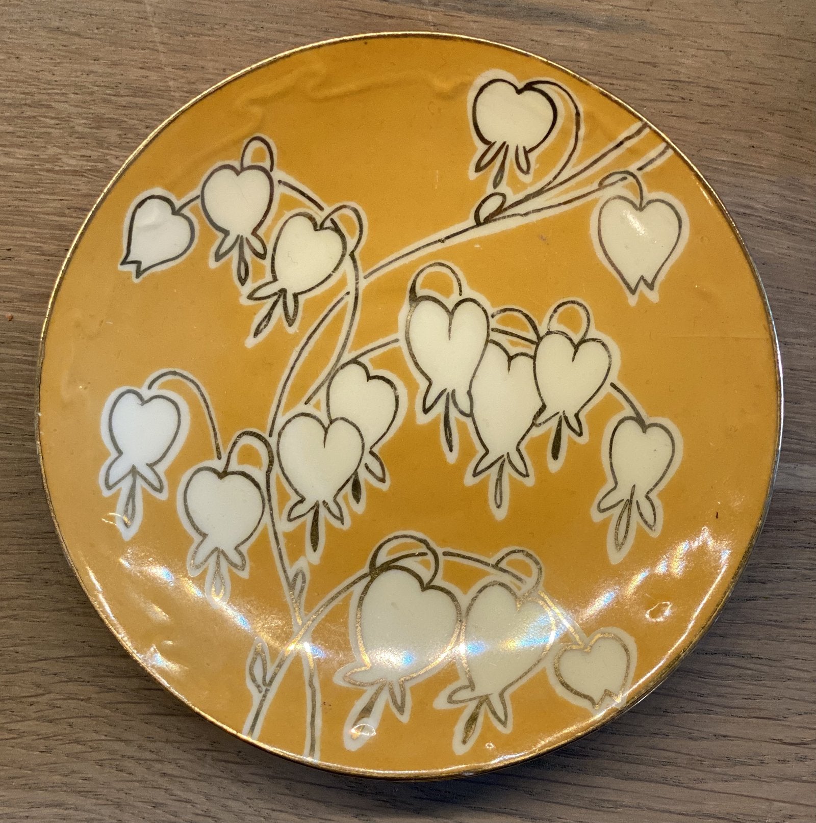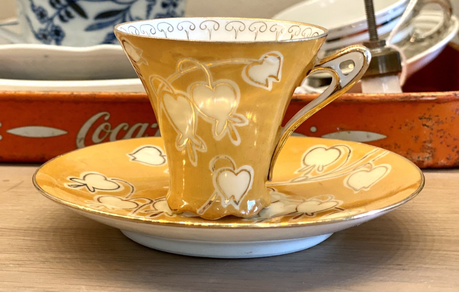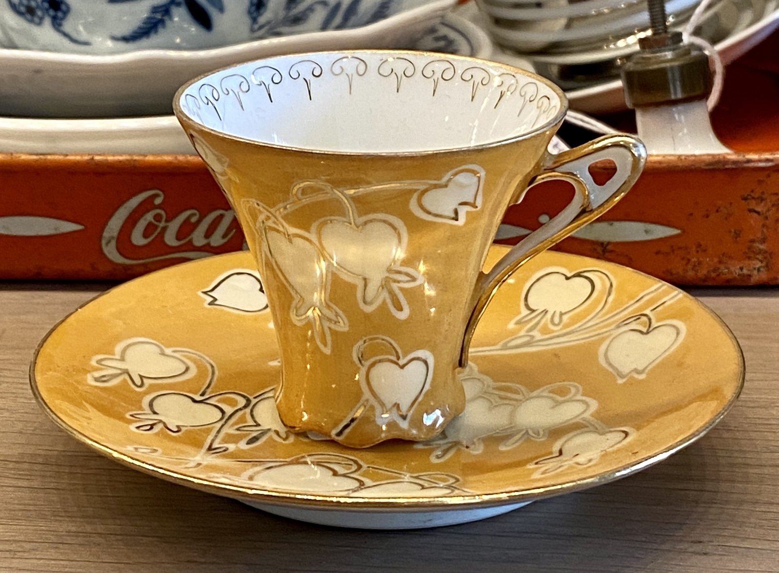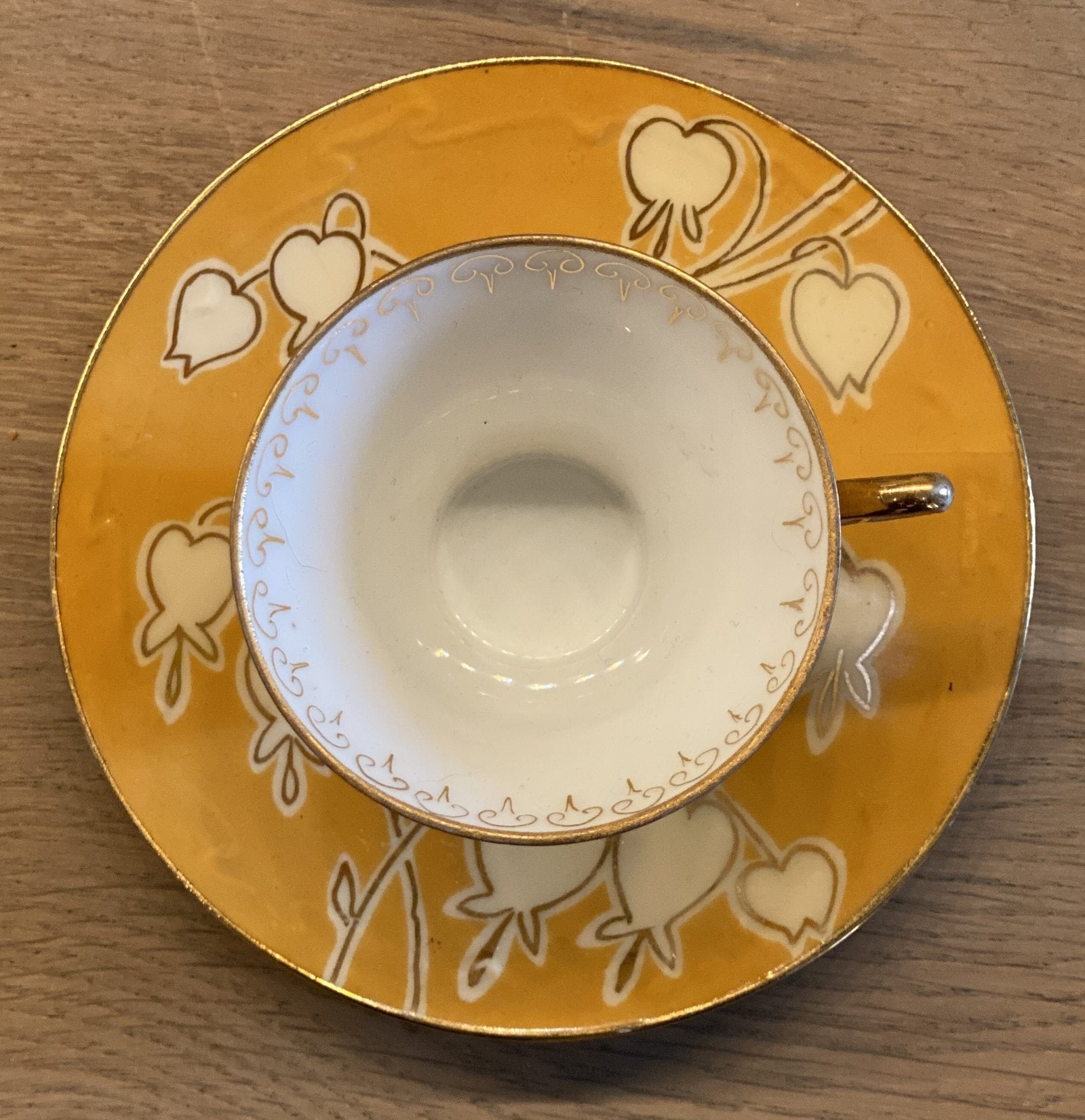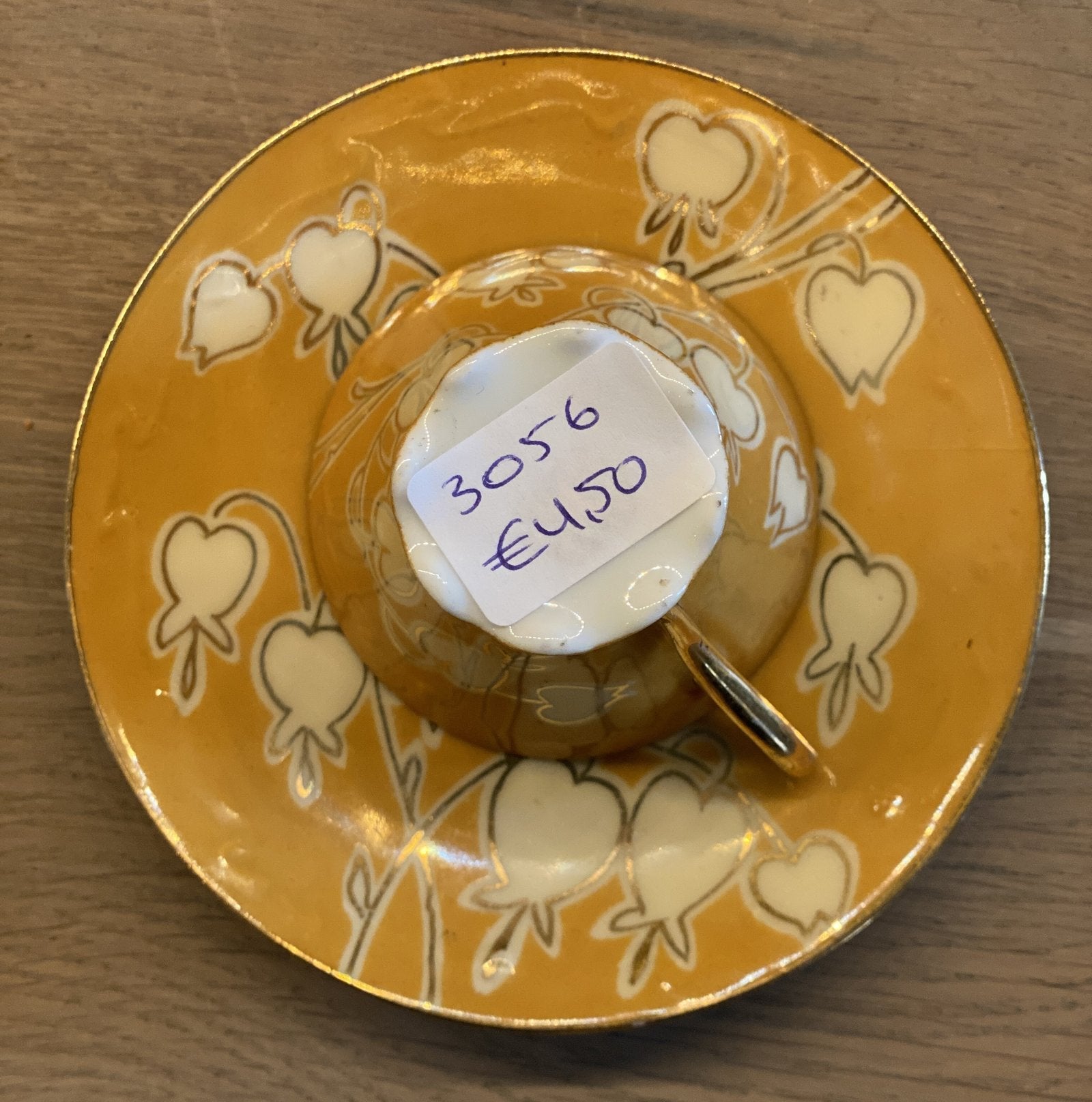 Kopje en schoteltje - klein model van fijn porselein - oranje ondergrond met witte klokjesbloemen omlijnd met goudkleurig lijntje.