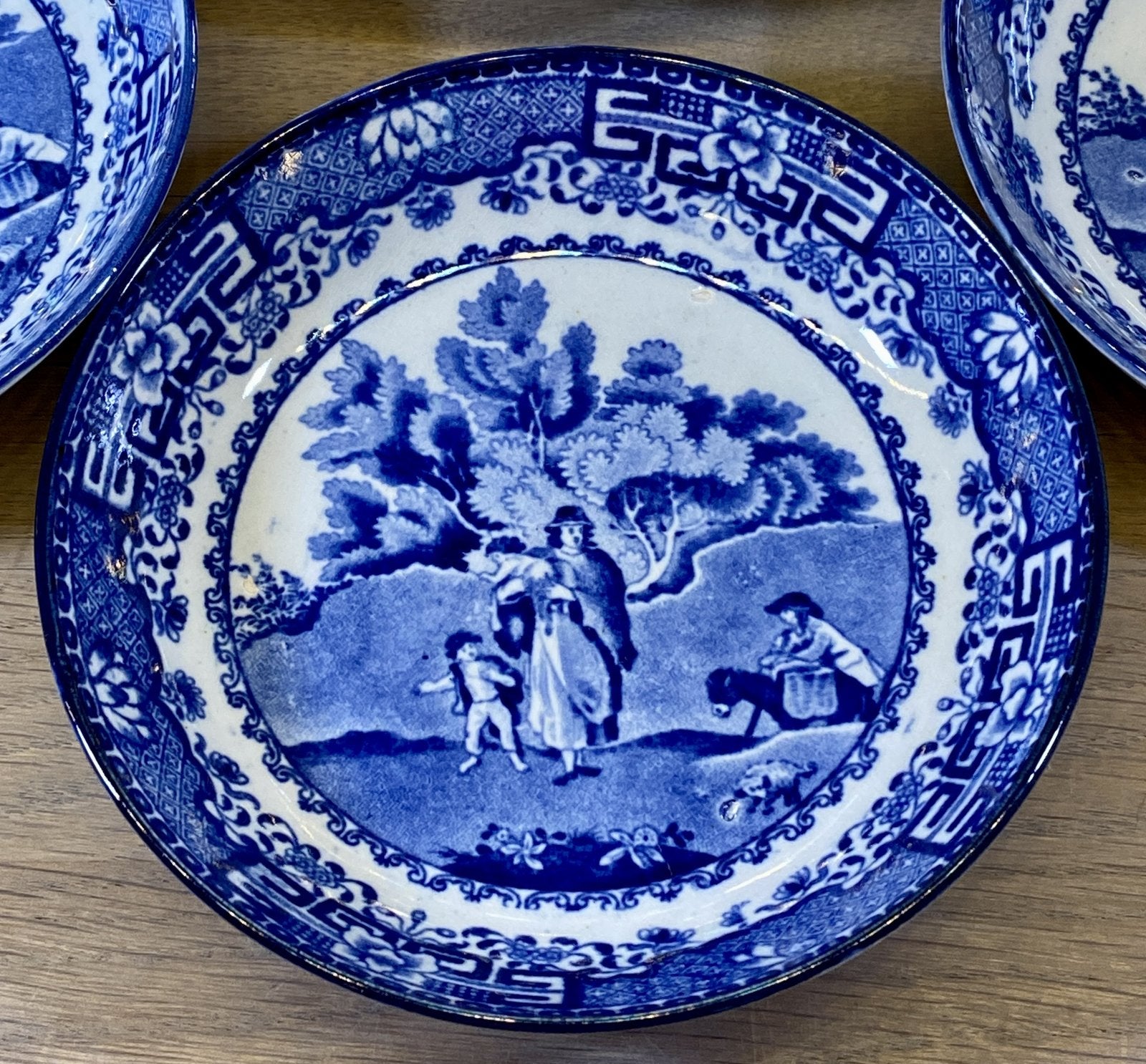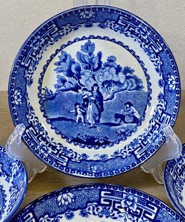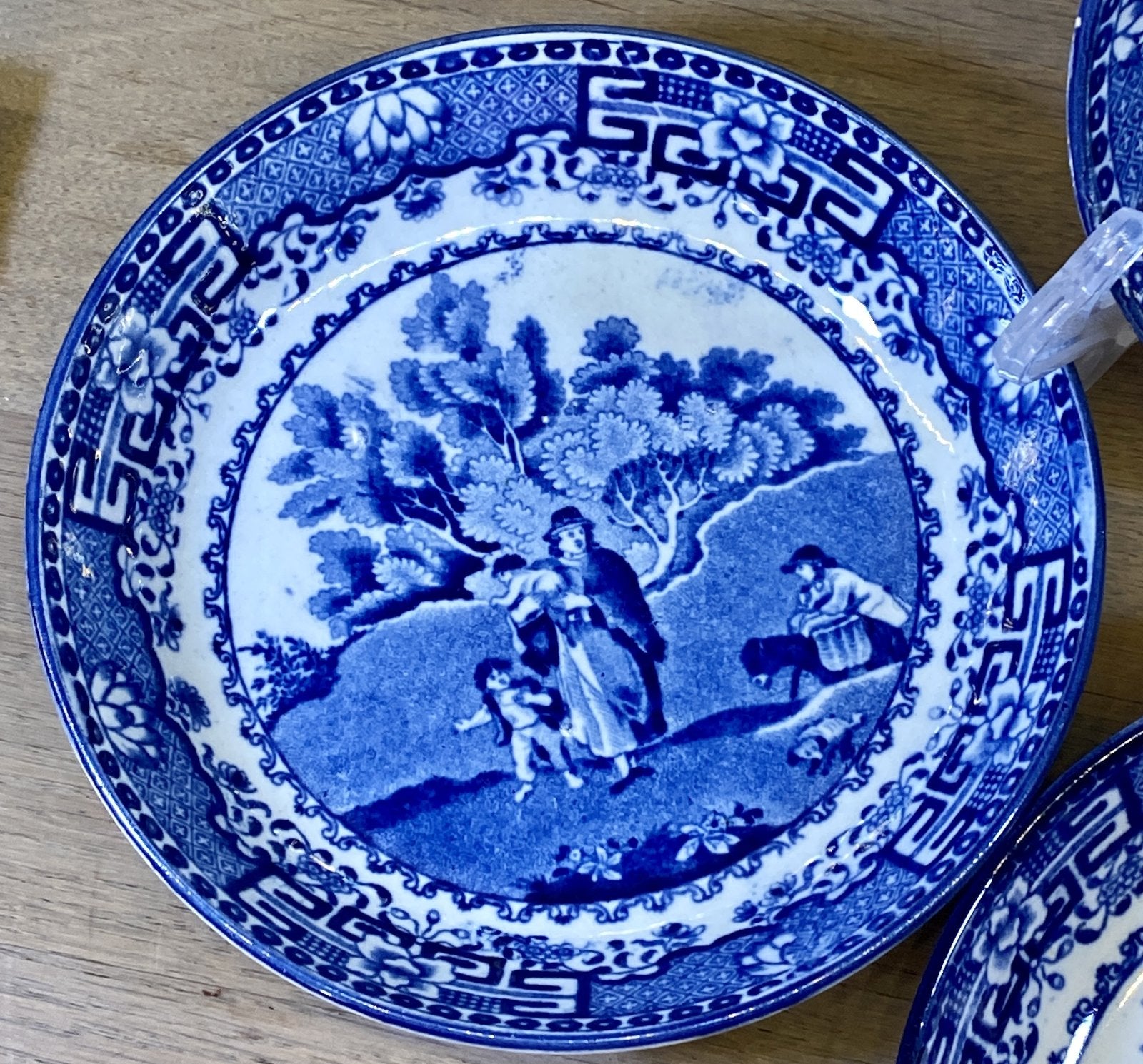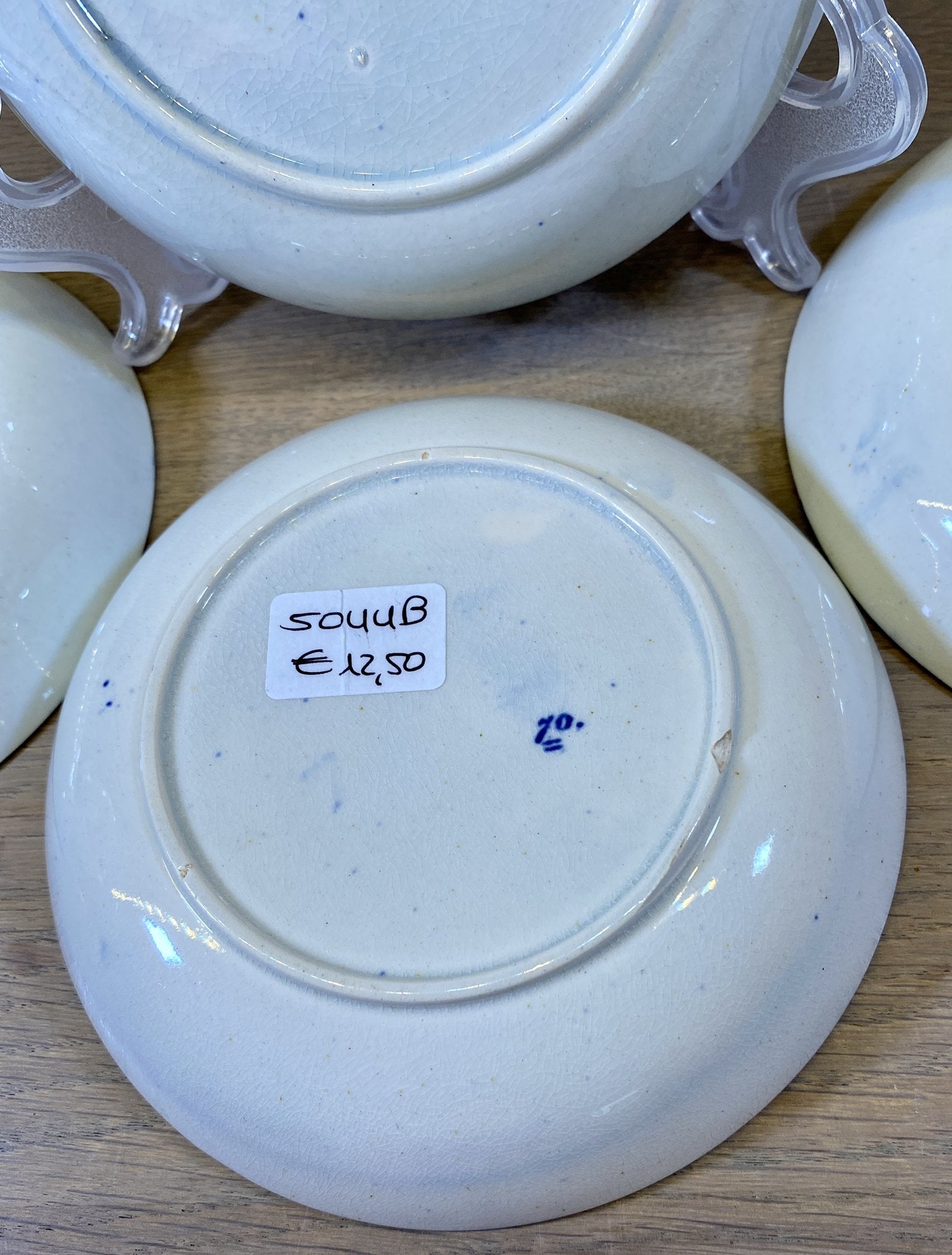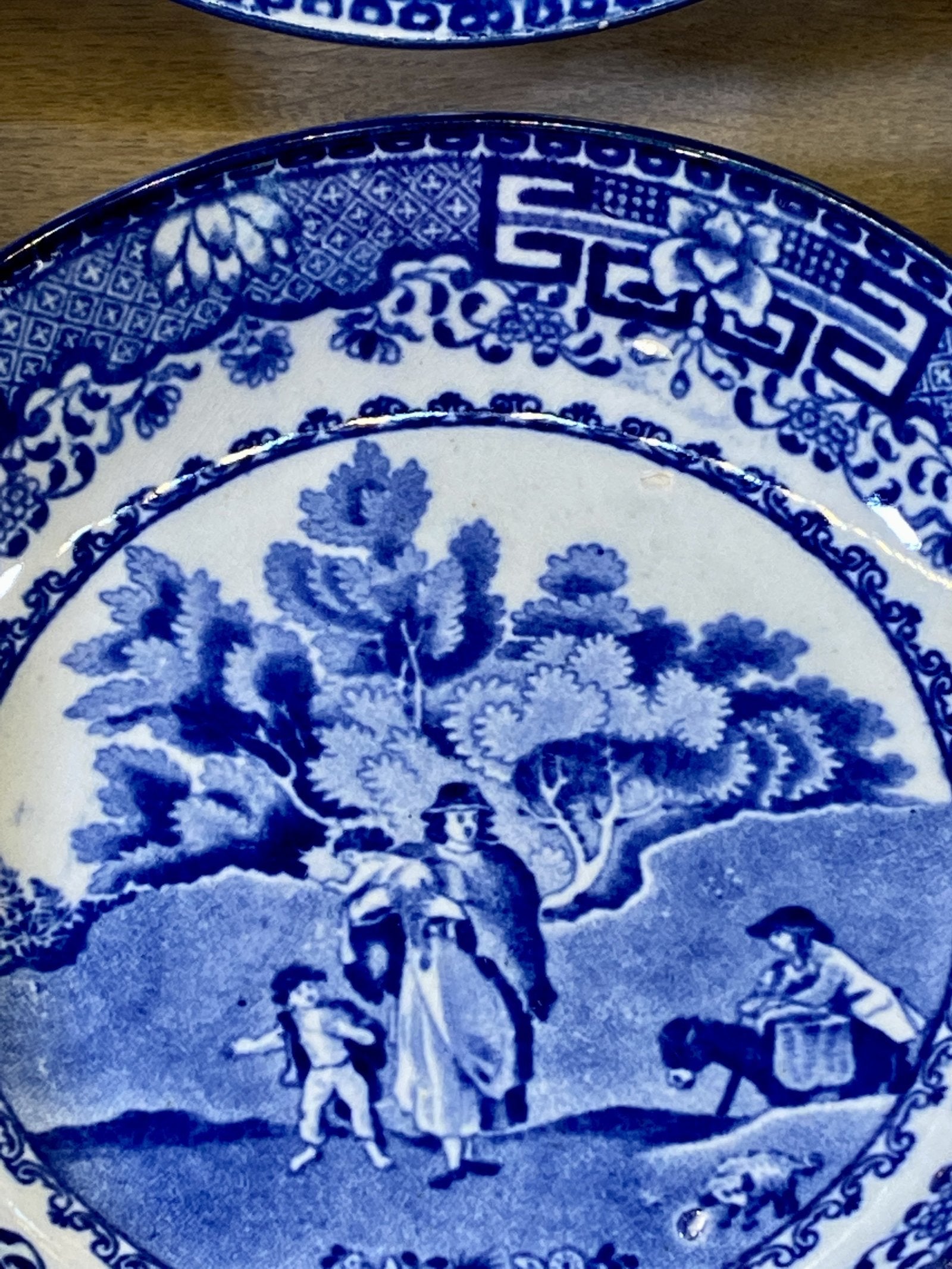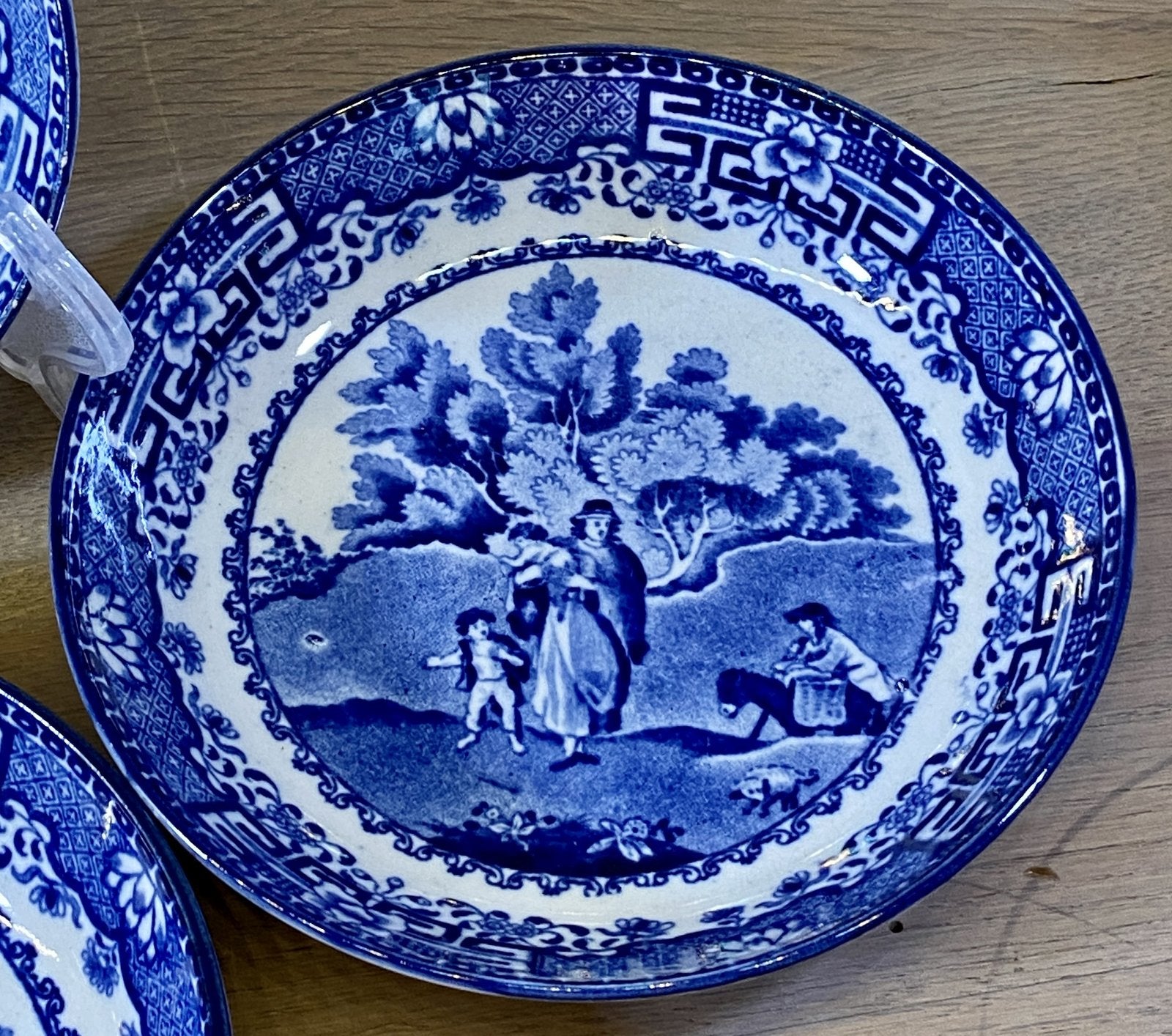 Schoteltje / Onderschotel - alleen gemerkt met een nummer 70 en een dubbel streepje eronder (onbekende potter, staat wel in TCC database) - décor in blauw/ transferware ook wel bekend onder de naam Tea Drinker/Tea Party.
