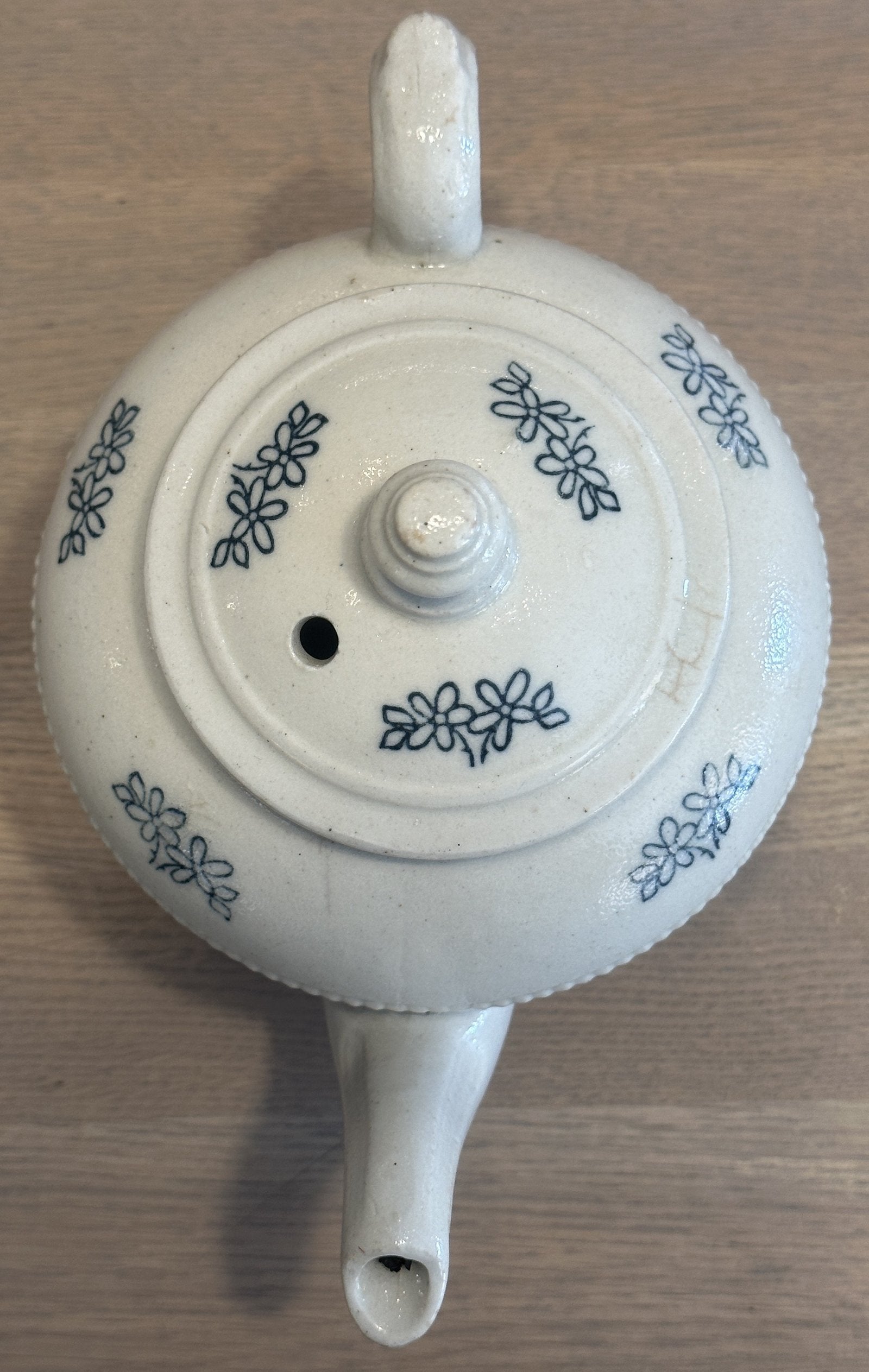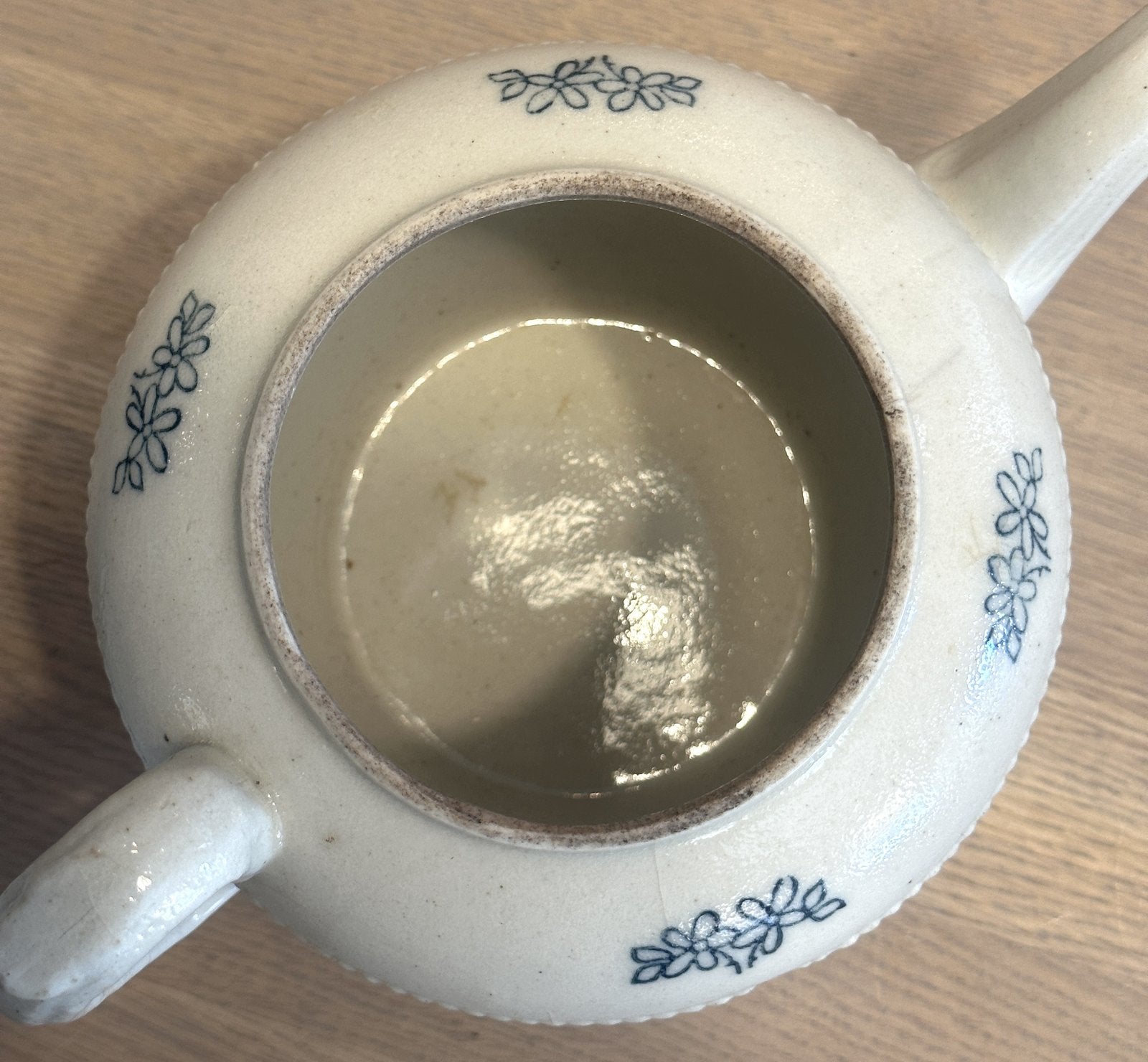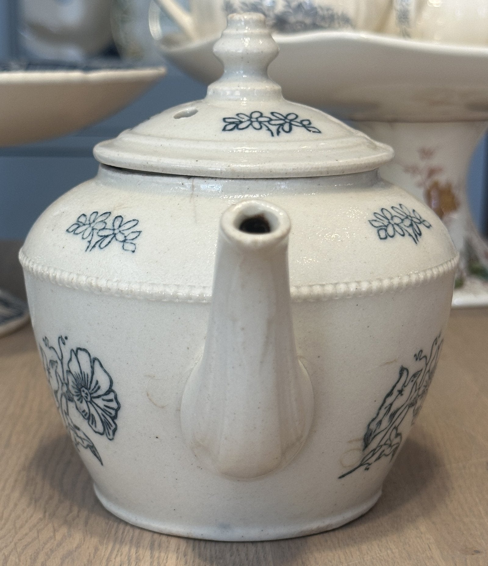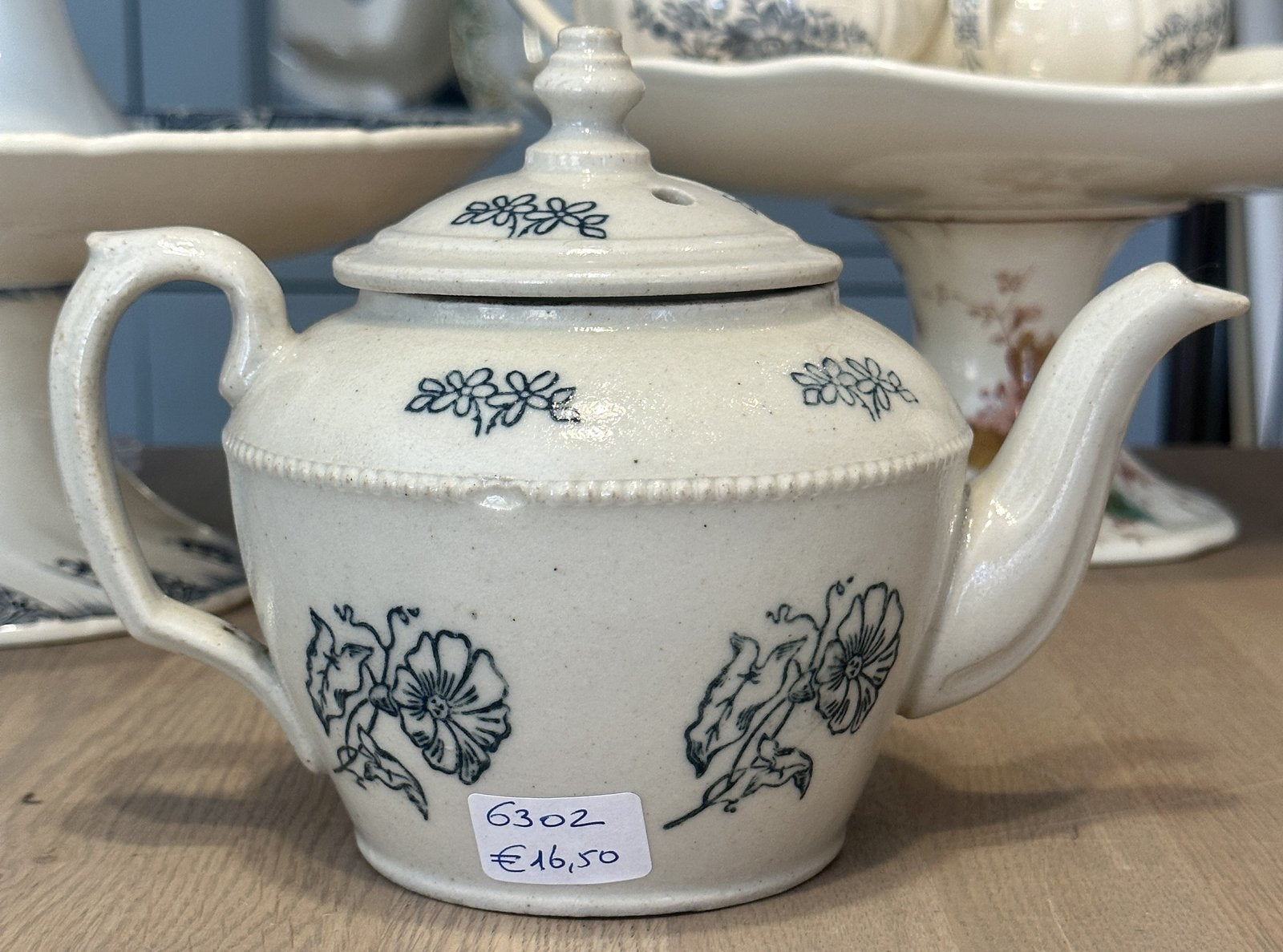 Theepotje - klein model - onleesbaar gemerkt - uitgevoerd in ruw aardewerk met een décor van blauwe bloemetjes - blinkmerk 2.