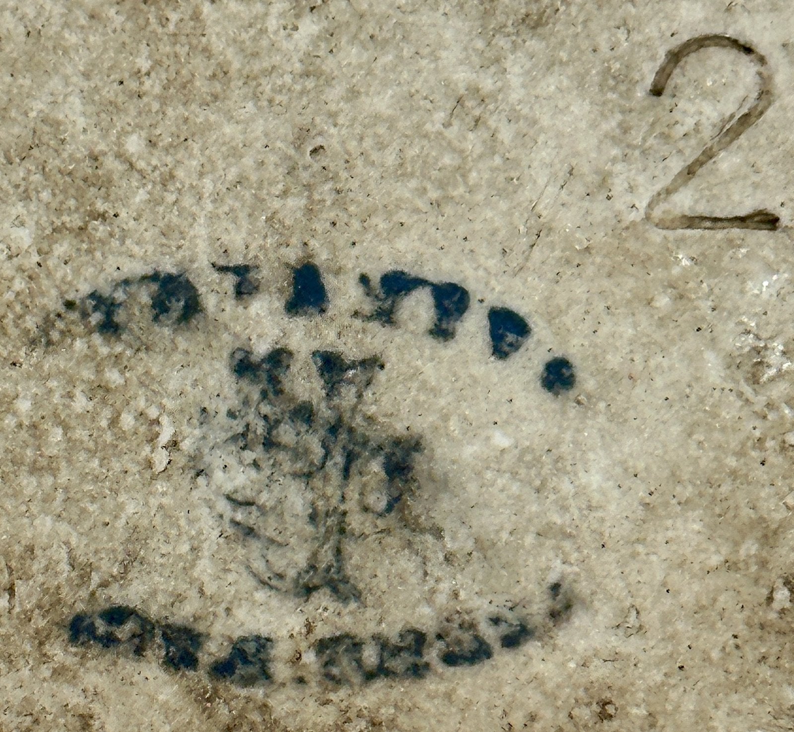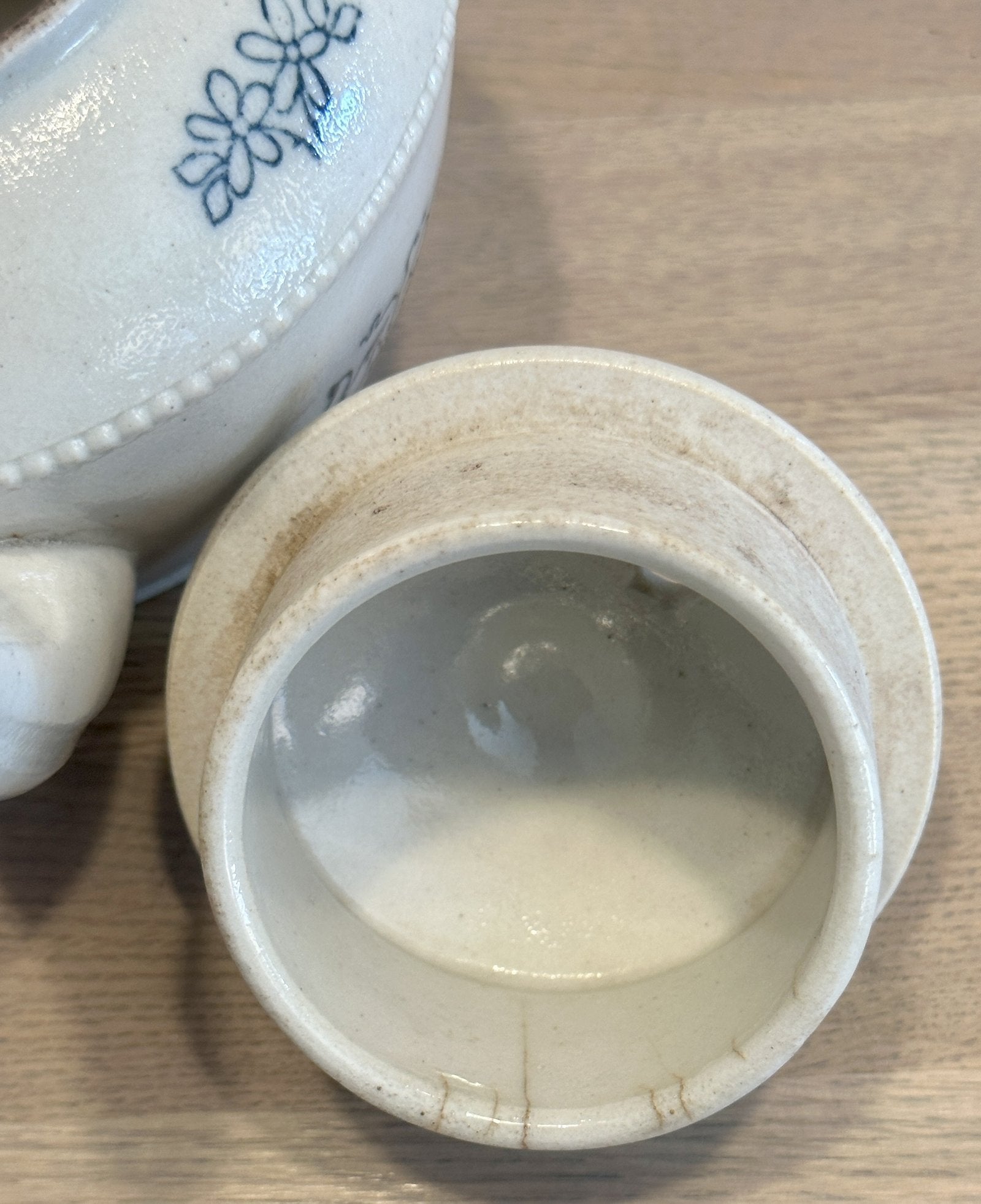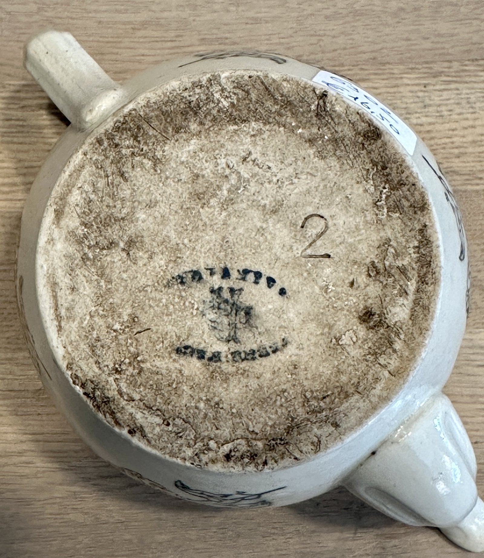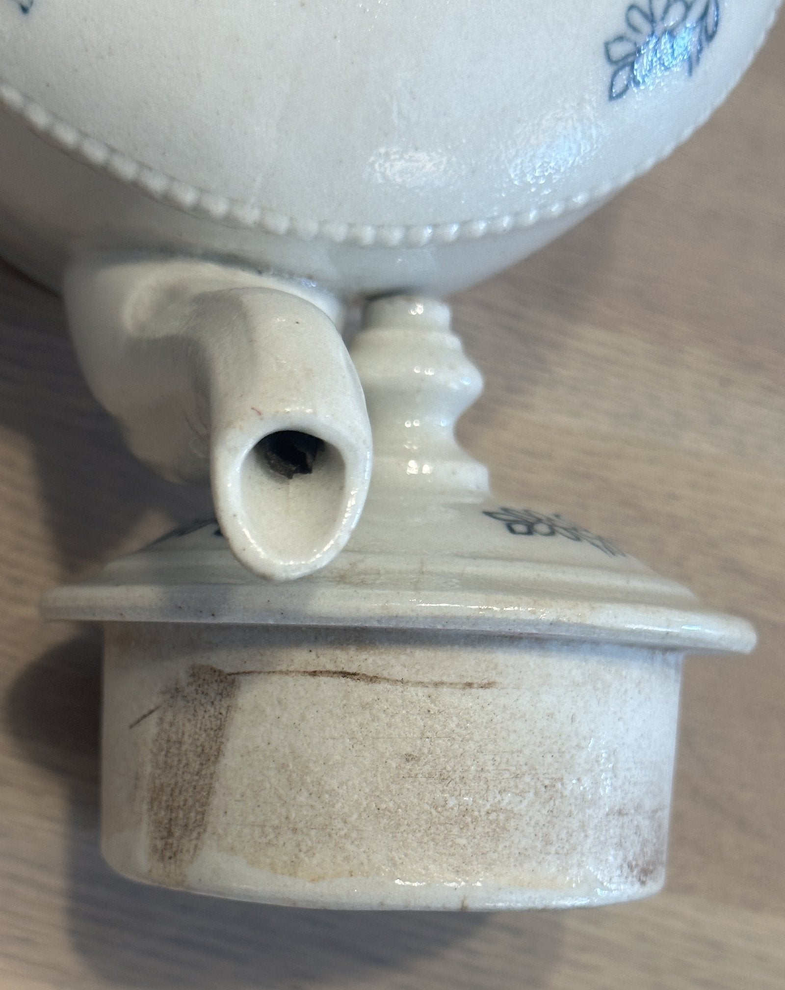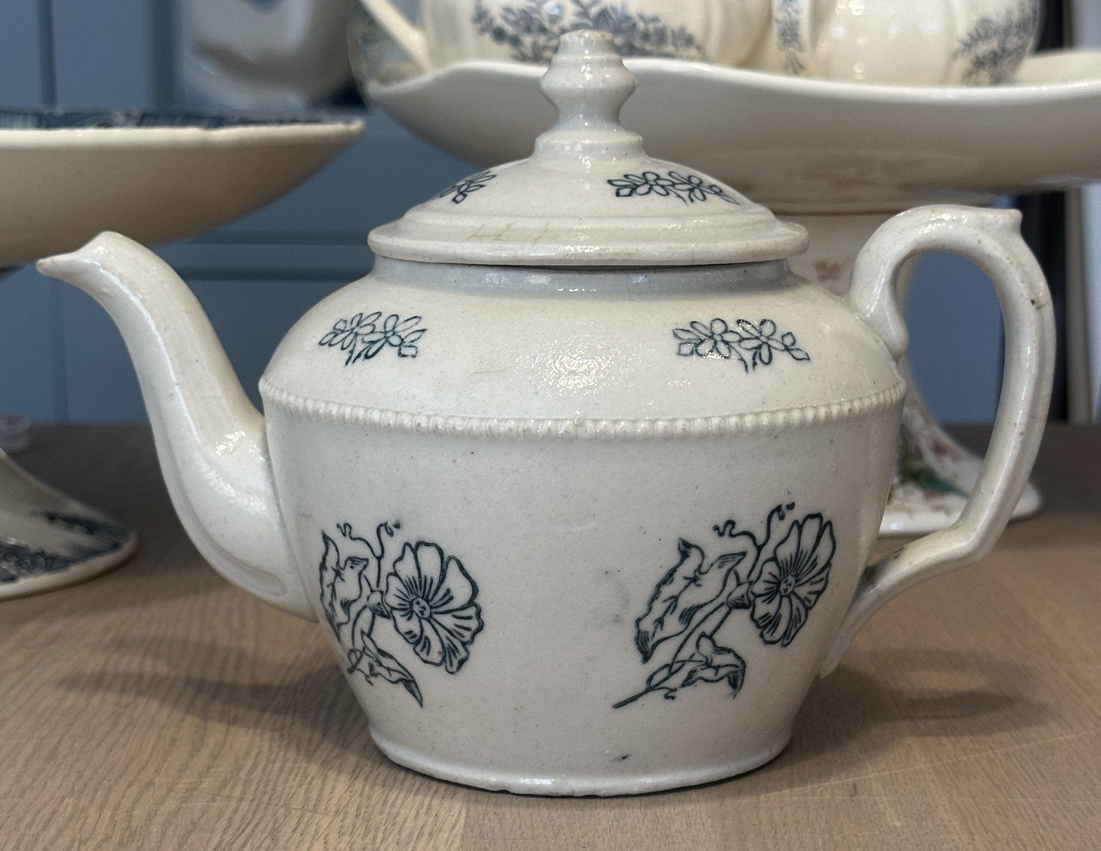 Theepotje - klein model - onleesbaar gemerkt - uitgevoerd in ruw aardewerk met een décor van blauwe bloemetjes - blinkmerk 2.