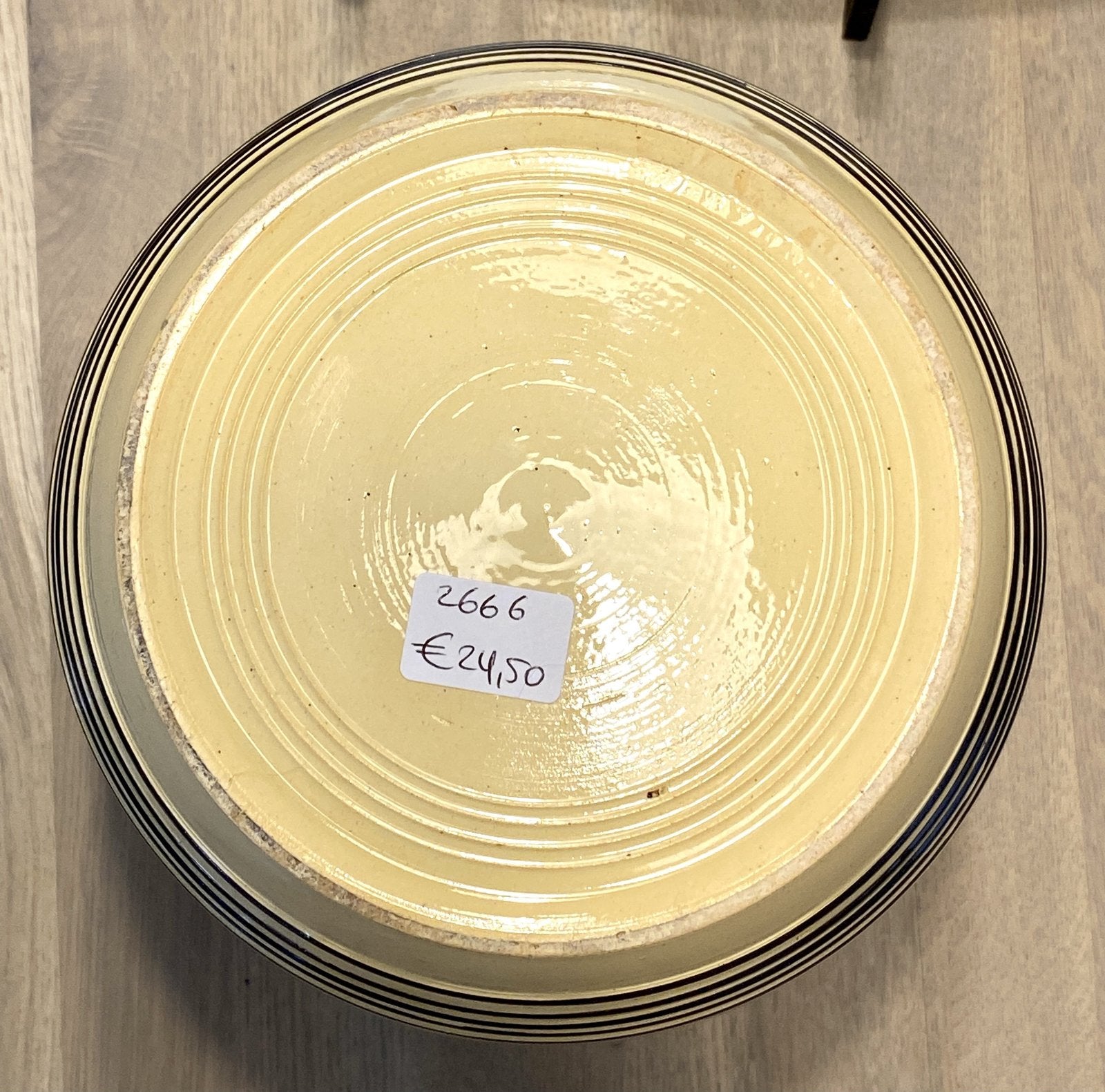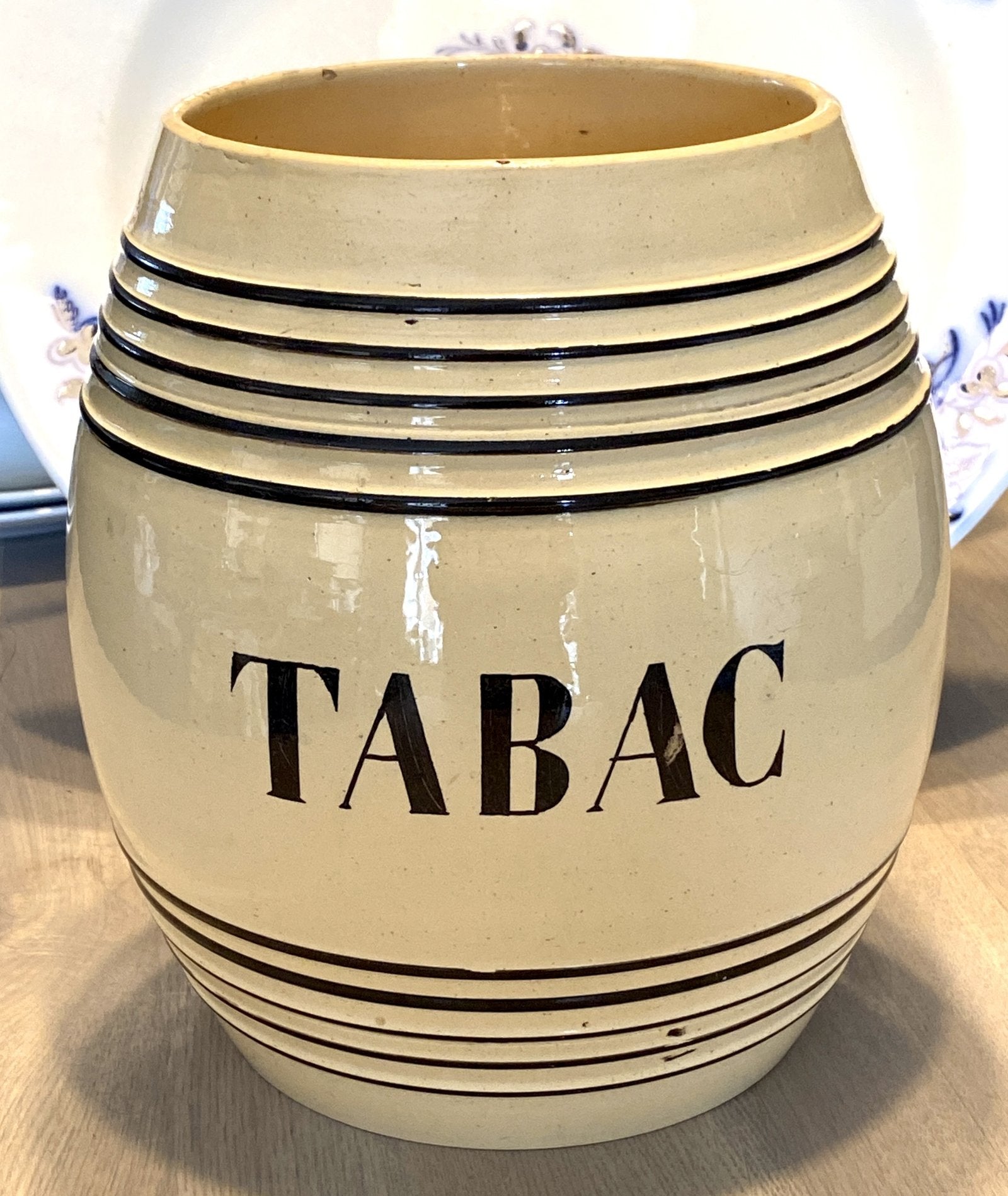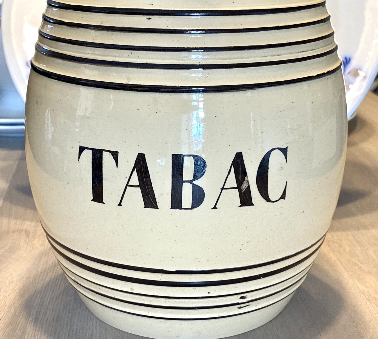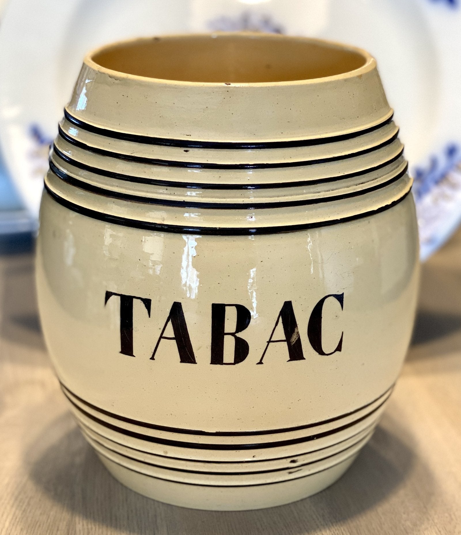 Vooraadpot - groot - ongemerkt (Boch?) - met opschrift in zwart TABAC en zwarte ringen.