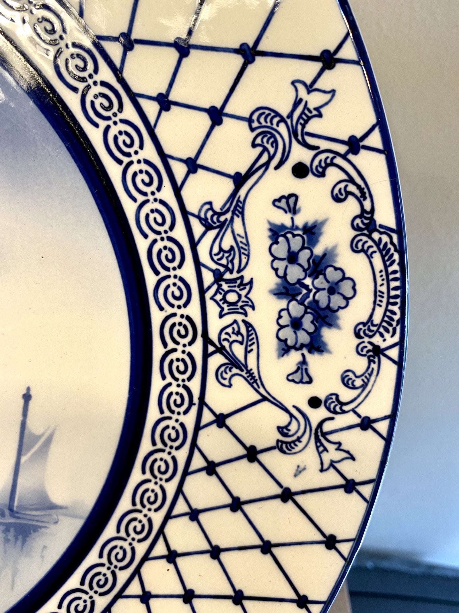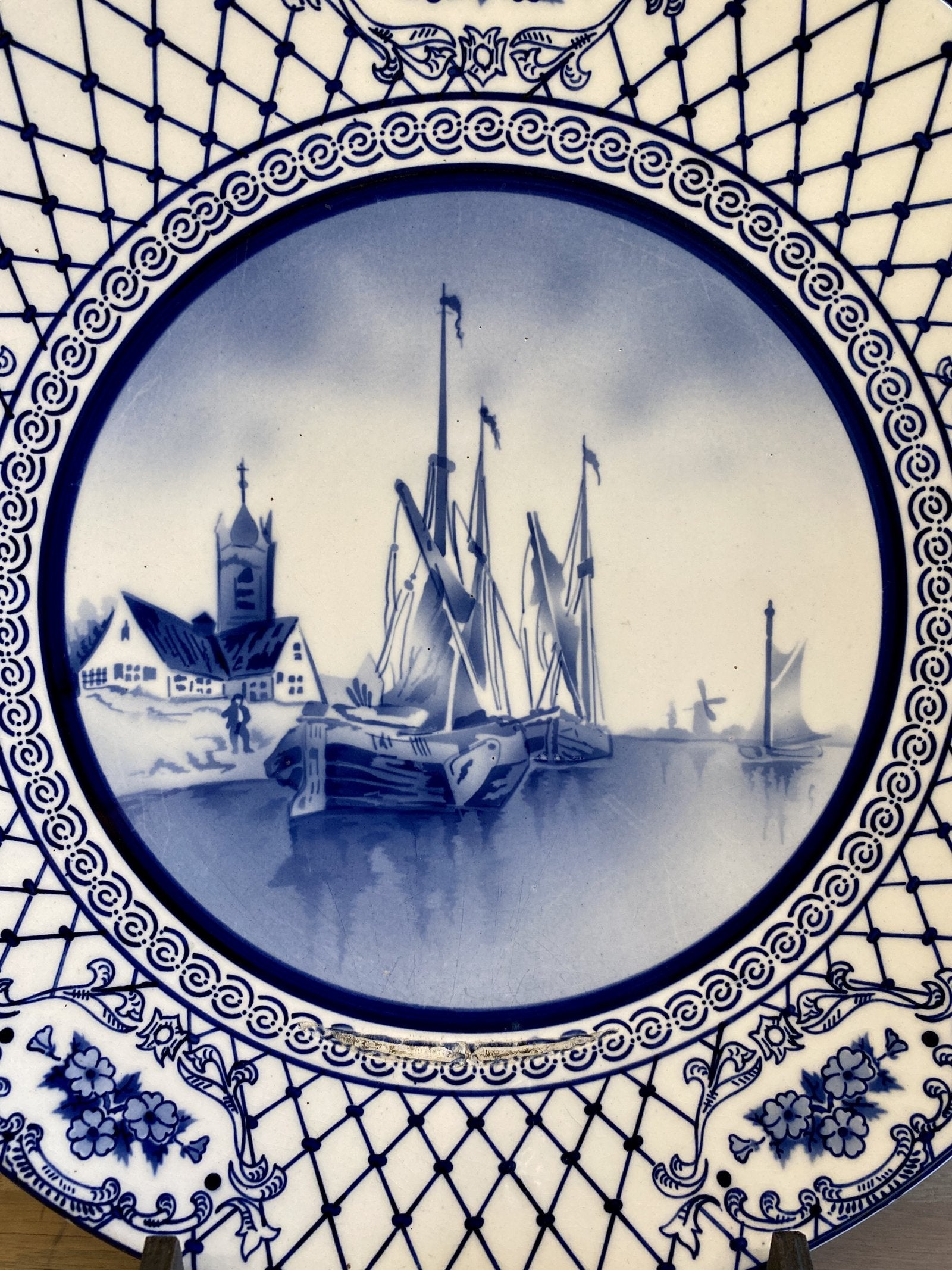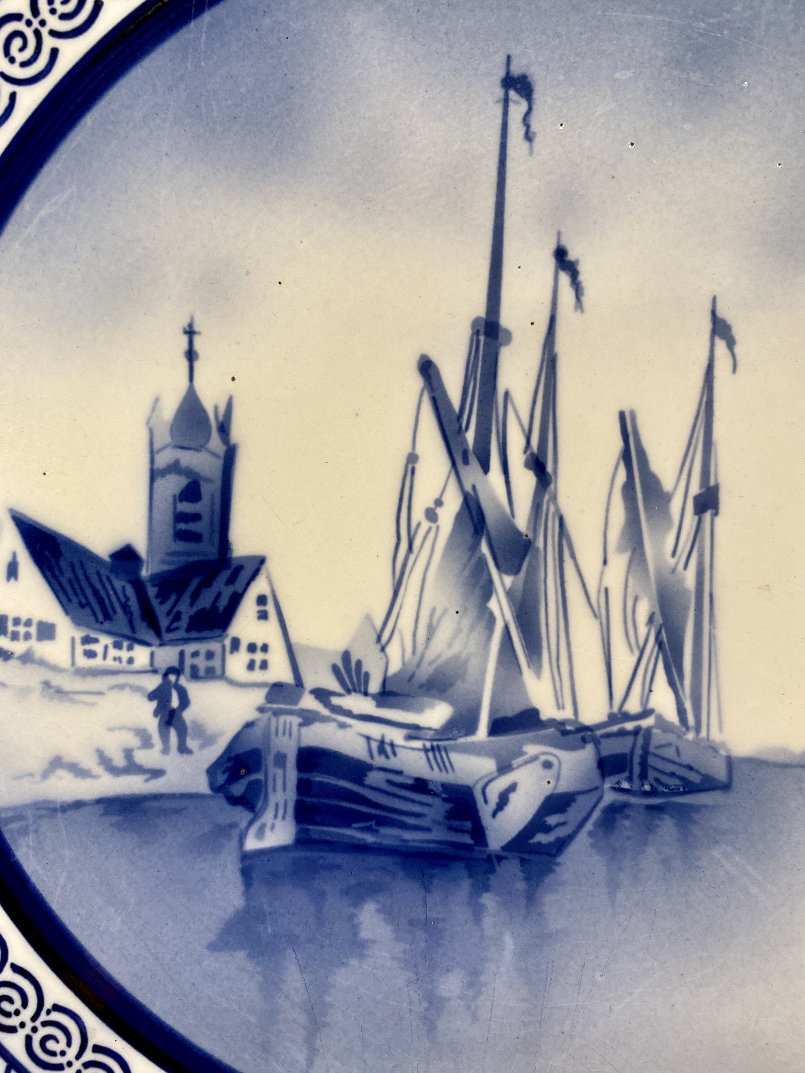 Wandbord - groot - ongemerkt - met ophangoog - in het midden een blauw spuitdecor van oude schepen, een kerkje en molens - aan de rand een blauw netdecor met daarin bloemen.