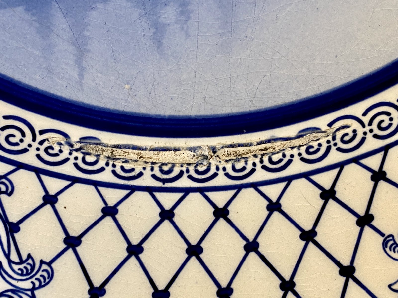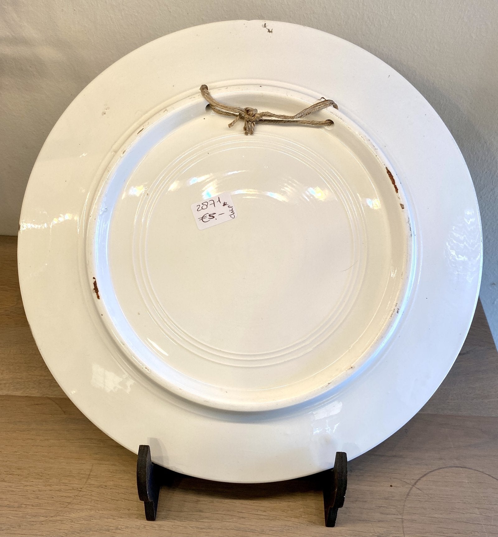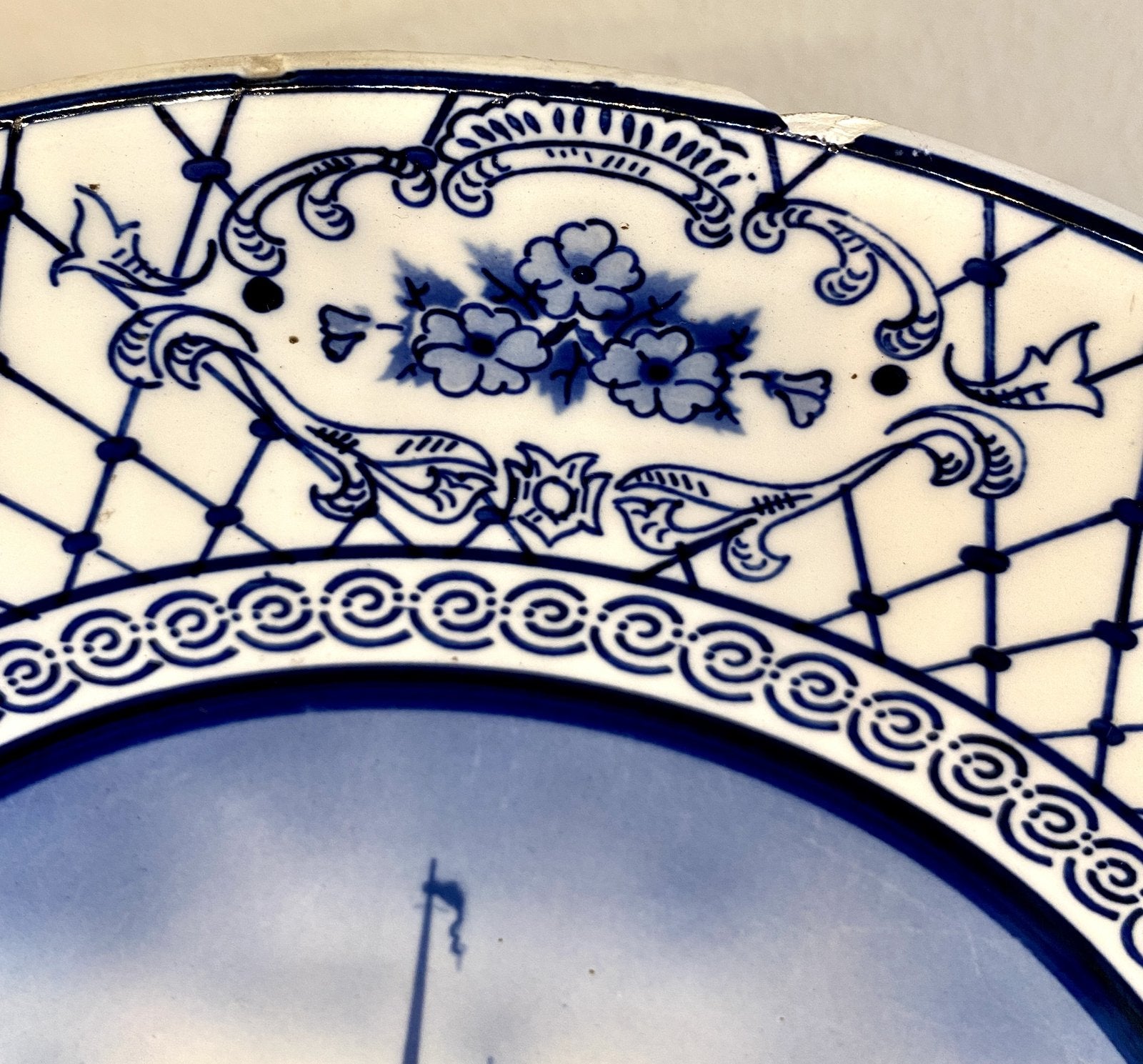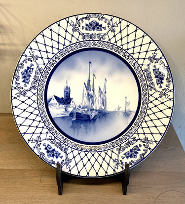 Wandbord - groot - ongemerkt - met ophangoog - in het midden een blauw spuitdecor van oude schepen, een kerkje en molens - aan de rand een blauw netdecor met daarin bloemen.
