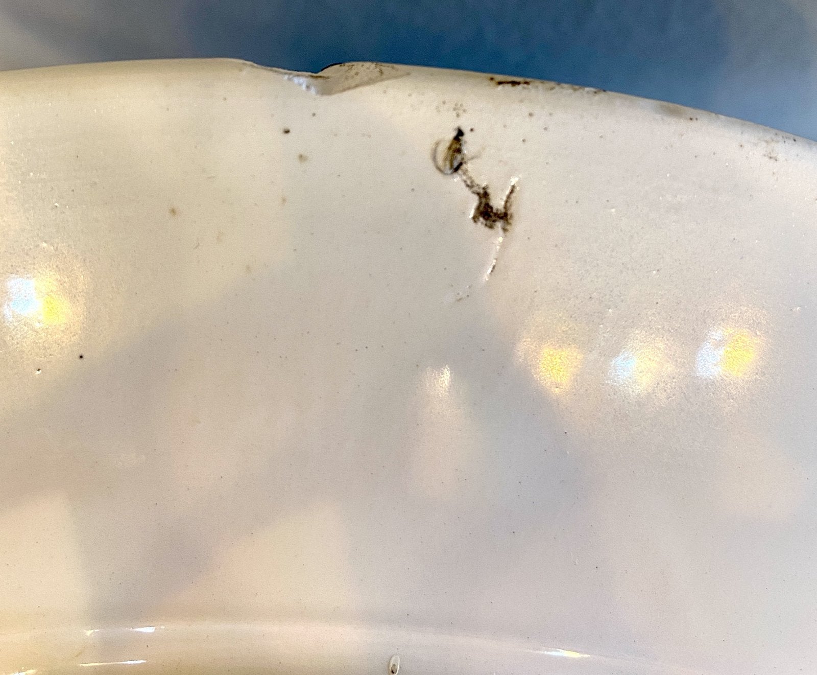In goede staat met een chip aan de bovenrand en een bakfout.