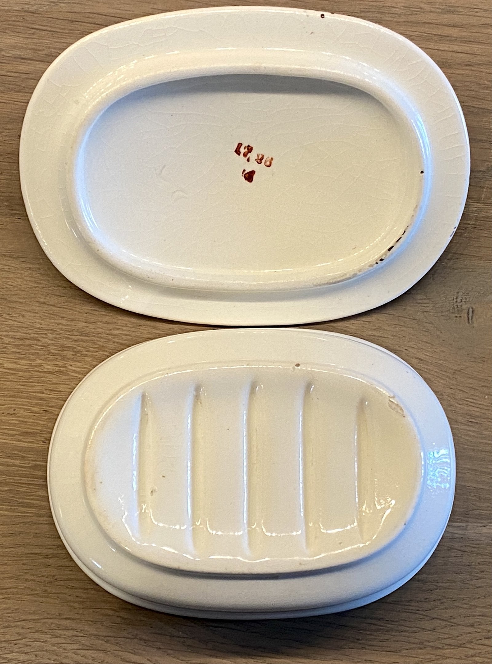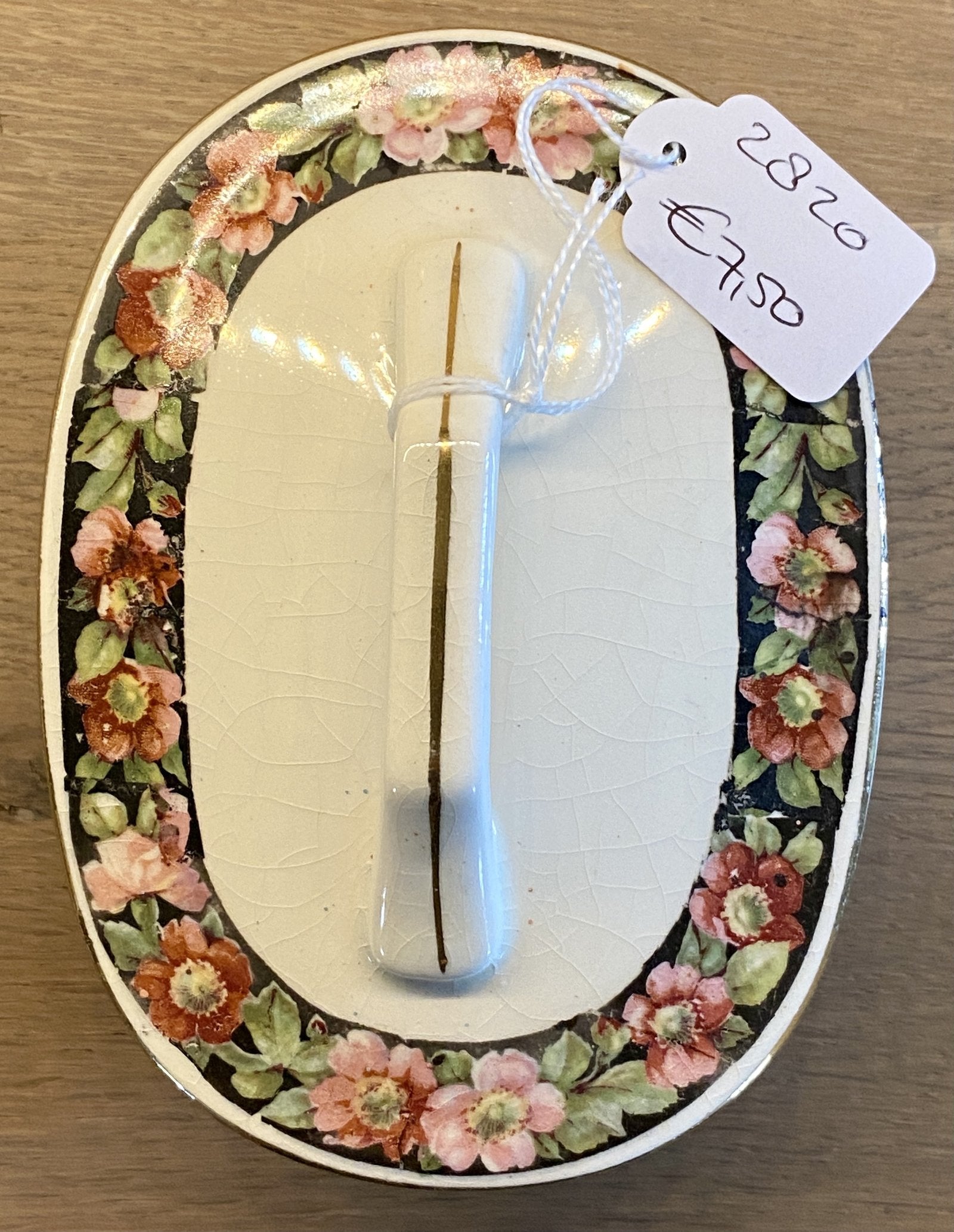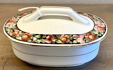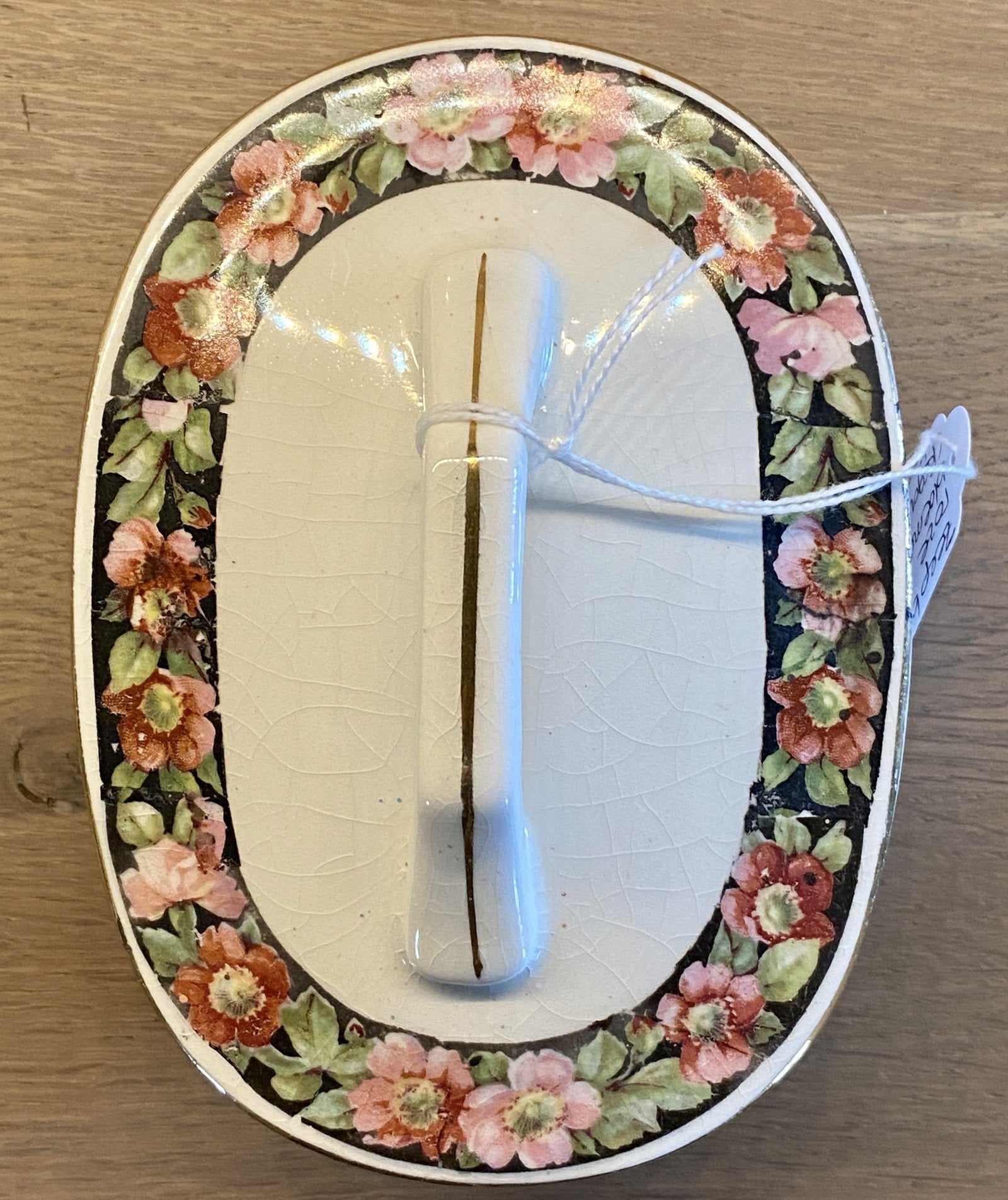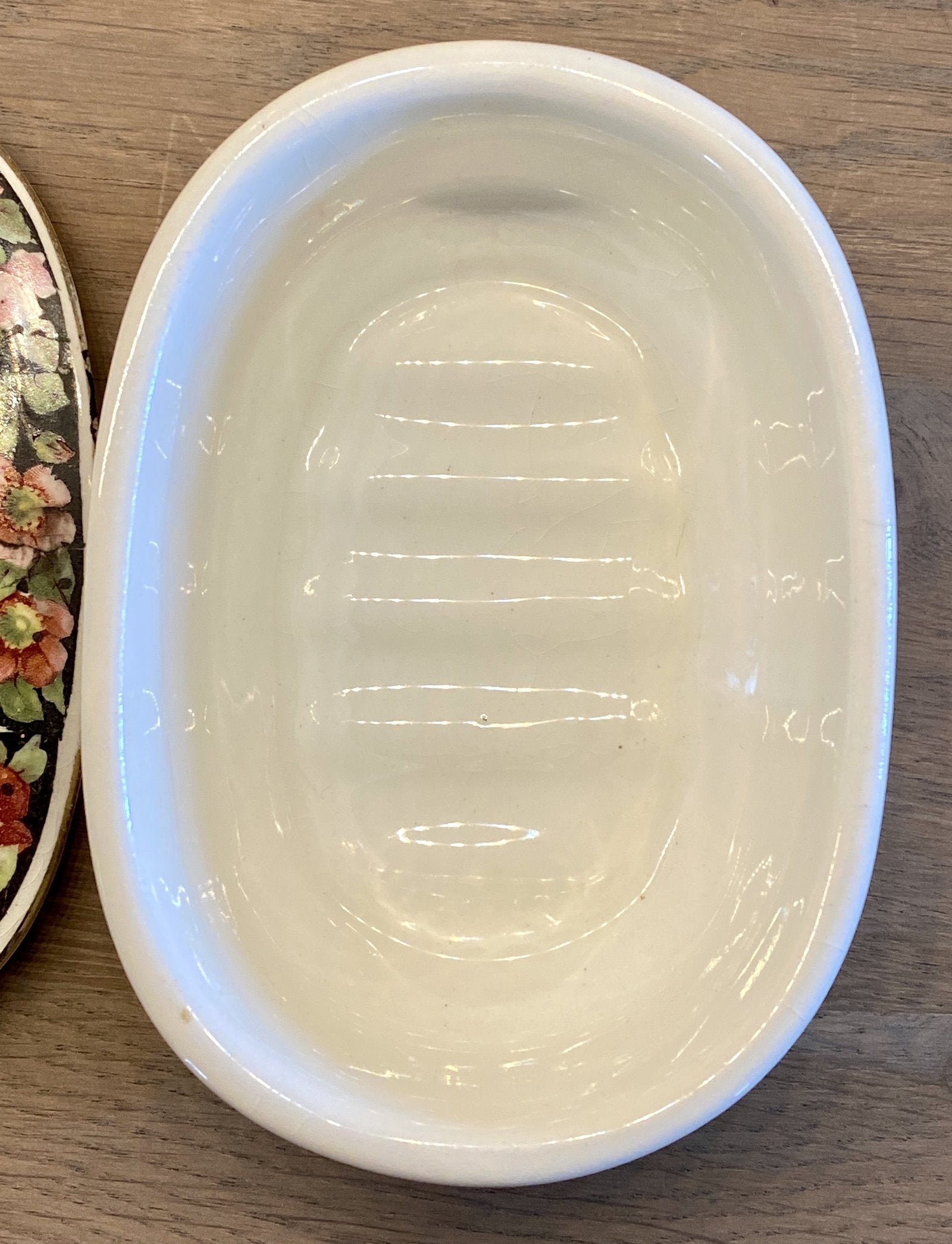 Zeepbakje - ovaal - met deksel - ongemerkt - decor is rand van donker- en lichtroze bloemen met goudkleurige lijntjes
