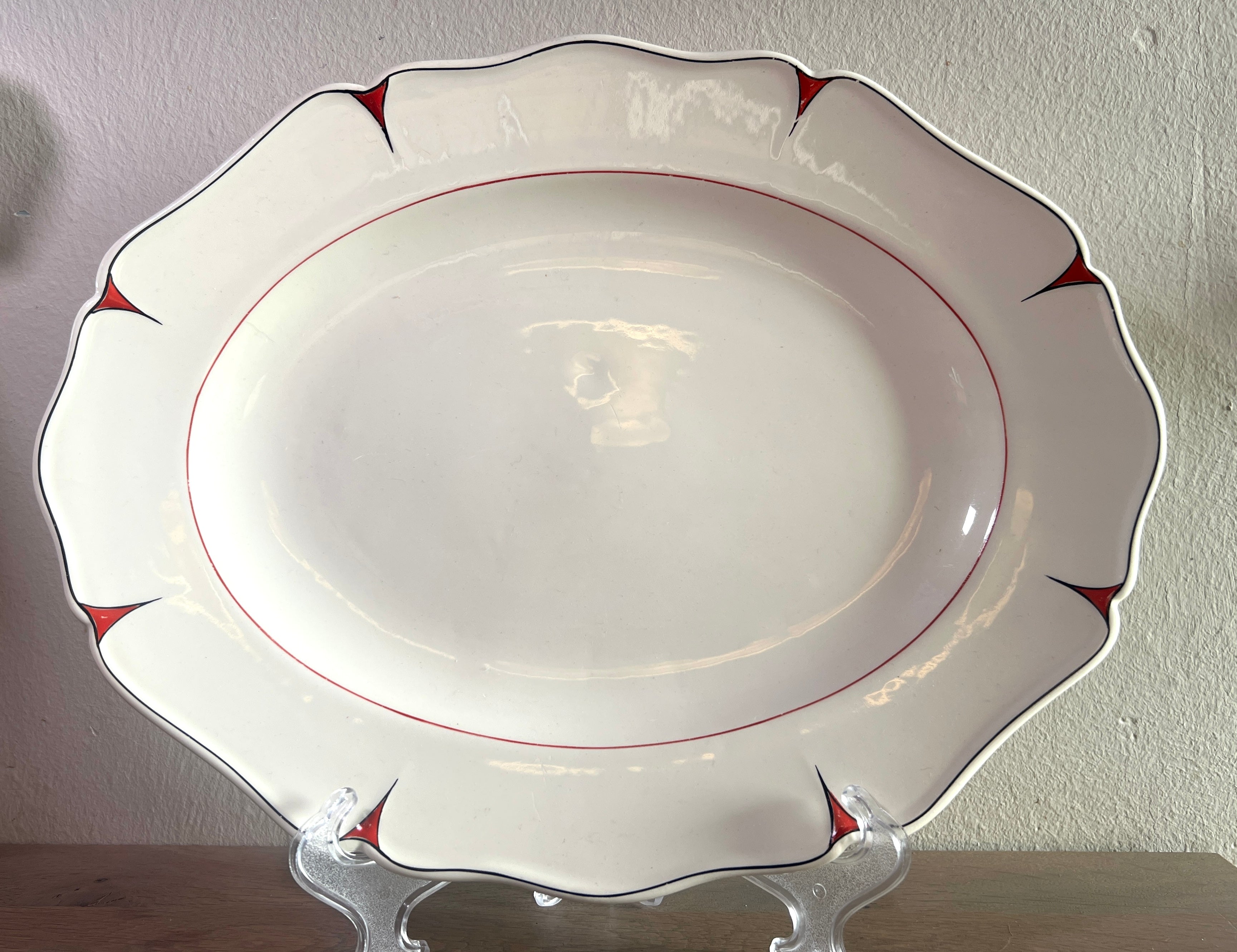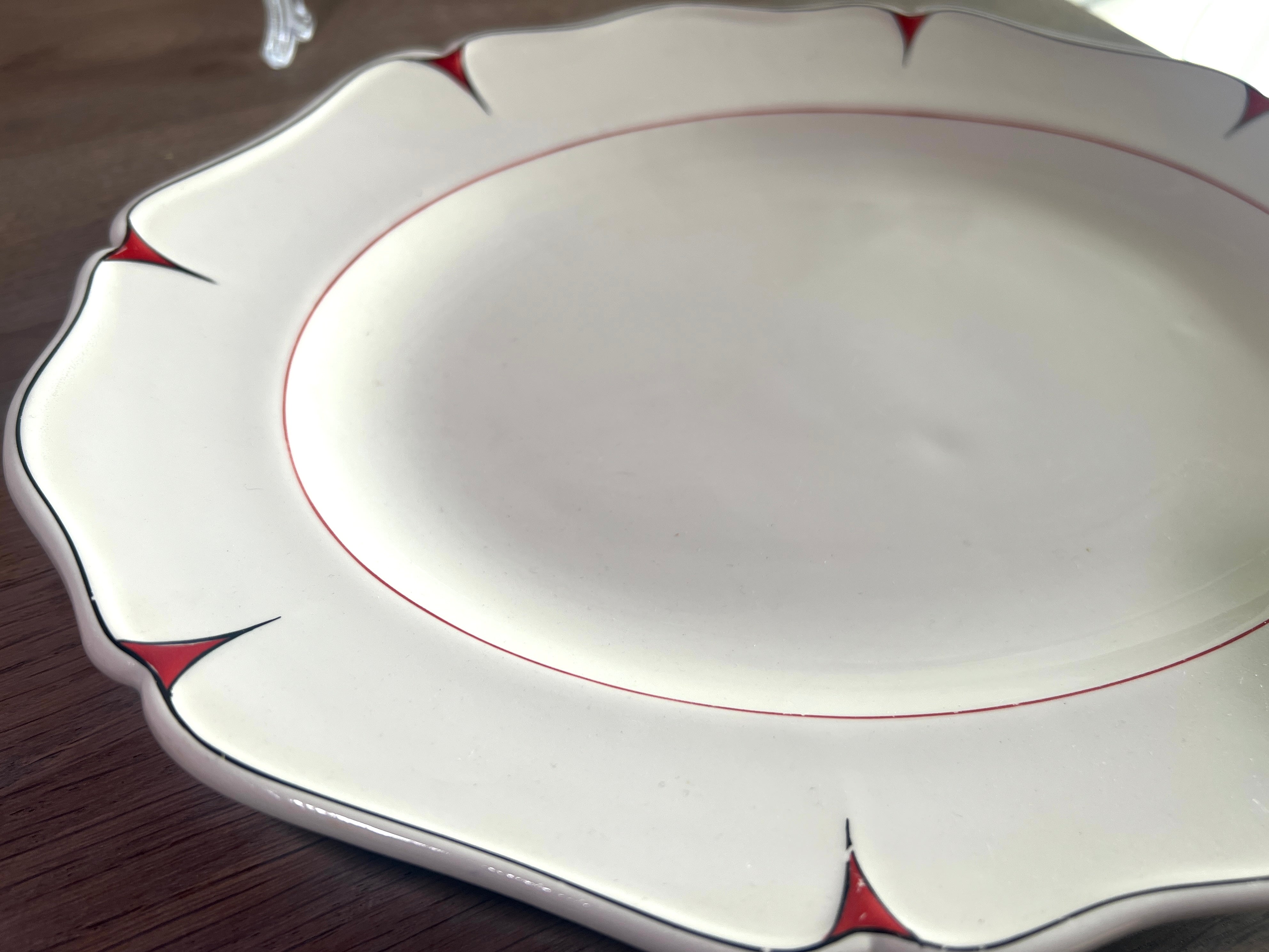 Schaal / Bord - ovaal, plat, model - Petrus Regout - uitvoering met rode versierselen uitgewerkt in gegolfde rand - Art Deco