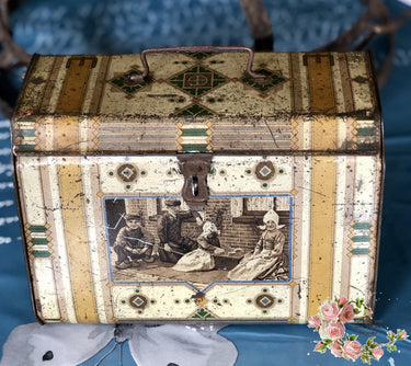 Blechdose – Jugendstil mit schwarzweißen Abbildungen von Kindern in Tracht – mit Henkel und Verschluss – in Form eines Koffers mit nach innen gewölbtem Boden – Beschädigungen und Rostbildung – Scharniere und Verschluss in Ordnung. Wahrscheinlich niederländischen Ursprungs, Zeitraum 1900–1910.