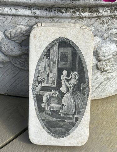 Taufzuckerdose - rechteckiges Modell mit schwarz-weißem Bild von Mutter und Kind an einer Schaukelwiege.