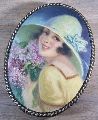 Schachtel - ovale Form - für Schokolade oder ähnliches? – Abbildung einer jungen Frau mit Hut und Blumen – leicht gewölbter Deckel – ca. 1920.