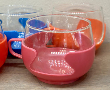 Teeglas in rosafarbenem Kunststoffhalter – ungemarkt – 1970er Jahre.