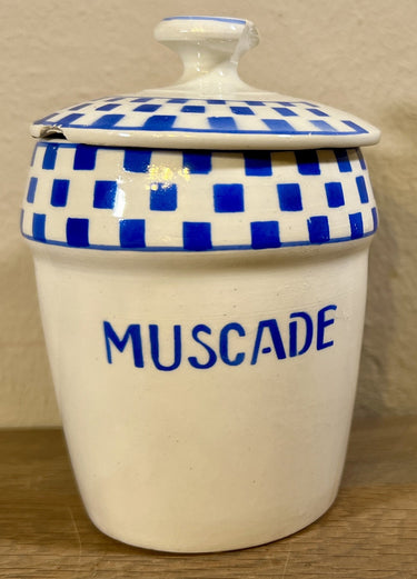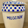 Vorratsdose - kleines Modell - Nimy - in Creme mit blauem Schriftzug MUSCADE und Blockdekor auf der Vorderseite oben.