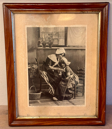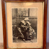 Druck eines Kupferstichs von Jules Nahrath & Cie. Brüssel – „Leçon de tricot“ (Die Strickstunde) – Frau bringt einem Mädchen das Stricken bei – Nr. 716 – schöner Holzrahmen – dunkler Fleck oben – um 1900