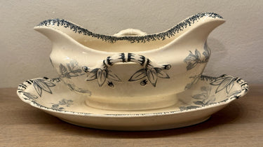 Sauciere / Sauciere auf Fuß - U&Cie (Utzschneider & Cie) Sarreguemines - Dekor GROSEILLES in blau/jeansblau