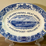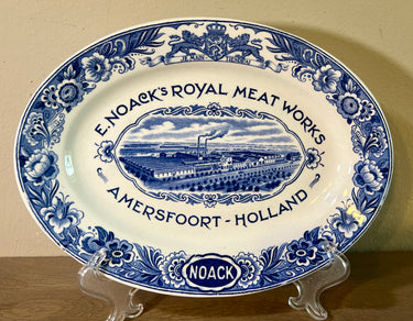 Werbetablett / Tablett - ovales Modell - Société Céramique Maestricht - blau-weiße Dekoration mit der Aufschrift 'E. Noack's Royal Meat Works Amersfoort Holland'