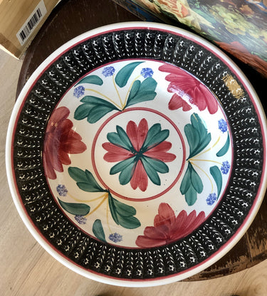 Teller – tief – großes Format – Nimy – BOERENBONT – (bei Société Céramique Maastricht ist dies das Dekor 243A oder 293A) – grüne und rote Figuren mit blauen Blumen und rot/grünem Rand in Dreiecken.