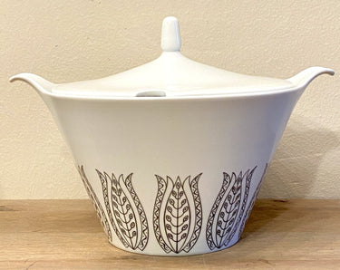 Deckelschale - Mosa - Marke mit 3 Bögen und 2111J - Form GRACIA - Dekor PERISTO aus grauen stilisierten Tulpen