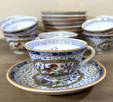 Tasse und Untertasse - kleine Größe (Kindergeschirr?) - Mosa/Louis Regout - Papageiendekor im Innenrand mit Netzdekor