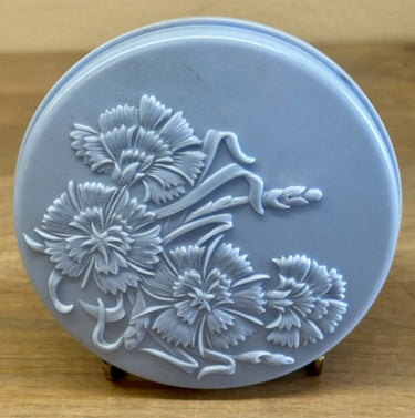 Puderdose - blaues Bakelit mit geprägtem Kornblumendekor