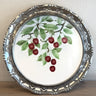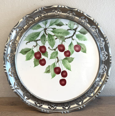 Serviertablett mit durchbrochenem Chromrand – Innentablett aus Steingut mit aufgespritztem Kirschdekor.
