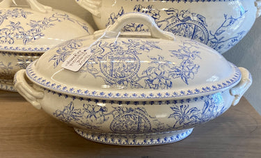 Terrine – oval – Faiencerie de Jemmapes – Blumendekor in Blau, das an die Ästhetik-Epoche (Ende 1800) erinnert.