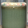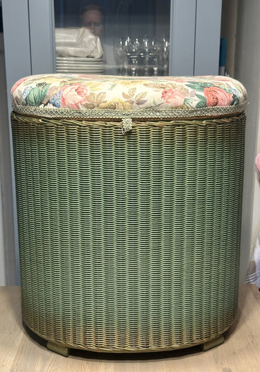 Wäschekorb – Lloyd Loom – grün – Deckel mit rosa Polsterung.