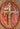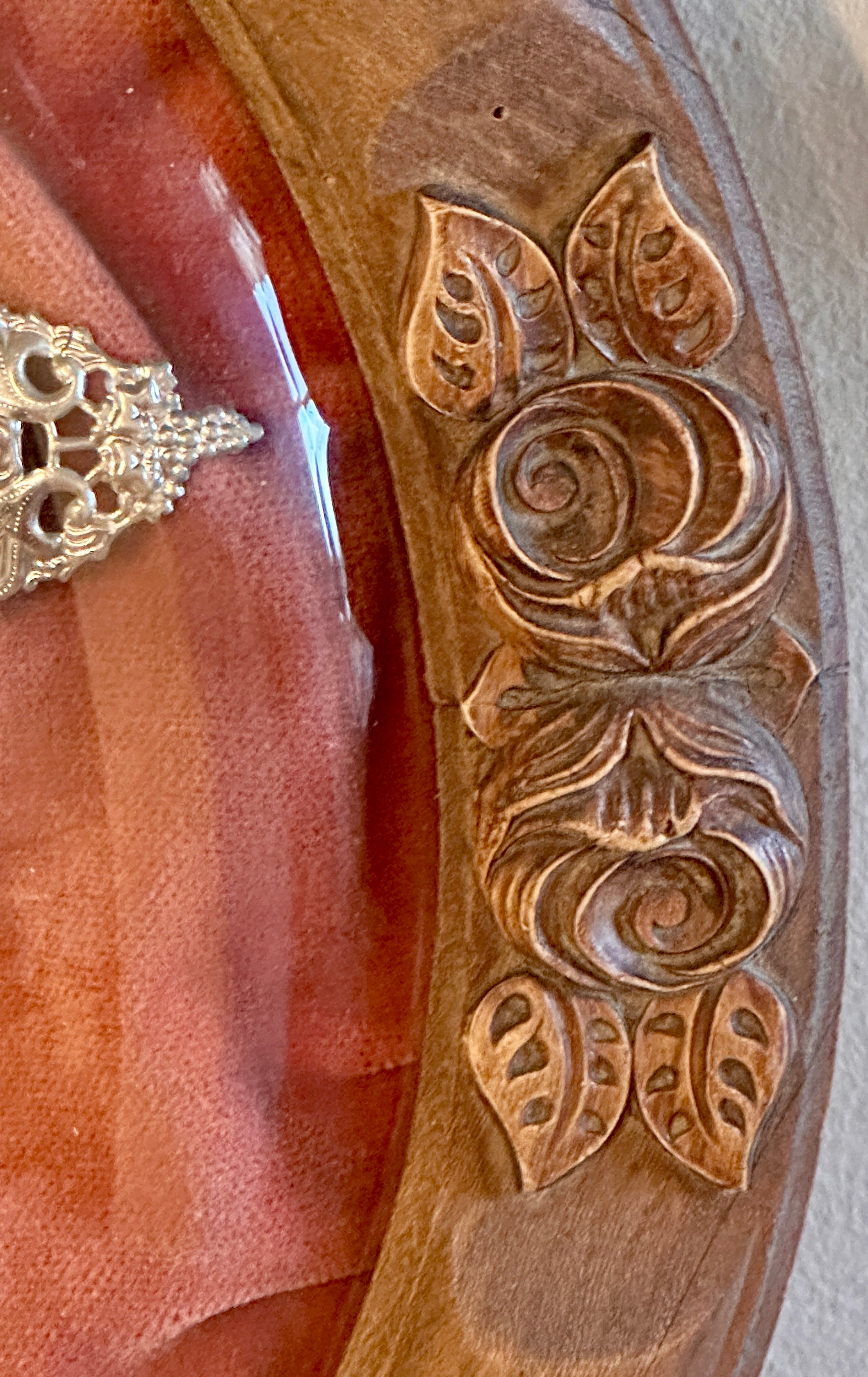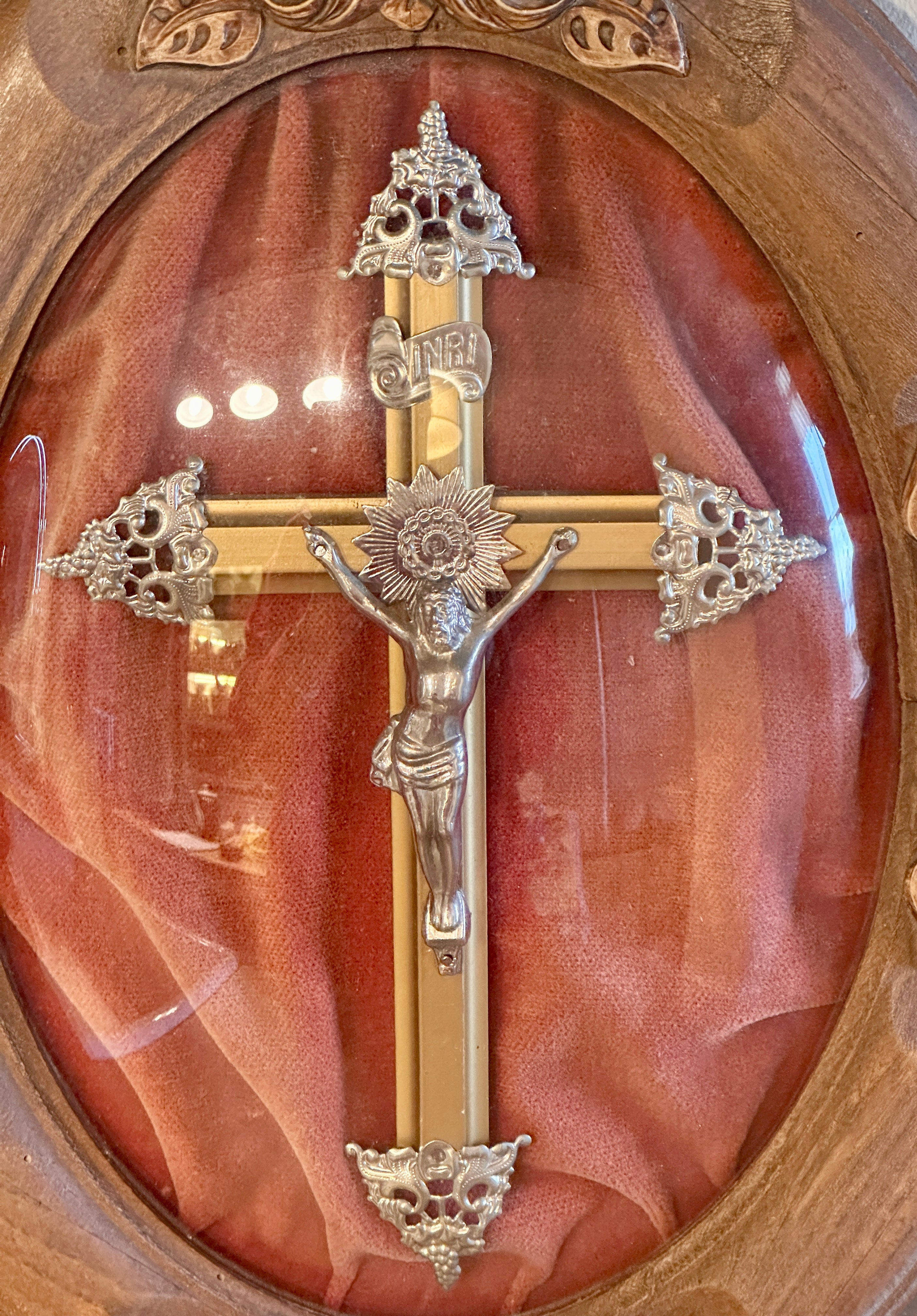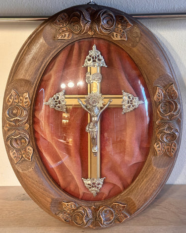 Zogenaamde 'Bolle Jezus' - ingekaderd kruisbeeld onder bol/gebombeerd glas - ovaal houten lijst - gevat in een fluwelen roze ondergrond