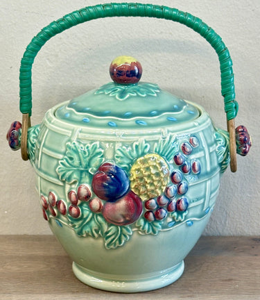 Biscuit jar with wicker/plastic handle - AJ Wilkingson / Royal Staffordshire Pottery - made in the shape of a fruit basket - model no. 937 (design by Clarice Cliff?).