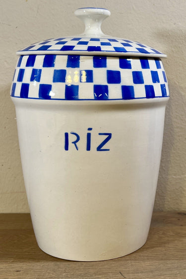 Storage jar - large model - Nimy - in cream with blue lettering RIZ and block decoration on the front top.