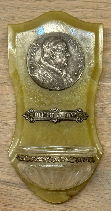 Holy water font - green plastic with a metal plate/image of Pope Pius XI Pont Max Ricordo di Roma - glass bowl.