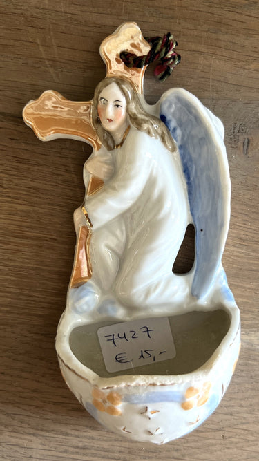 Holy water font / Holy water font - porcelain - in the shape of a cross carried by an angel