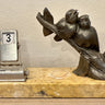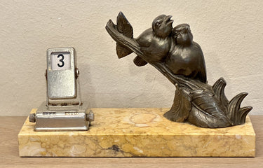 Desk calendar on marble base with spelt statue - 2 birds on a branch - chrome calendar shows month and day in French.