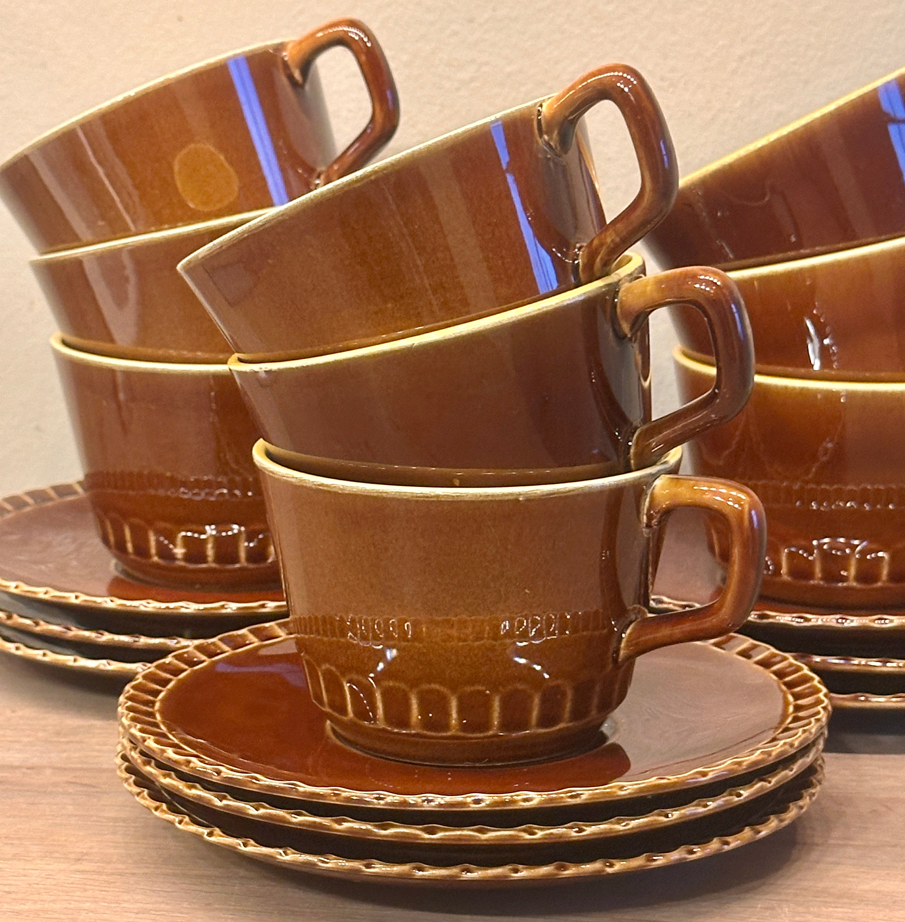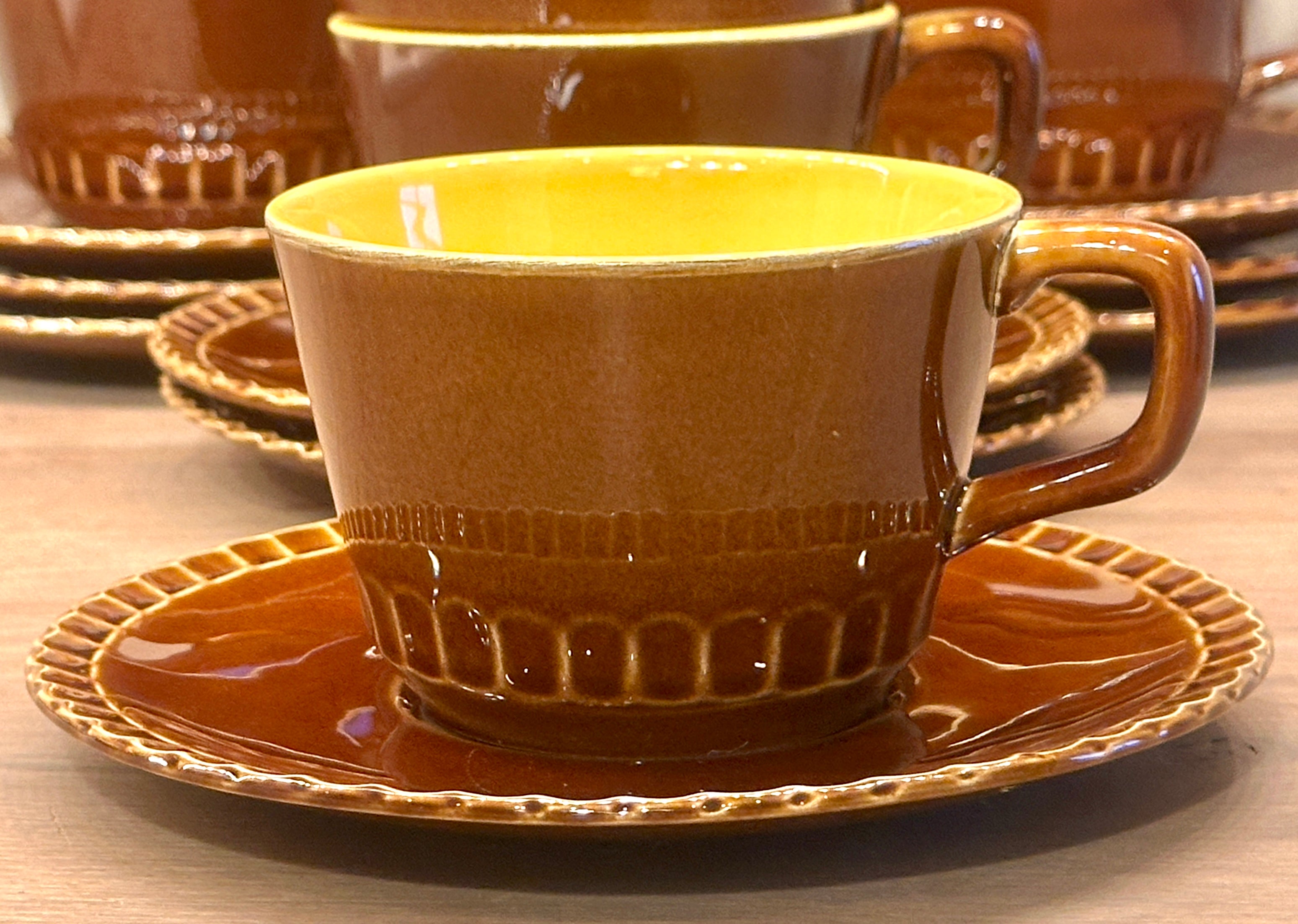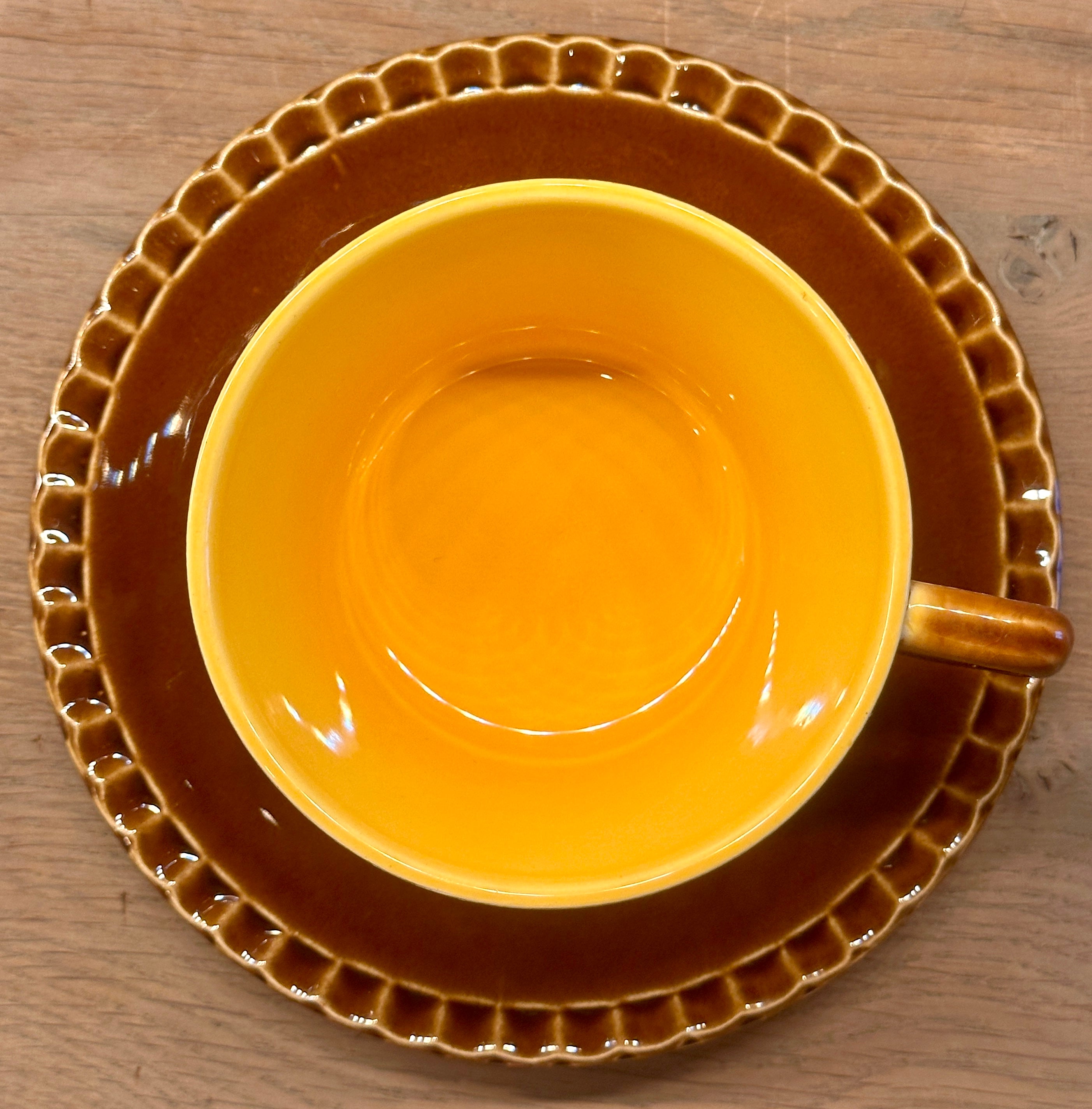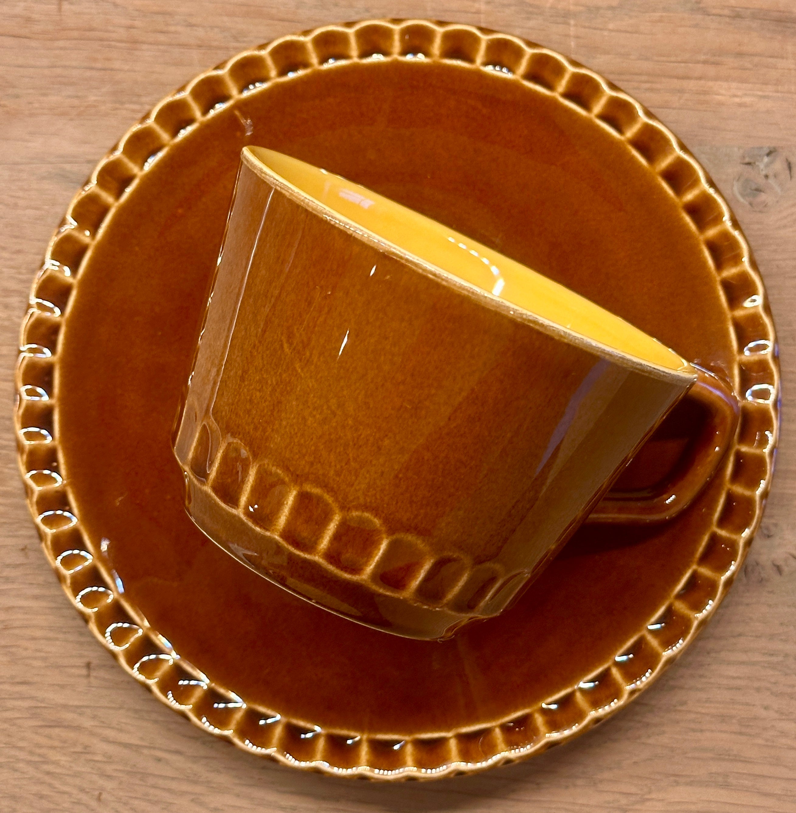 Kop en schotel - Digoin Sarreguemines France - uitgevoerd in bruin met een gele binnenzijde en reliëfrand