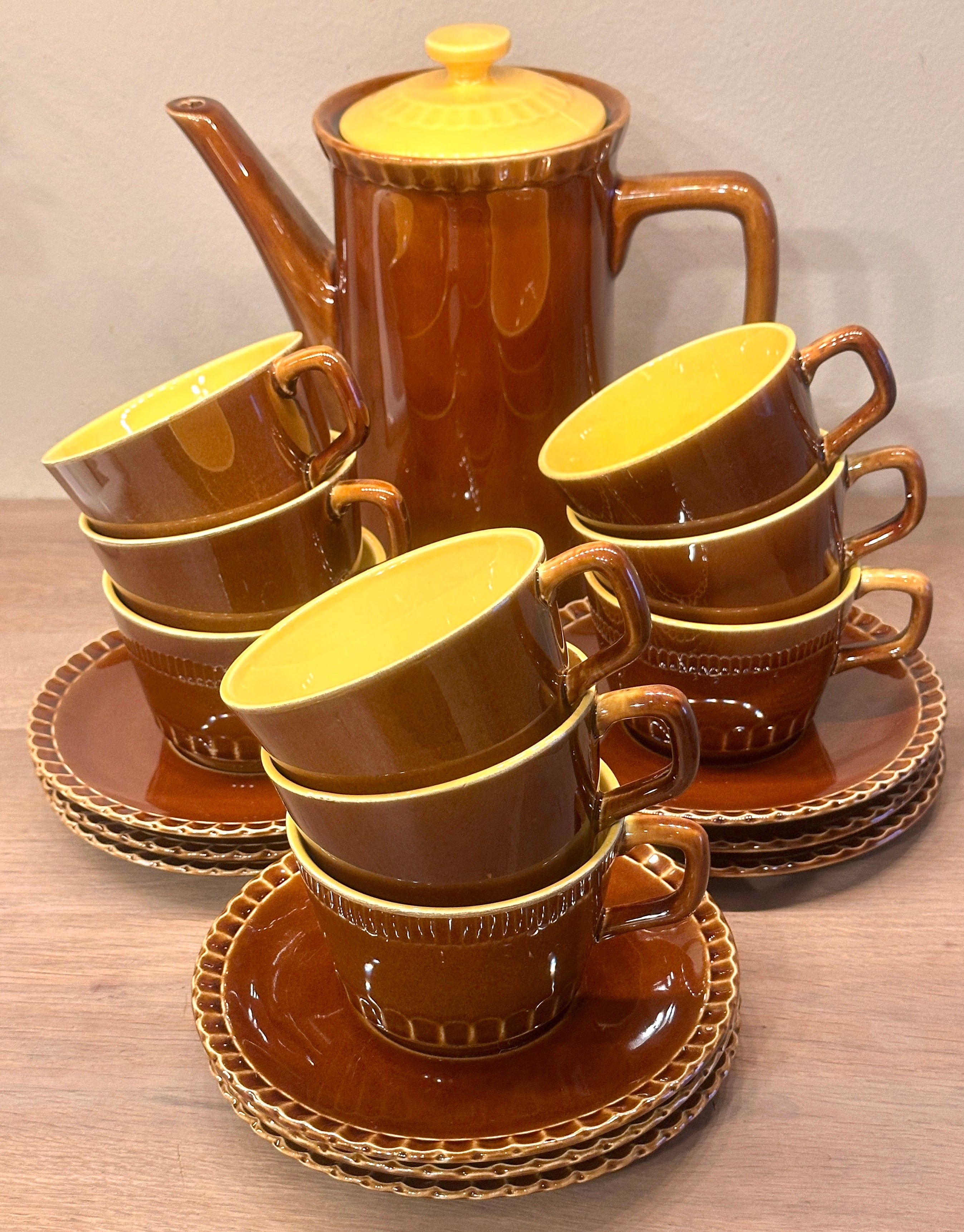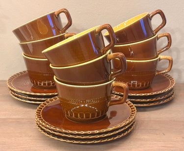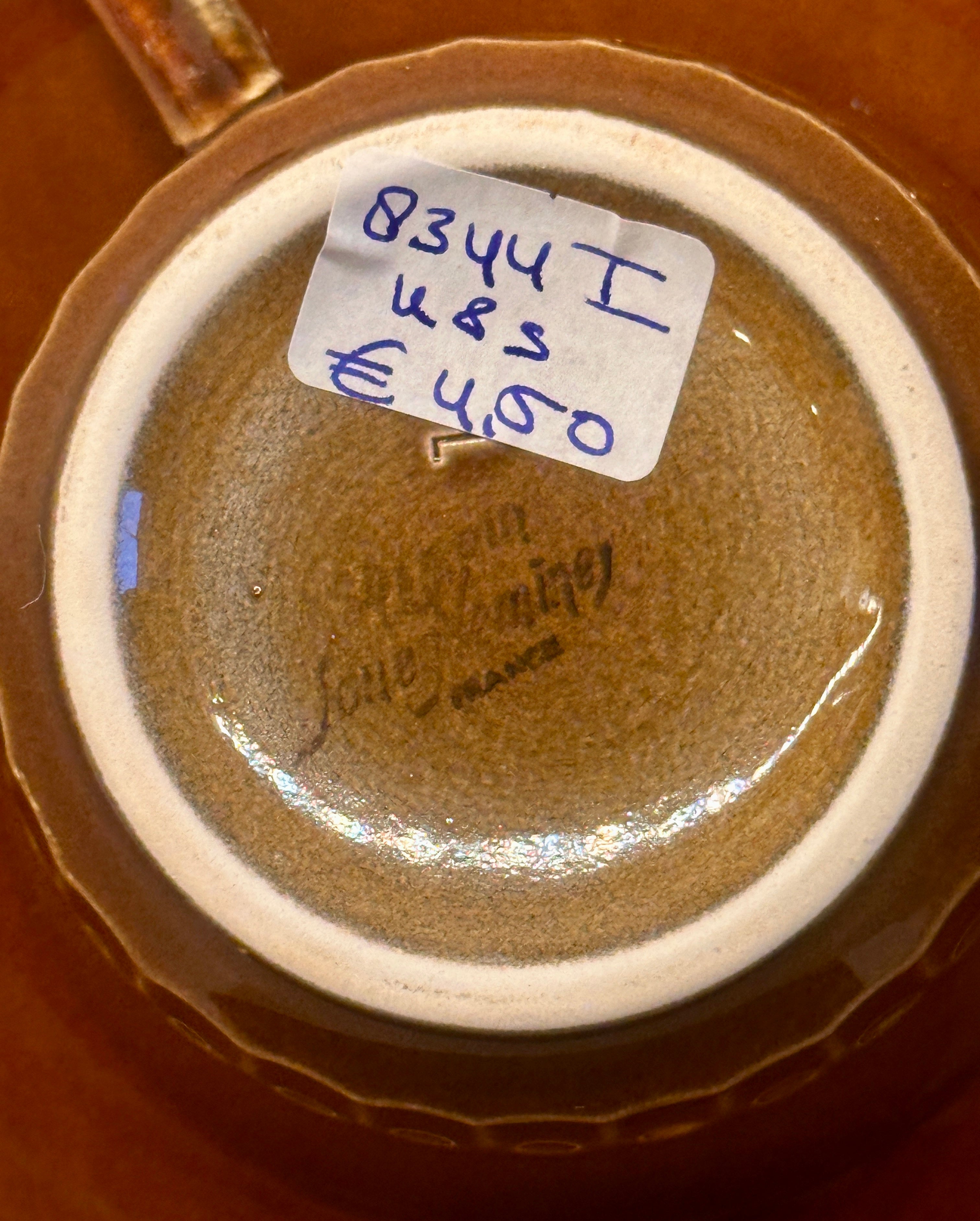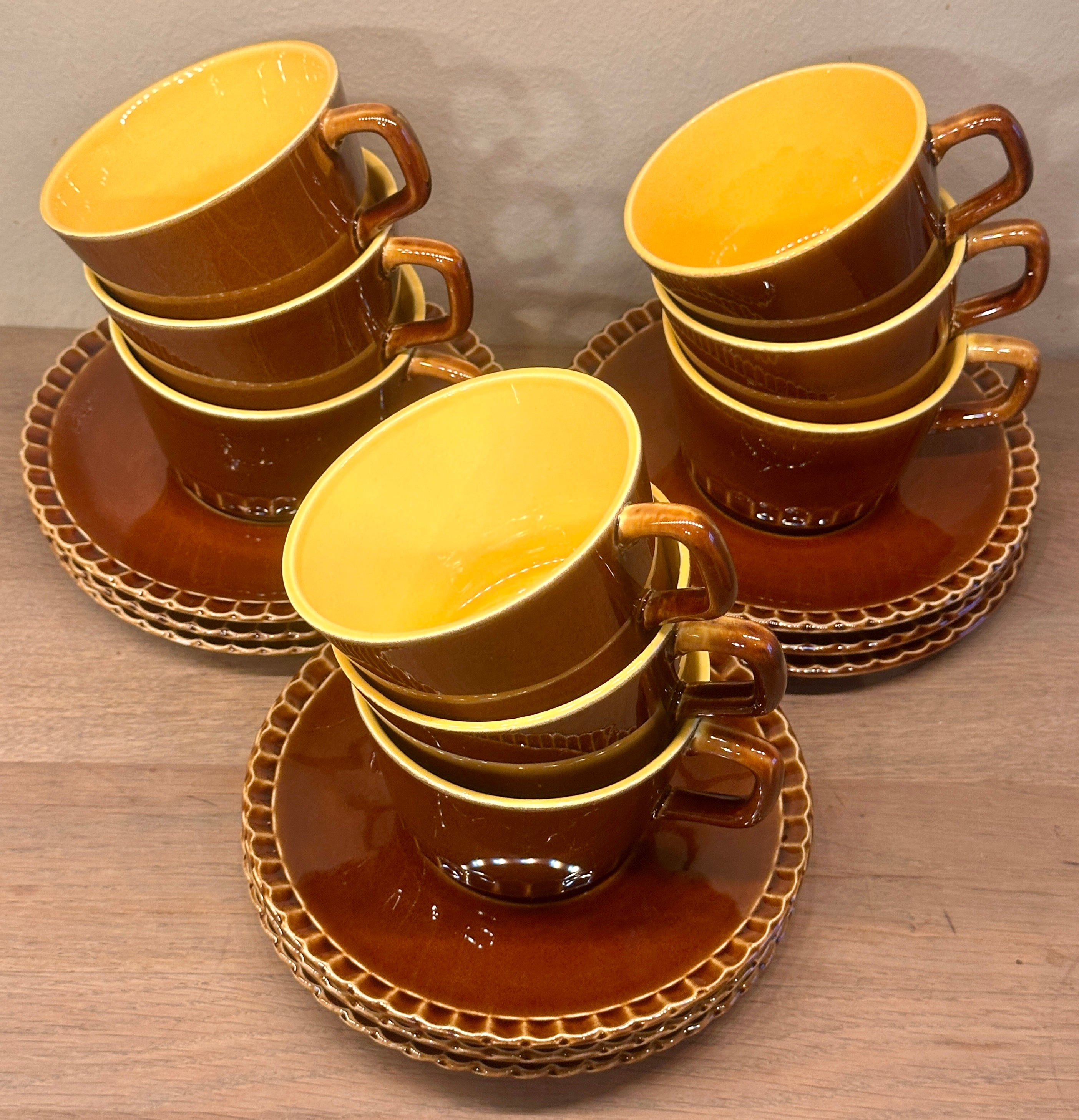 Kop en schotel - Digoin Sarreguemines France - uitgevoerd in bruin met een gele binnenzijde en reliëfrand