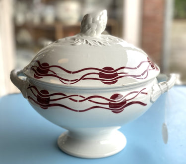 Terrine - on foot - Badonviller - BALLOON decor - burgundy red spray decor - beautiful lid knob of an artichoke.