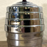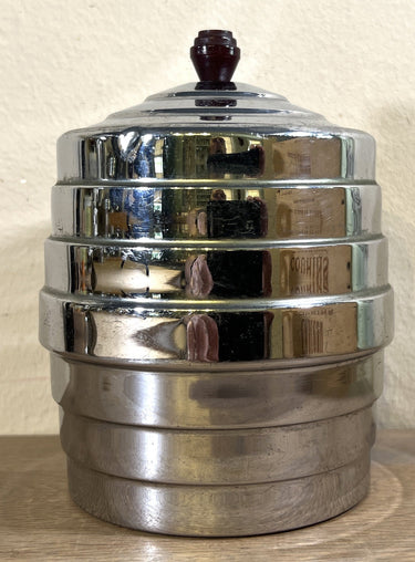 Storage jar made of chrome with brown bakelite lid knob - loose aluminium inner part - probably for storing tea - Art Deco - marked 'Best Chromium Plate' - Made in England.