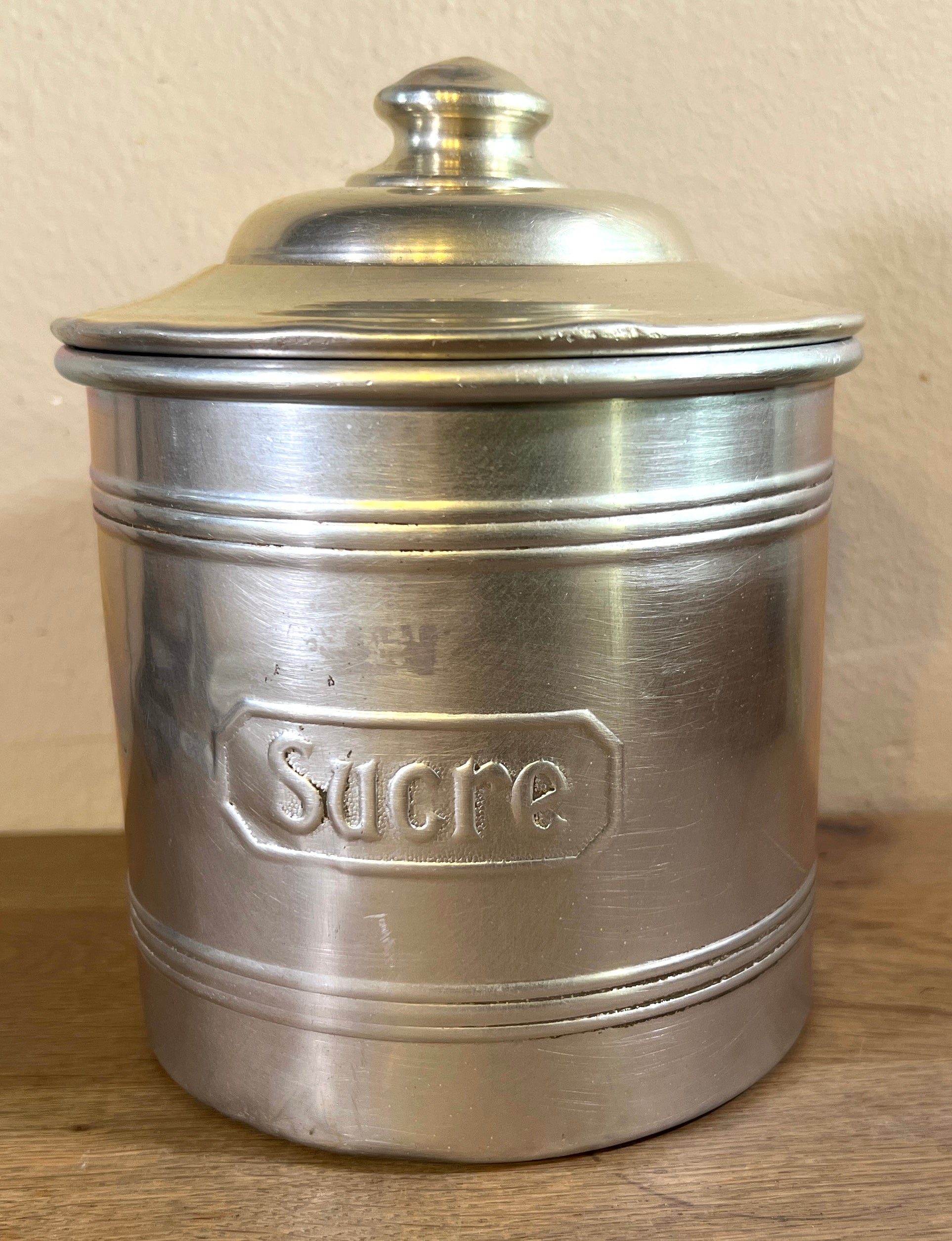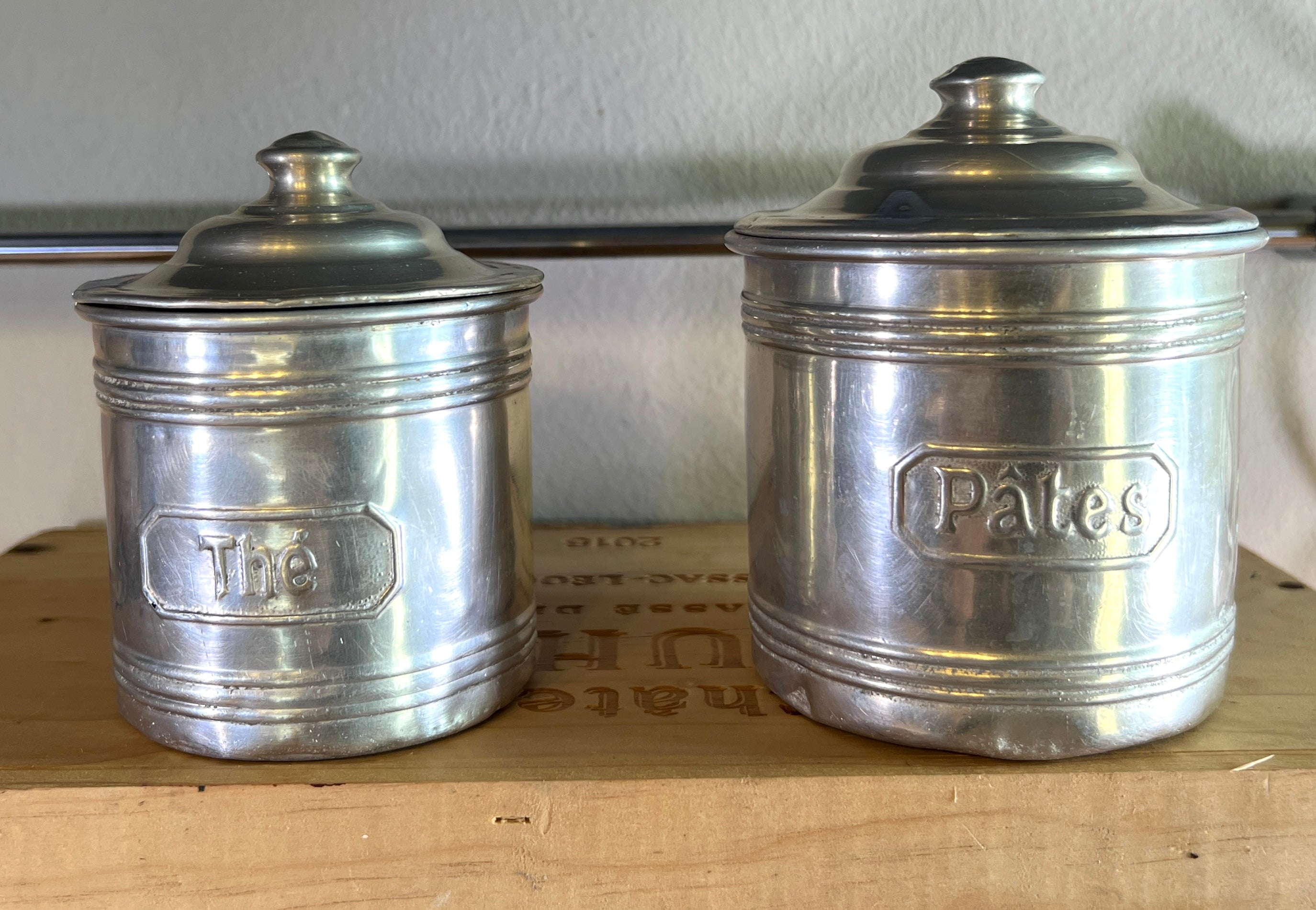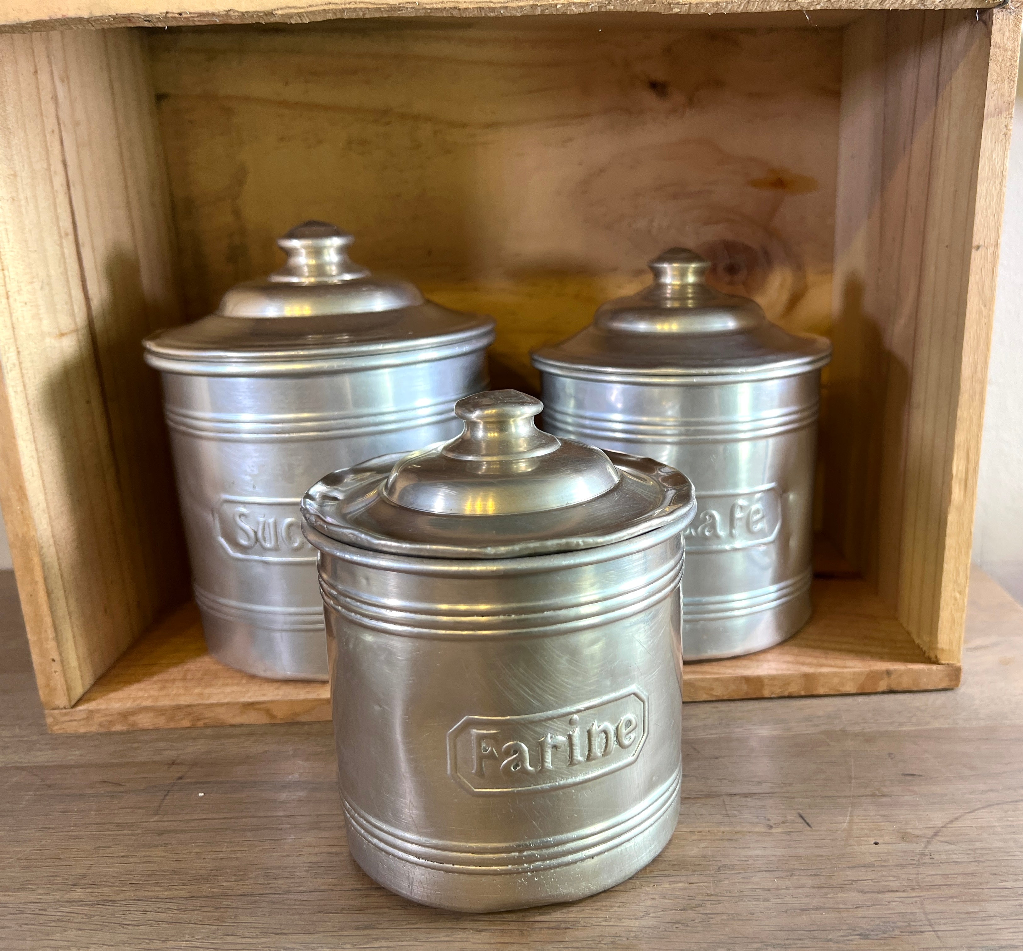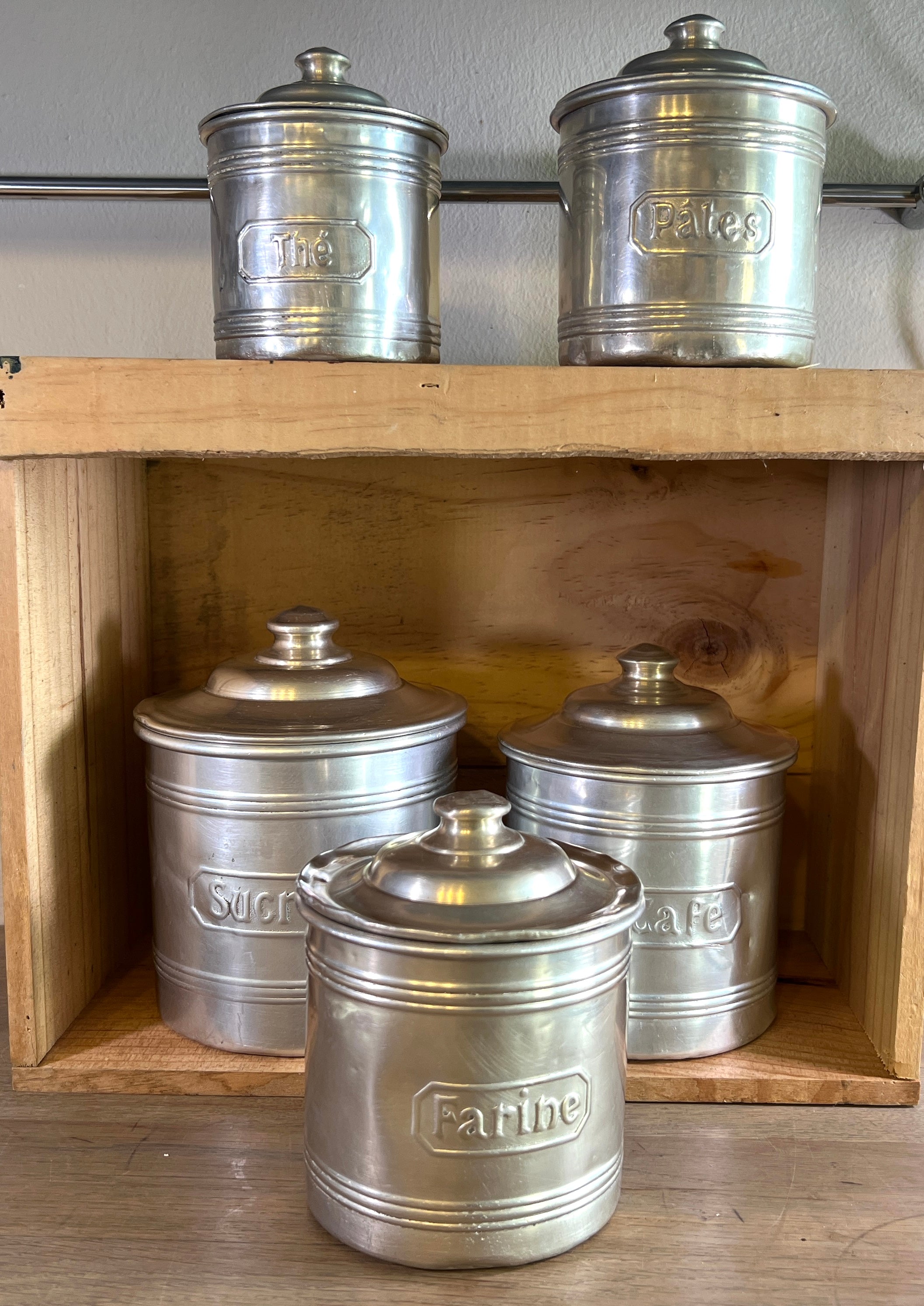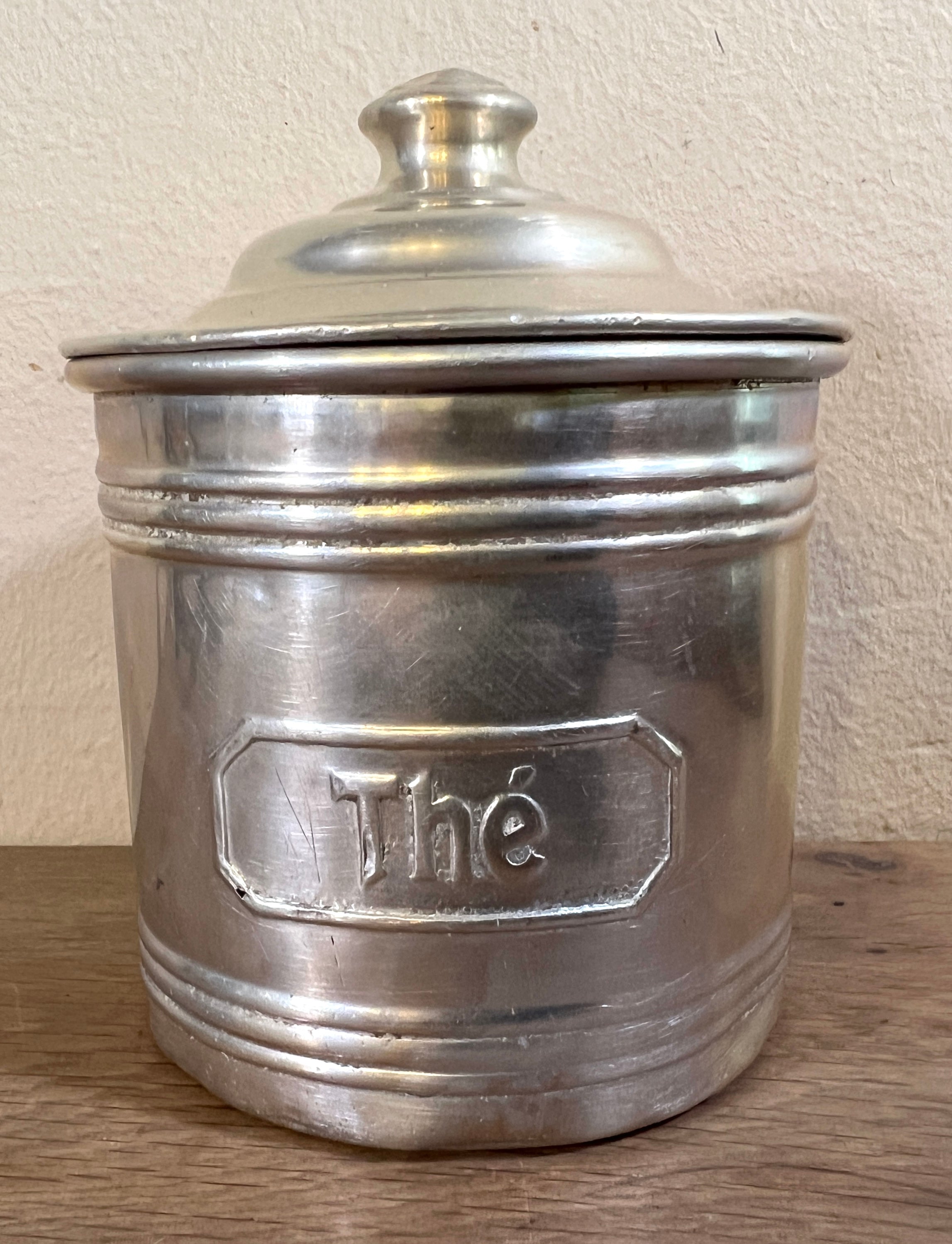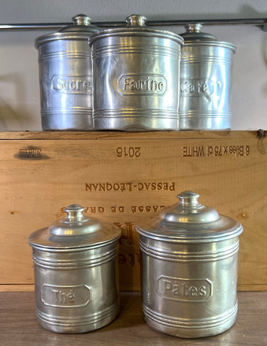 Storage jar set - 5-piece - made of aluminum with French print - Sucre (dia. 12 cm., height 11.5 cm.), Café (dia. 11.5 cm., height 11 cm.), Farine (dia. 10.5 cm., 9.5 cm.), Pates (dia. 9 cm, height 8.5 cm.) and Thé (dia. 8 cm., height 7.5 cm.) - Entire set in fair to good condition, used and with some dents here and there